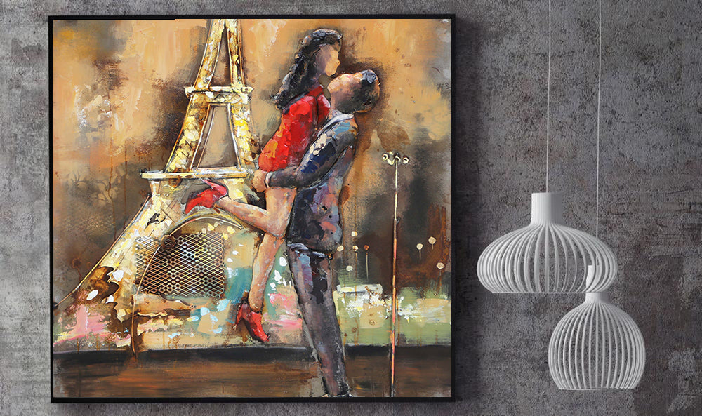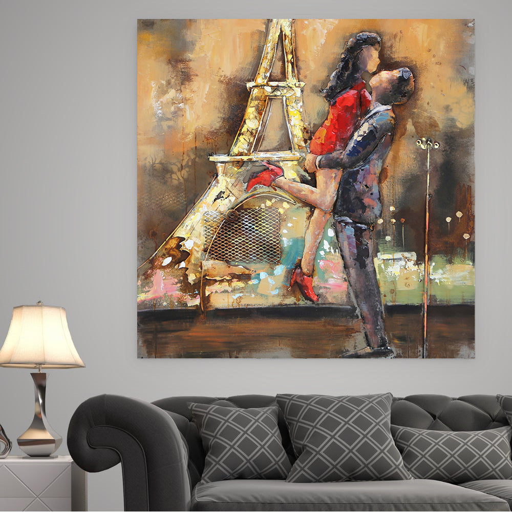 Lovers Couple Eiffel Tower Paris France Romance Love Metal & Wood 3D Wall Art Mixed Media Painting