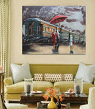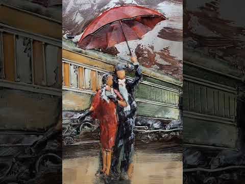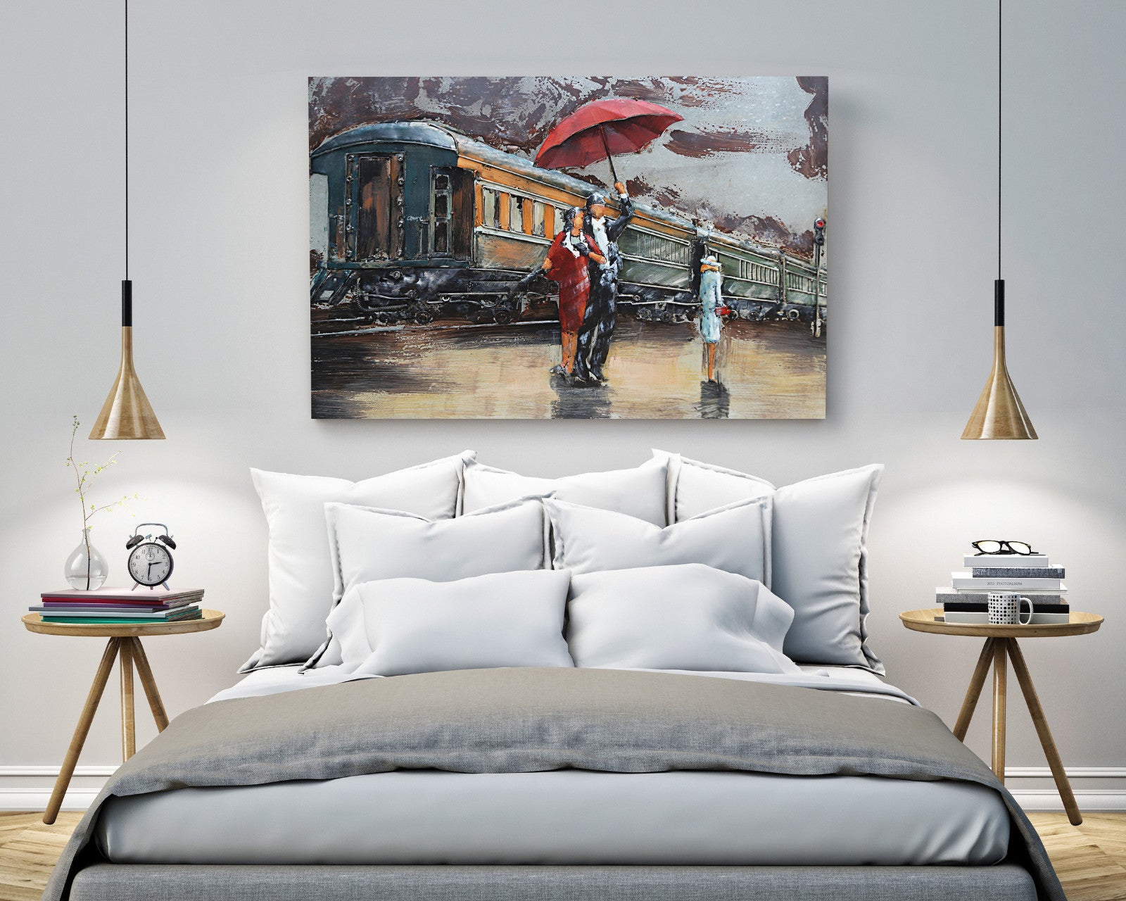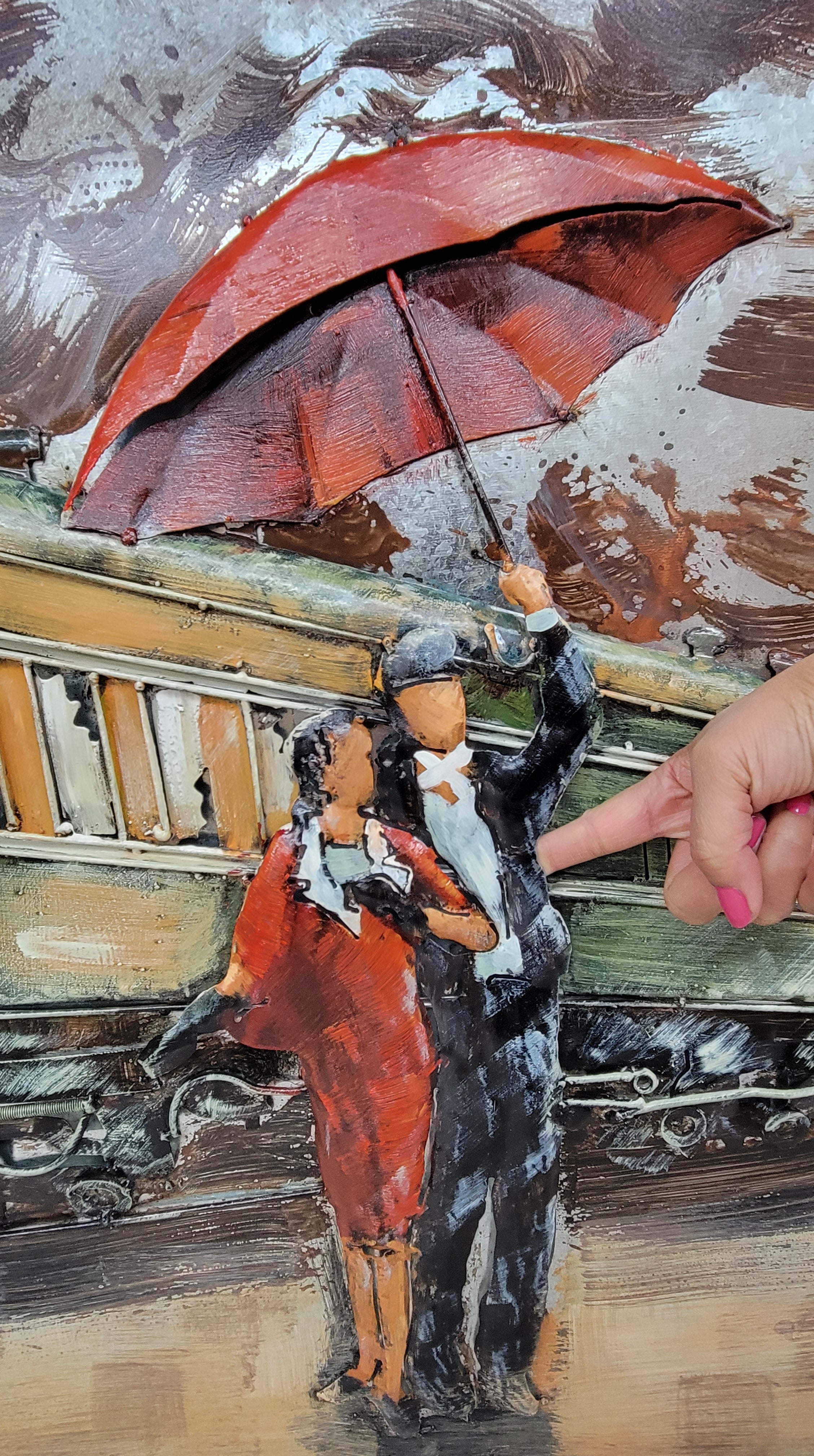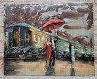 Romantic Couple Waiting for Train in the Rain Painted Metal 3D Wall Art