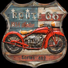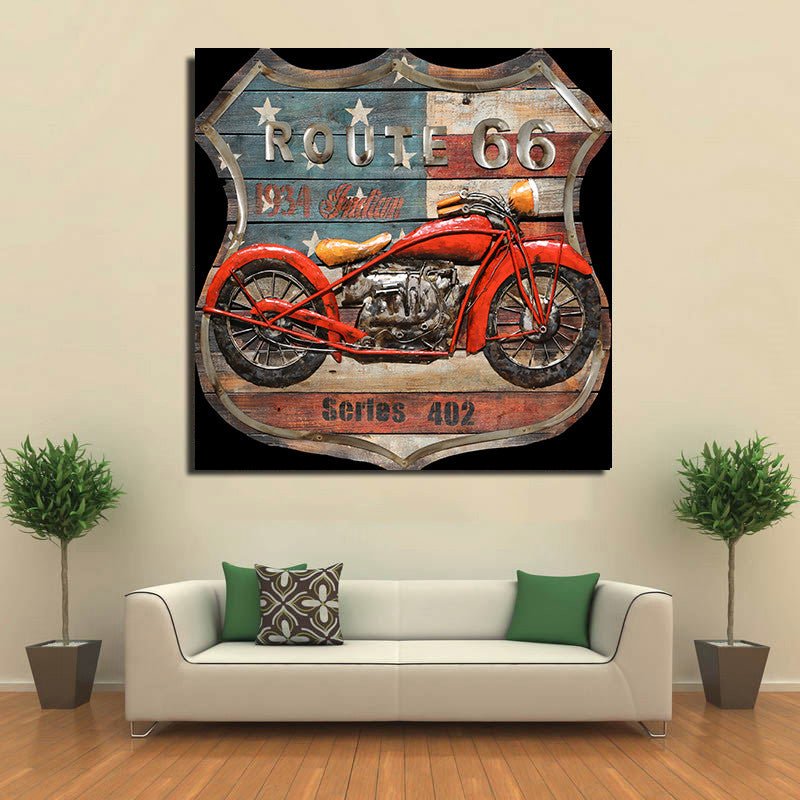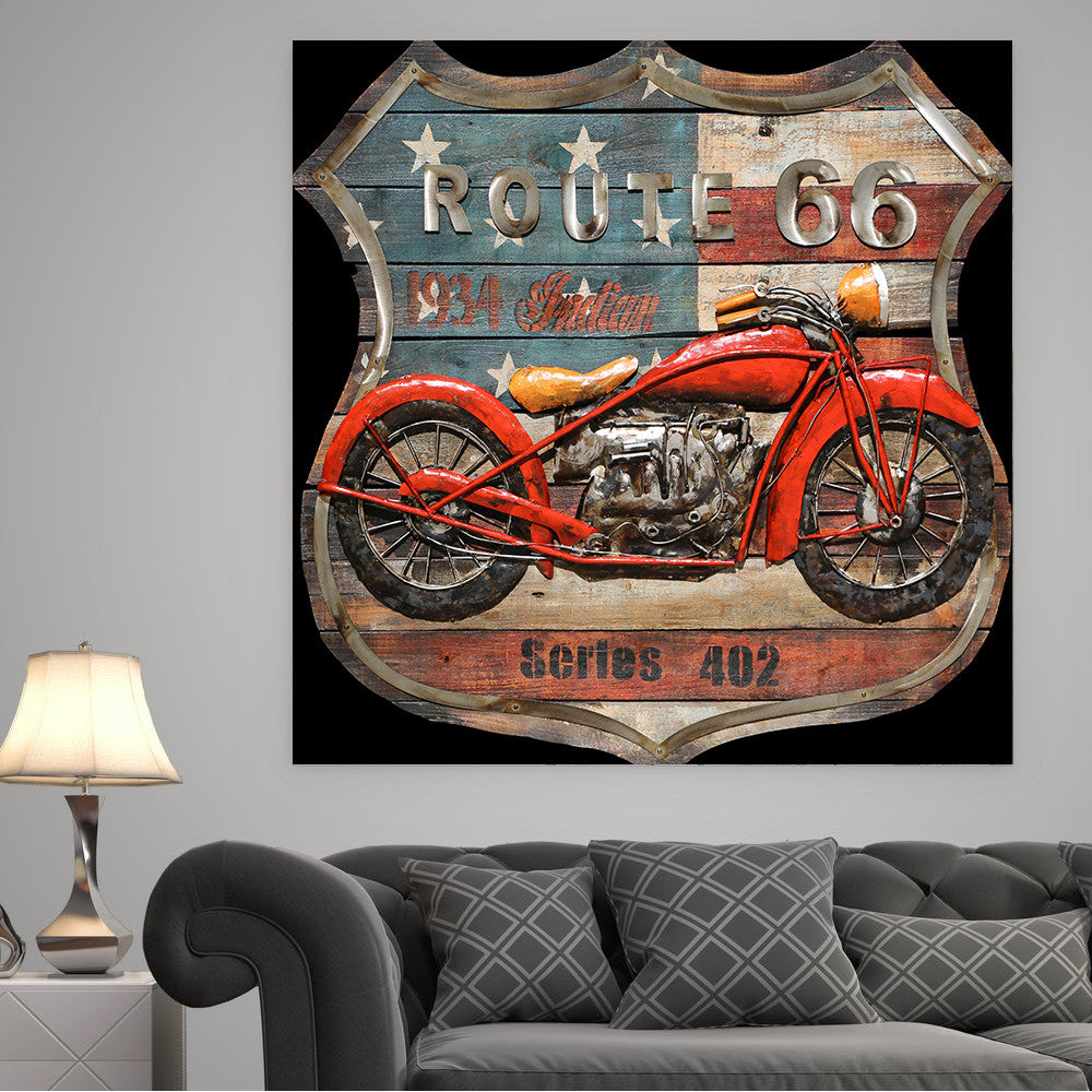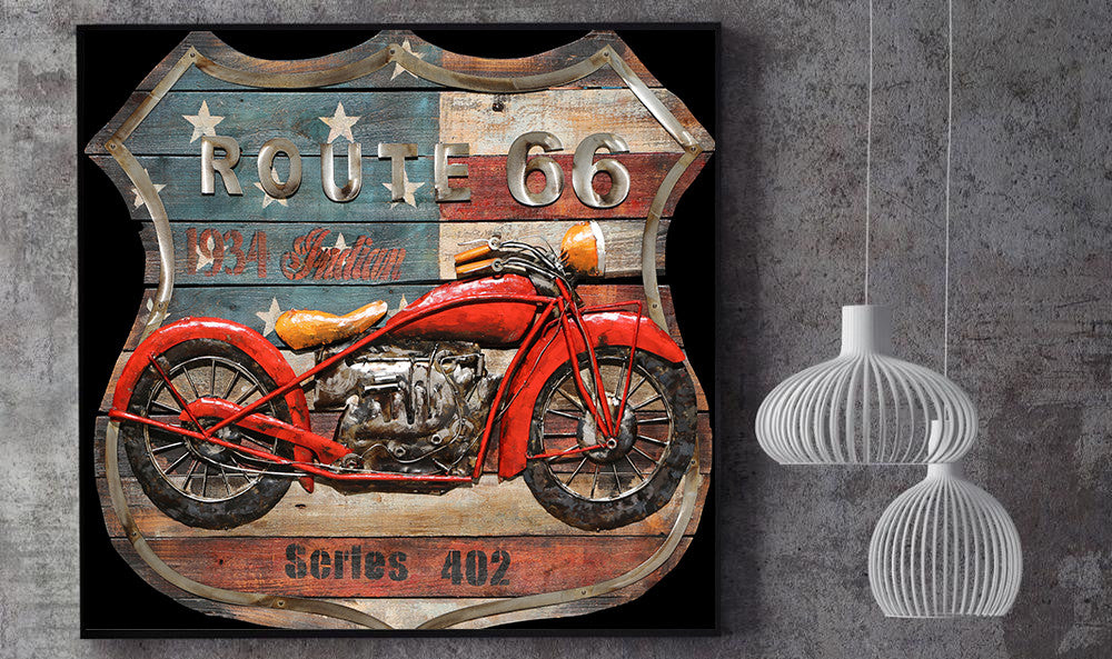 Route 66 American Flag & Red Motorcycle Biker Americana Wall Art 3D Metal Decor