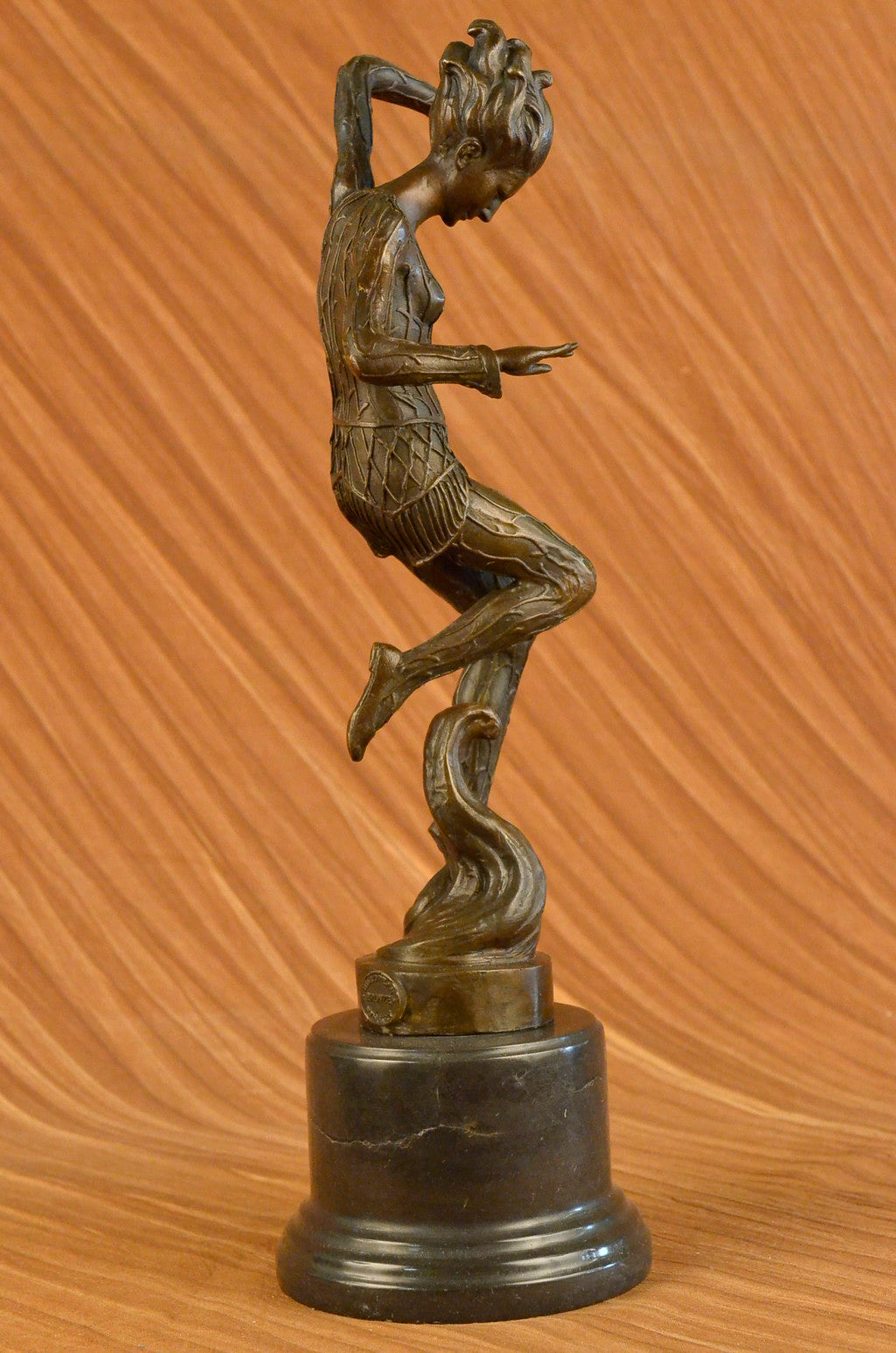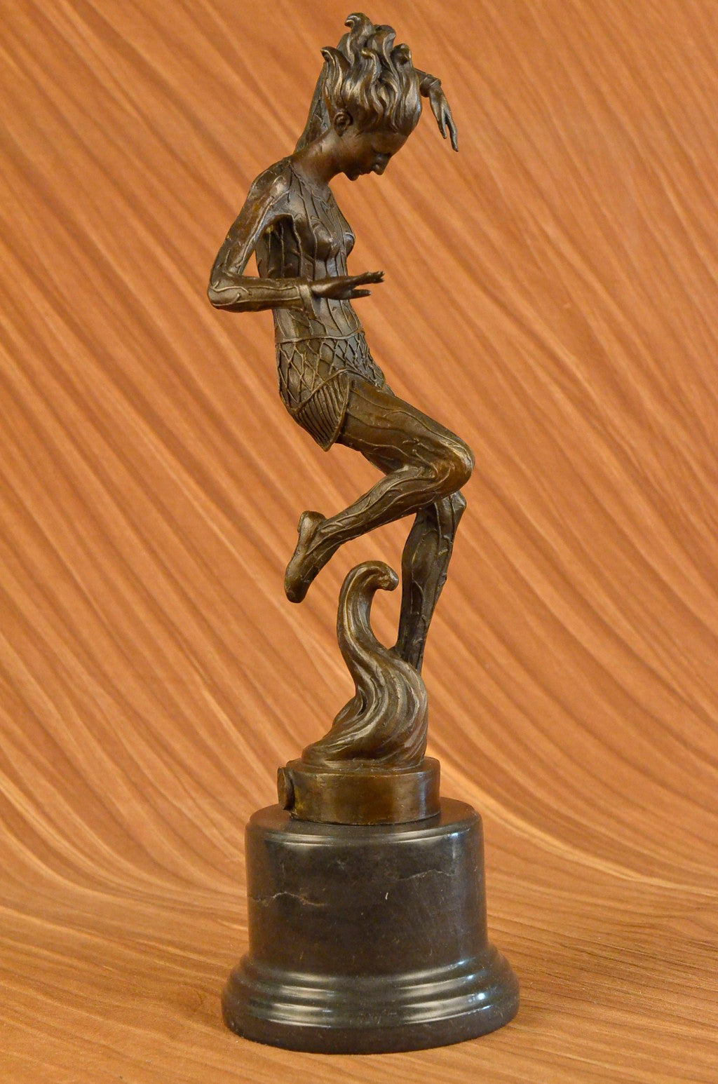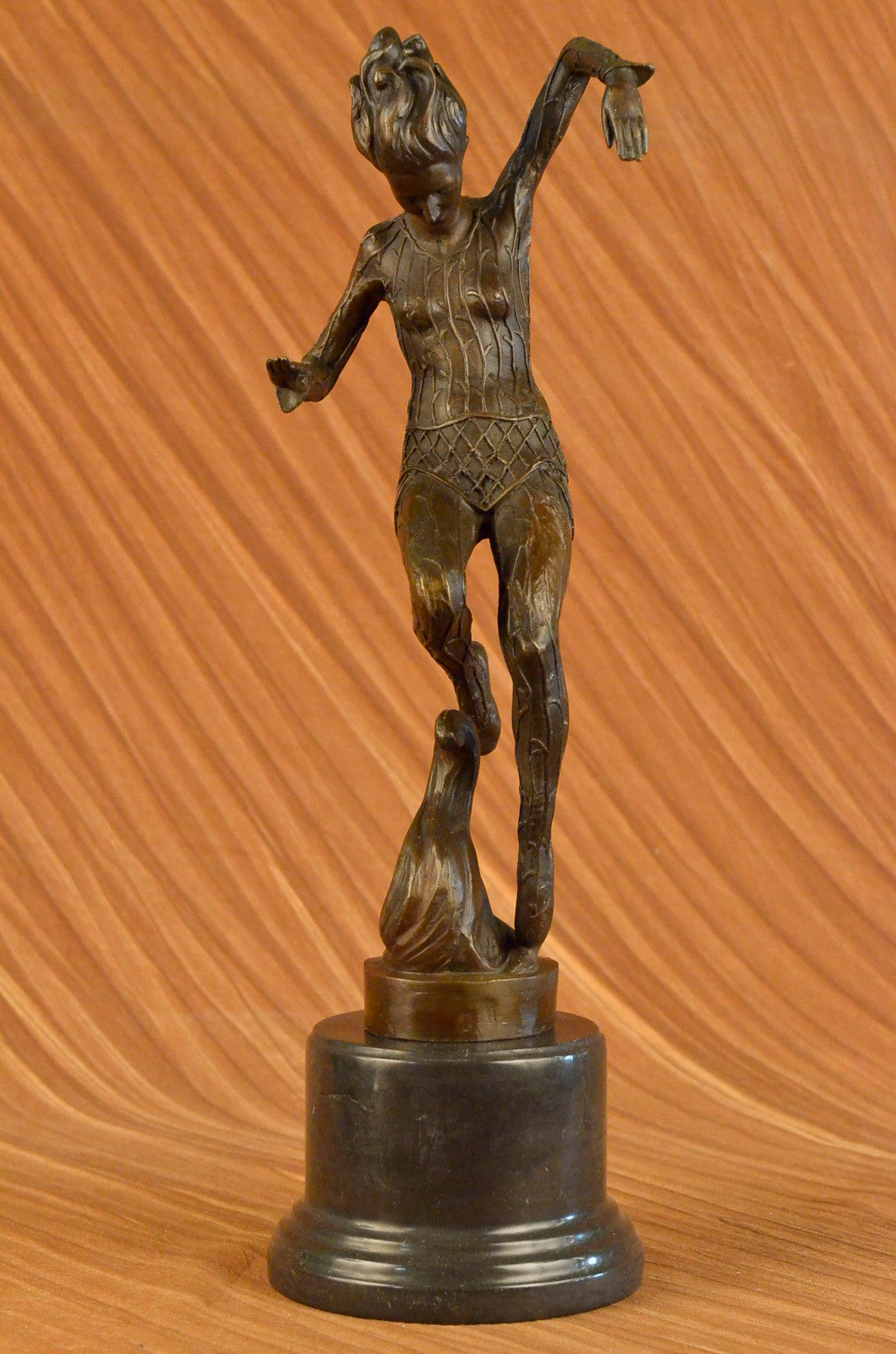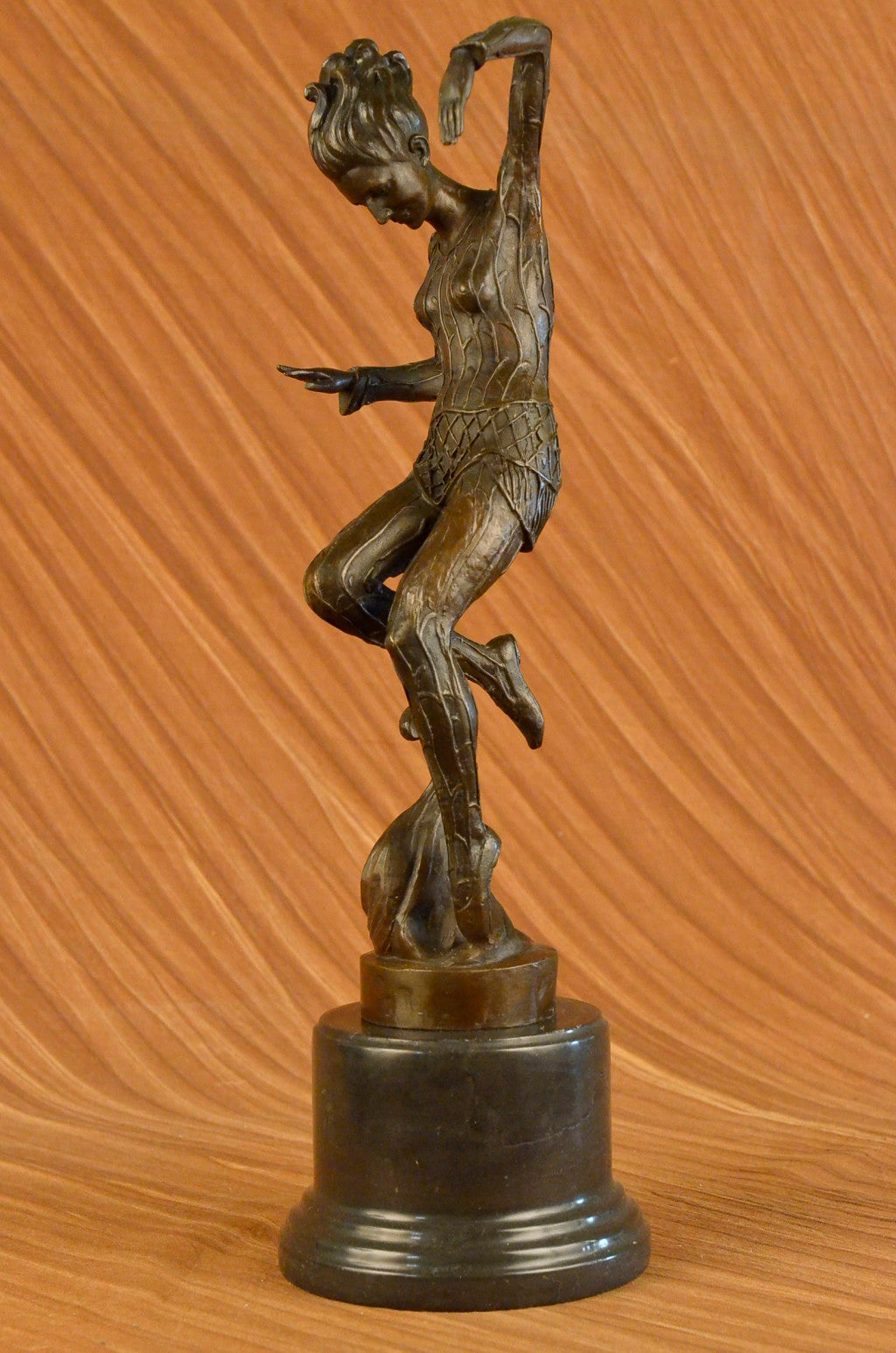 A professional Dancer puts on a show. Well trained in the art that she loves, she shows off her agility, balance and flexibility. She elevates her long leg far behind her. Her chest pushes out and her head tips up to the sky, basking in the glory of being center stage. Her spine curves, touching her back to her tutu. Her tutu spreads around her hips like a halo. Every movement is deliberate and structured, from the tips of her toes to the tips of her fingers. 100% bronze, this handmade brown patina sculpture was cast using the "Lost Wax Method" and mounted on a black marble base and is signed by Aldo Vitaleh.Bronze Dimensions with Marble Base:Height 19" x Width 8"