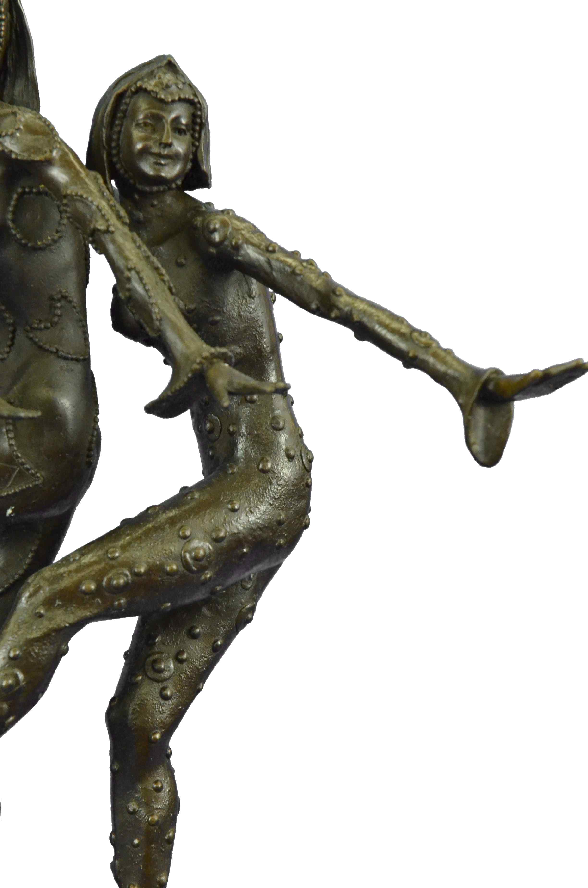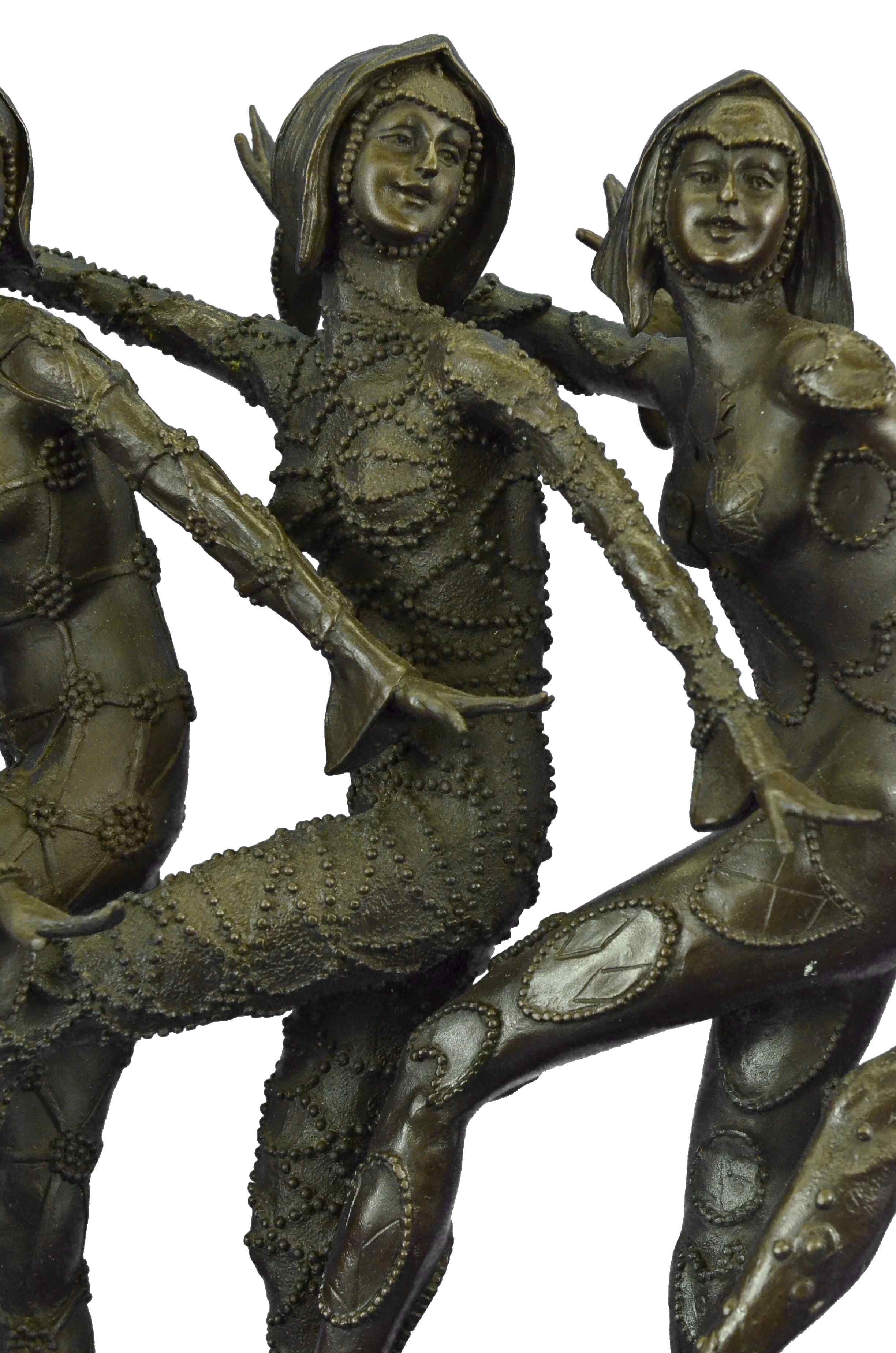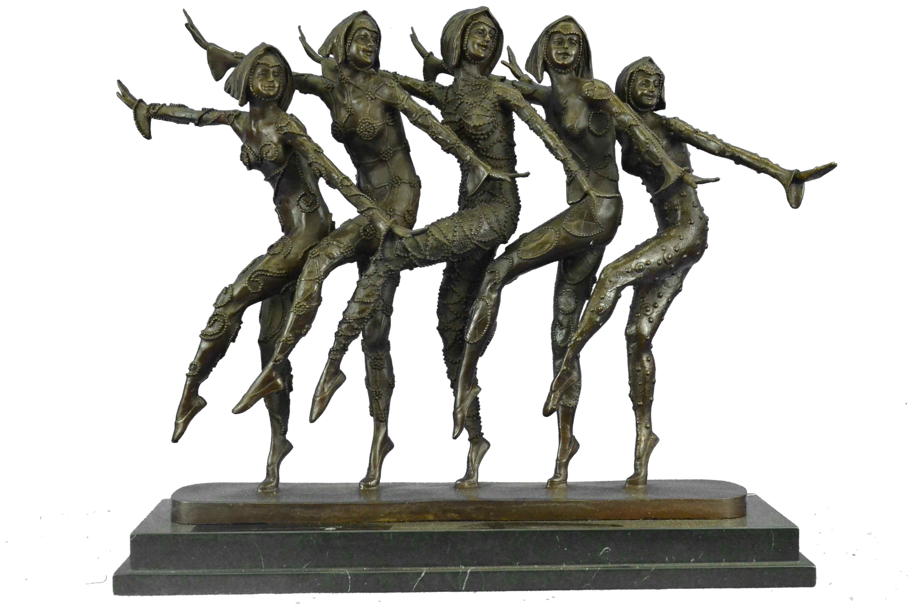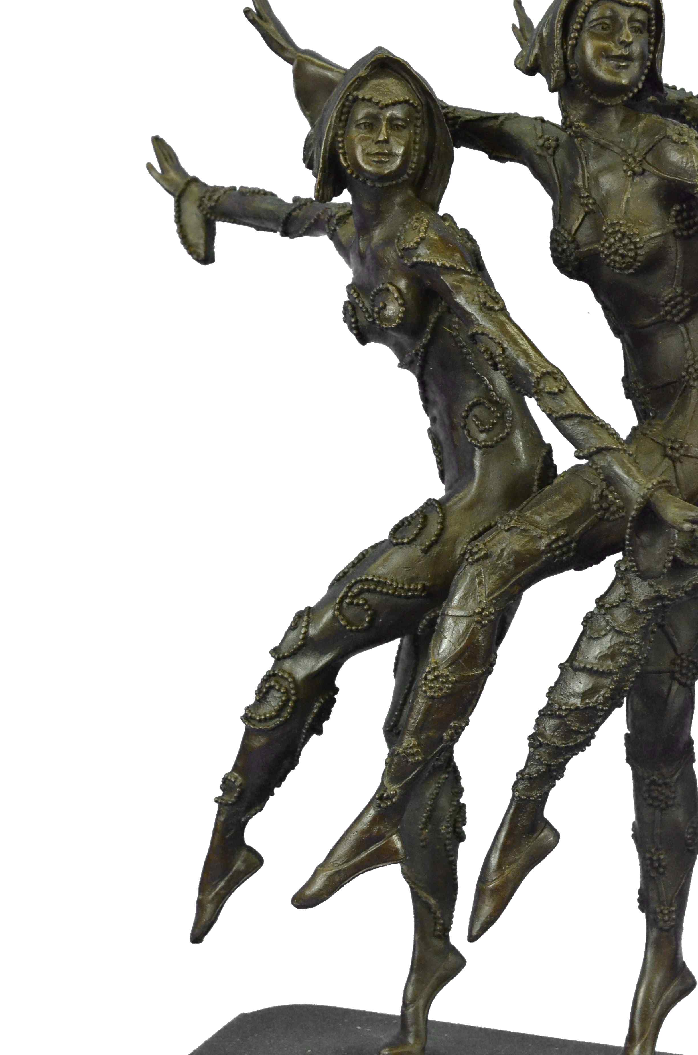 This amazing piece will go lovely in any home. These woman stand on one leg, since balancing their weight seems to come easy to them as they spreads their arms out like wings, they bend their left leg in and put on a show for the audience. These Lady Dancers wear a detail outfits in a beautiful variation, wearing also nice caps - an absolute worth seeing exhibit. The result is a high impression bronze dancing sculpture. 100% bronze and handmade, brown patina sculpture was cast using the " Lost-Wax Method" and its mounted on a black and fire red marble base signed by D.H. Chiparus.Original or Reproduction: Reproduction
