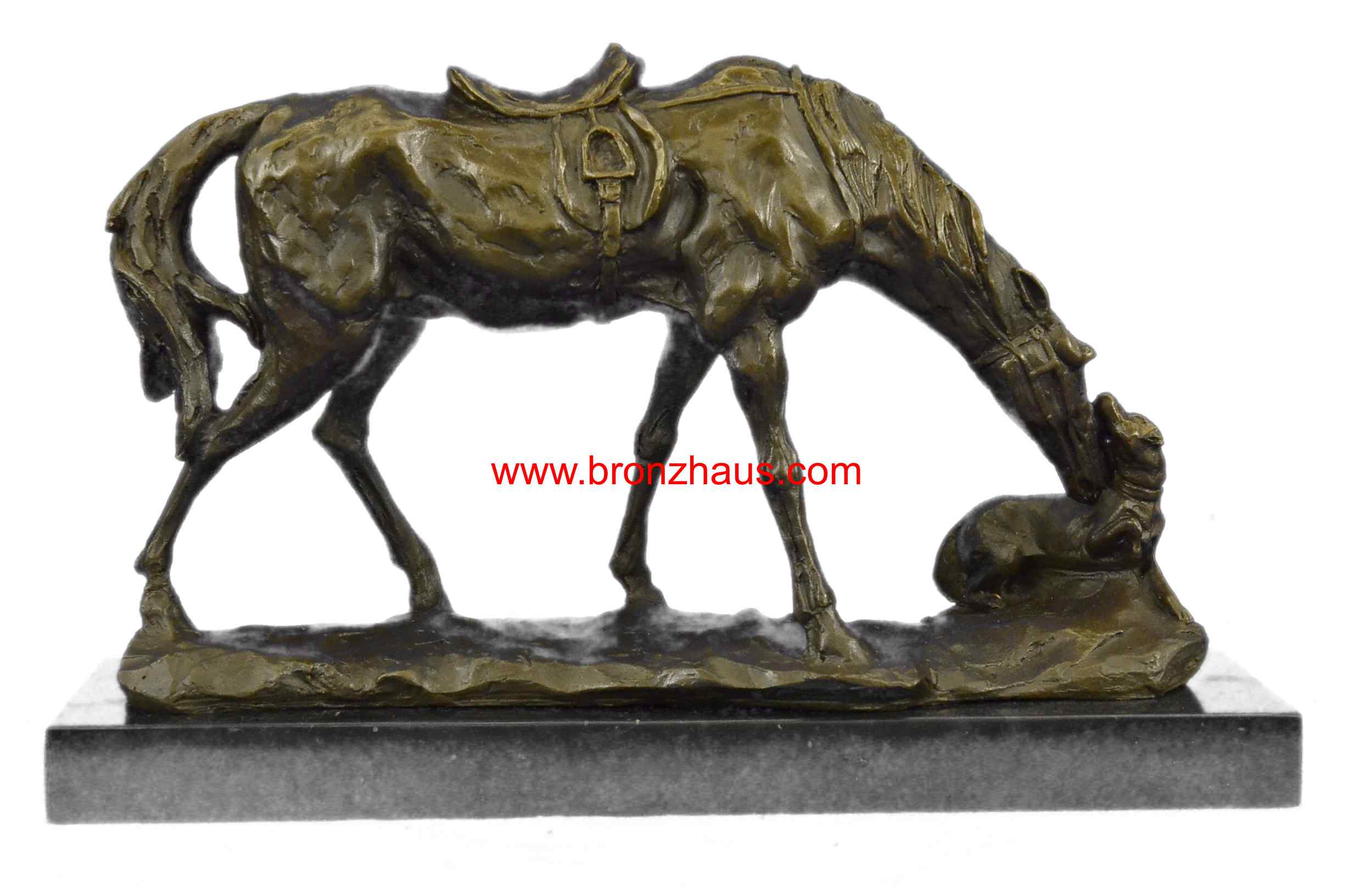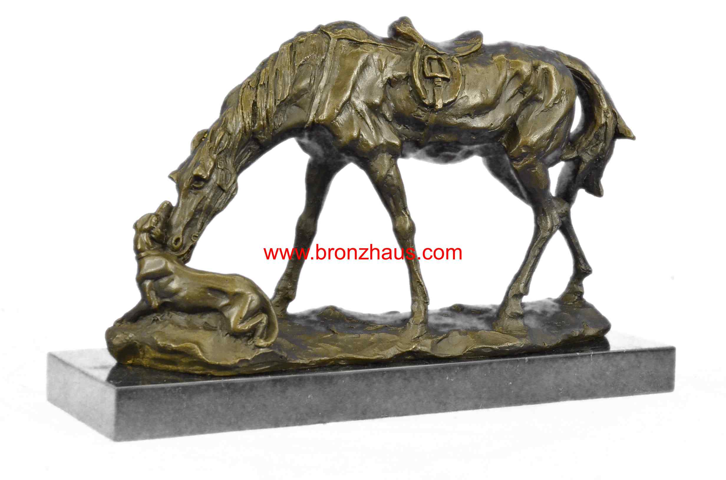 This bronze sculpture captures a typical day seen on ranch or farm. We witness the beginning of a friendship, that forgets the borders of species and embraces curiosity. The saddled horse inquisitively lowers its head to come eye to eye with the herding dog who insecurely returns it gesture assuming a position of submission to its much larger acquaintance. The artist`s craftsmanship skills come through in the powered muscles of the horse and the details of the horses mane. There is a general realness of the language and communication being relayed by both these species. The sculpture was cast using the archaic methods of lost-wax techniques and finished with a brown patina stain. They are mounted upon a black marble base with the artist Pierre Jules Menes`s signature.Original or Reproduction: Reproduction