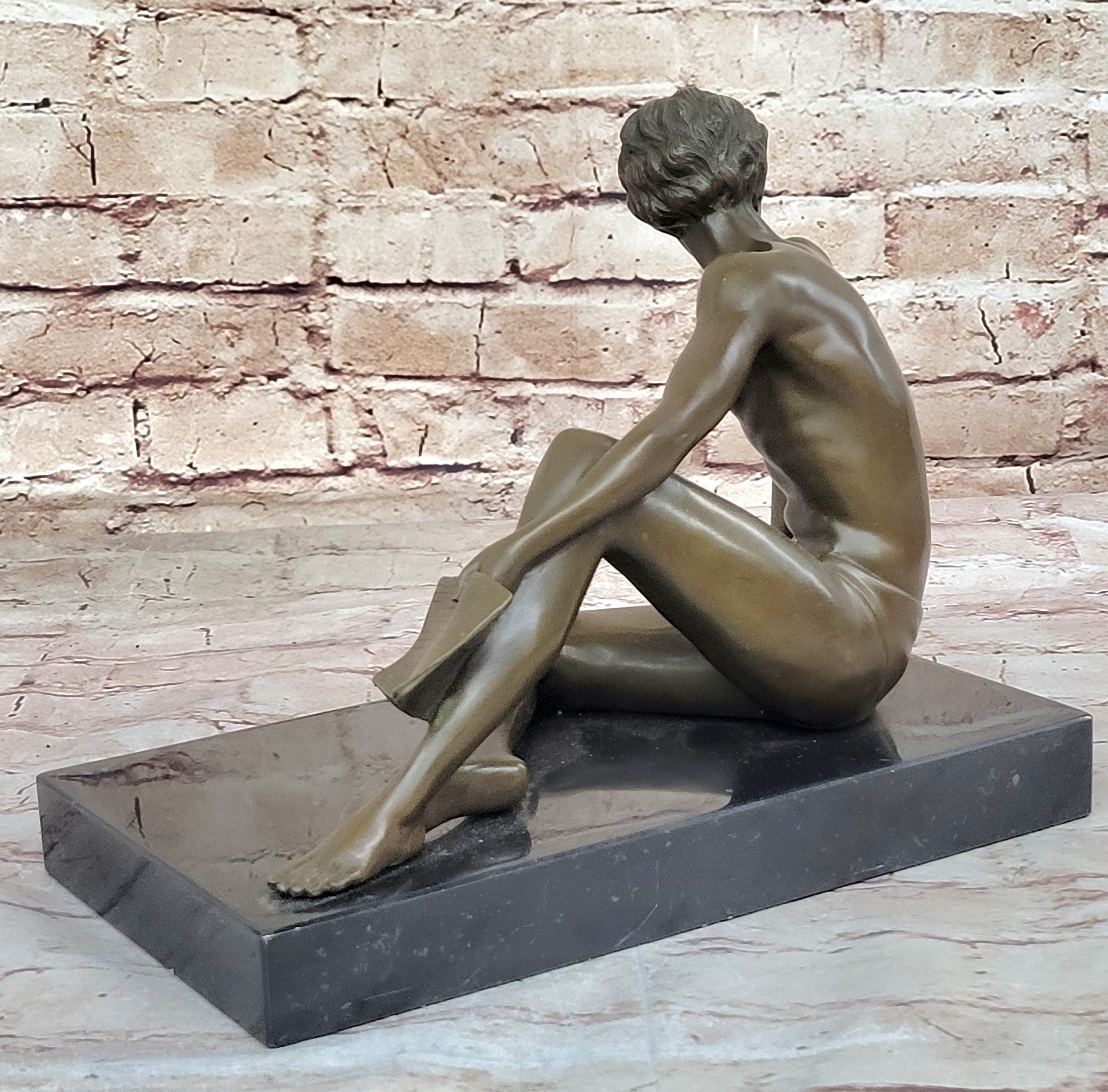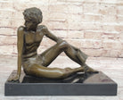 The F. Preiss sculpture "Boy on Beach Reading a Book" is an exquisite Art Deco bronze figurine that captures a serene moment of leisure. The handcrafted sculpture, made using the lost wax method, depicts a young boy engrossed in a book while enjoying the beach ambiance.