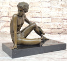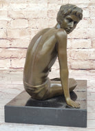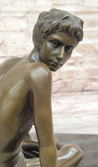 Mounted on a black marble base, the sculpture boasts a rich brown patina finish that adds depth and elegance to the artwork. The attention to detail in the boy's posture, the book he holds, and the beach setting creates a lifelike and immersive experience for the viewer.