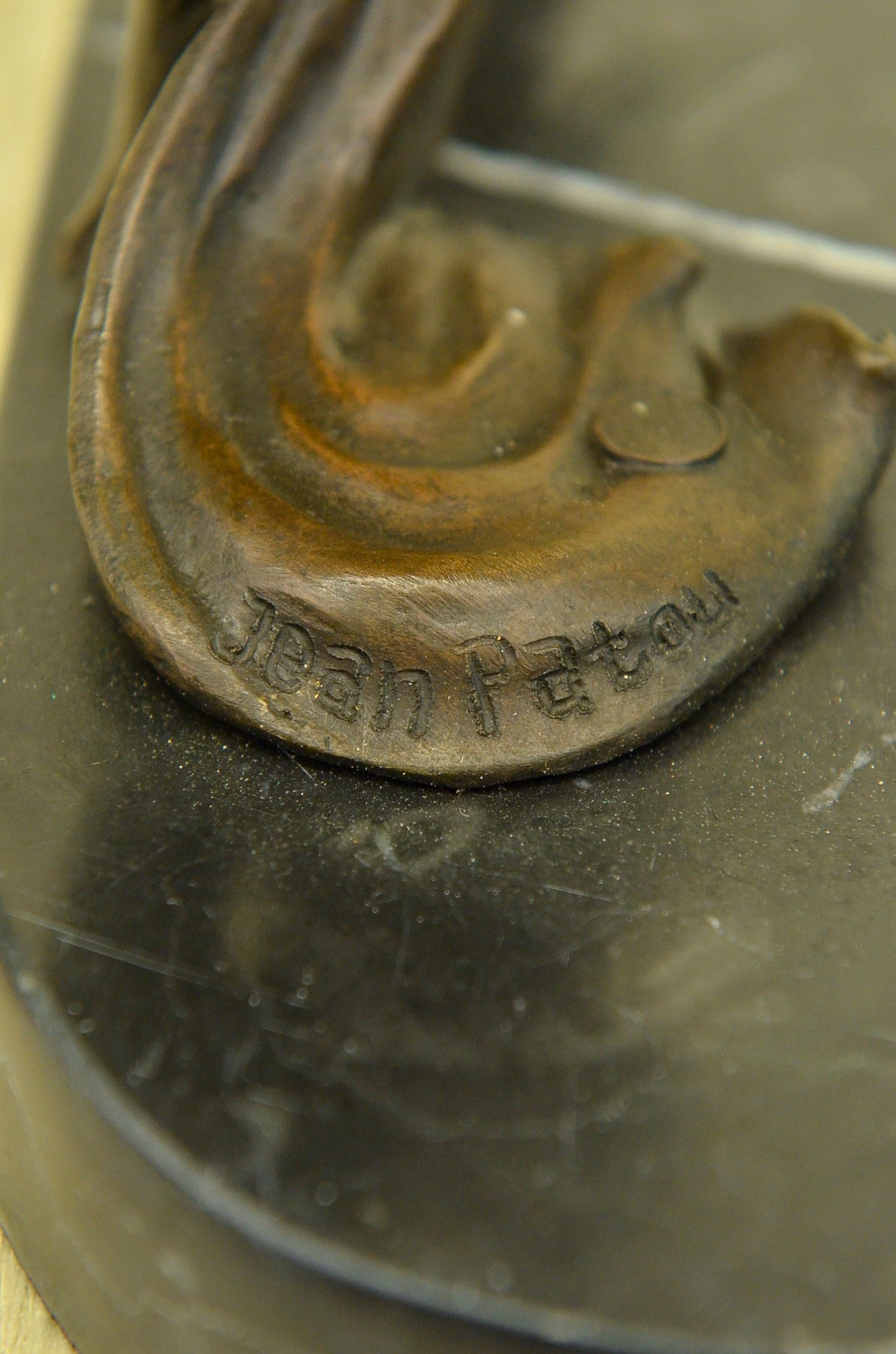 A graceful dancer puts on a show. She has a dancer`s long lean body and elegant moves. She kneels and opens her arms. Her head bows to the side as she lifts her arms.She is a skilled dancer and mines her body`s lines with every movement no matter how small. Her dress is long and flowing and the sleeves are wide. Her hair is pulled back in a loose bun and covered under a fitted silk cap. 100% bronze and handmade, this sculpture was cast using the “Lost Wax Method” and mounted on a marble base. It features the signature Jean patou.Original or Reproduction: Reproduction