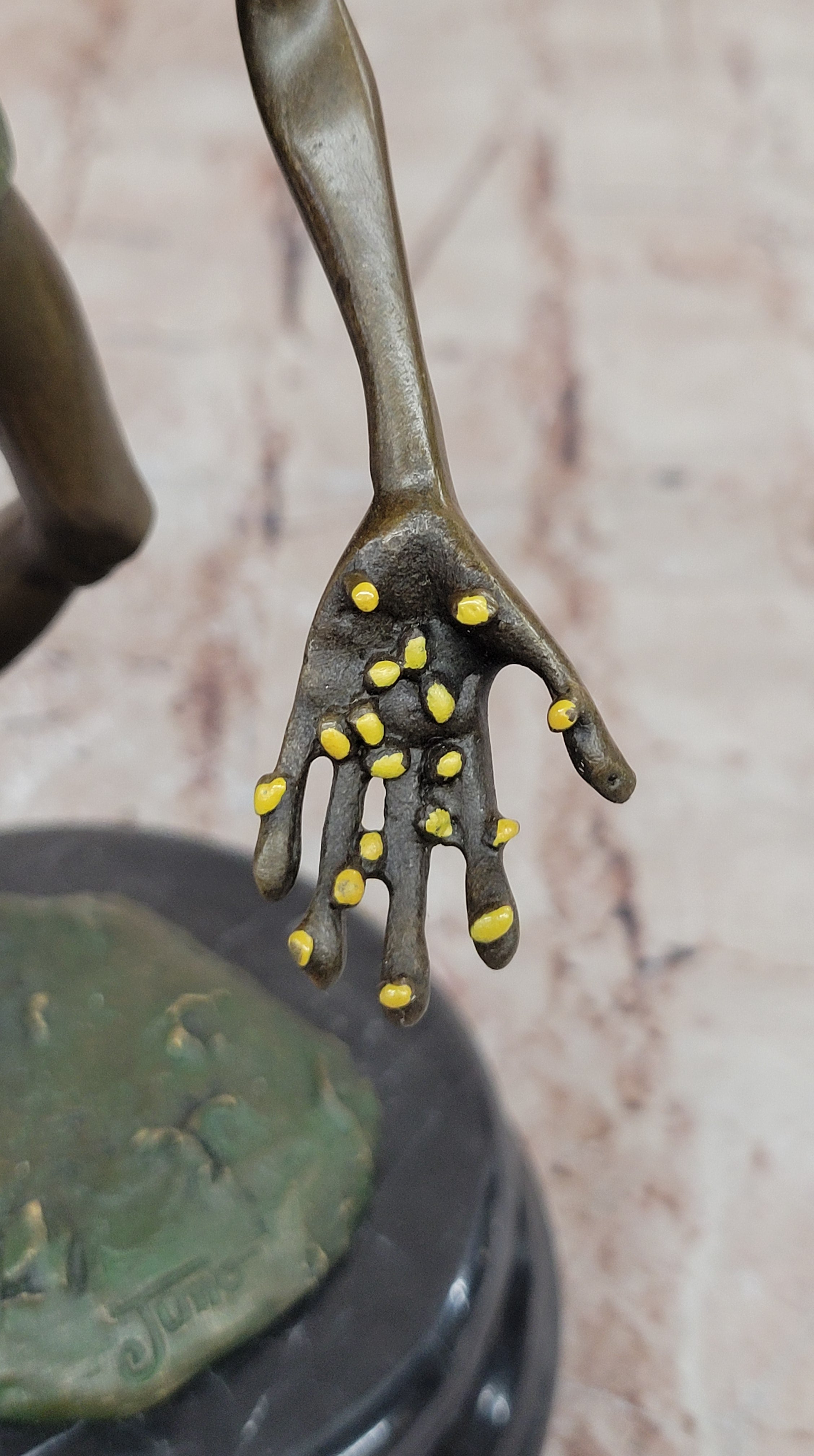 Resting on a round marble base, this bronze sculpture becomes a charming addition to any space, evoking a sense of magic and folklore. The combination of skillful artistry, the lost wax method, and the artist's signature make this piece a collectible and distinctive artwork for those who appreciate both tradition and artistic innovation.Bronze Dimensions with Marble Base: Height 11" X Width 6"
