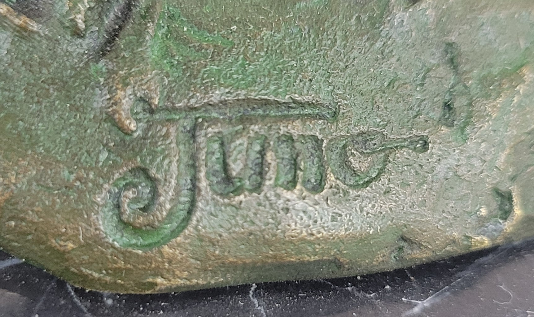 The leprechaun, known for its folklore association with Irish mythology, is portrayed with a playful and lively demeanor. The use of multi-color patina adds a dynamic and eye-catching element to the sculpture, enhancing its visual appeal. The artist's signature, Juno, is a mark of authenticity and craftsmanship.