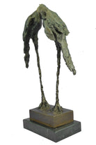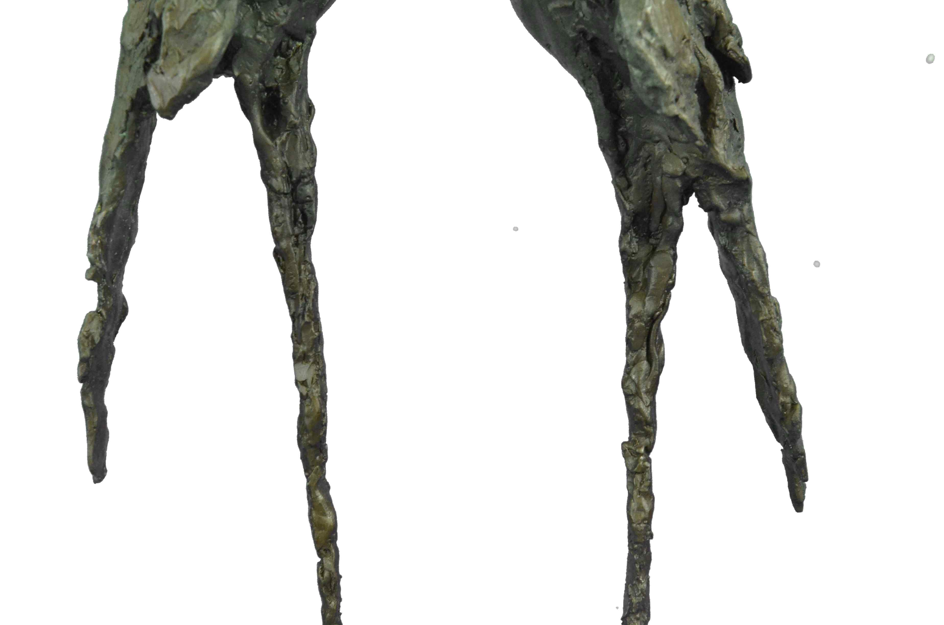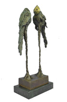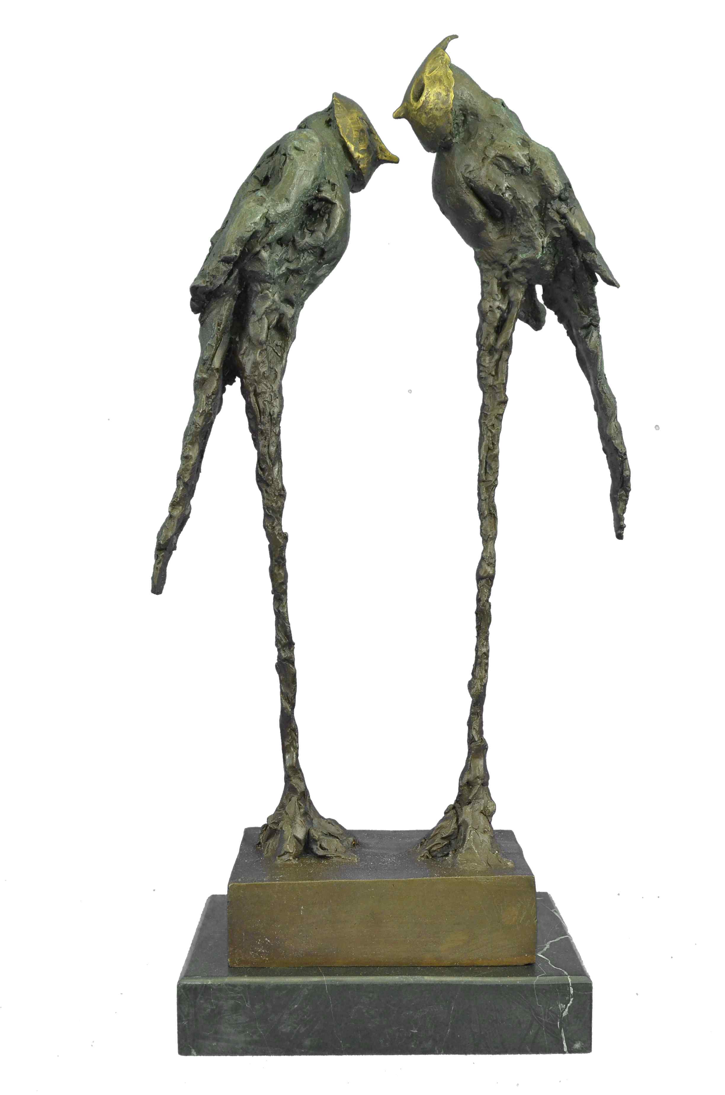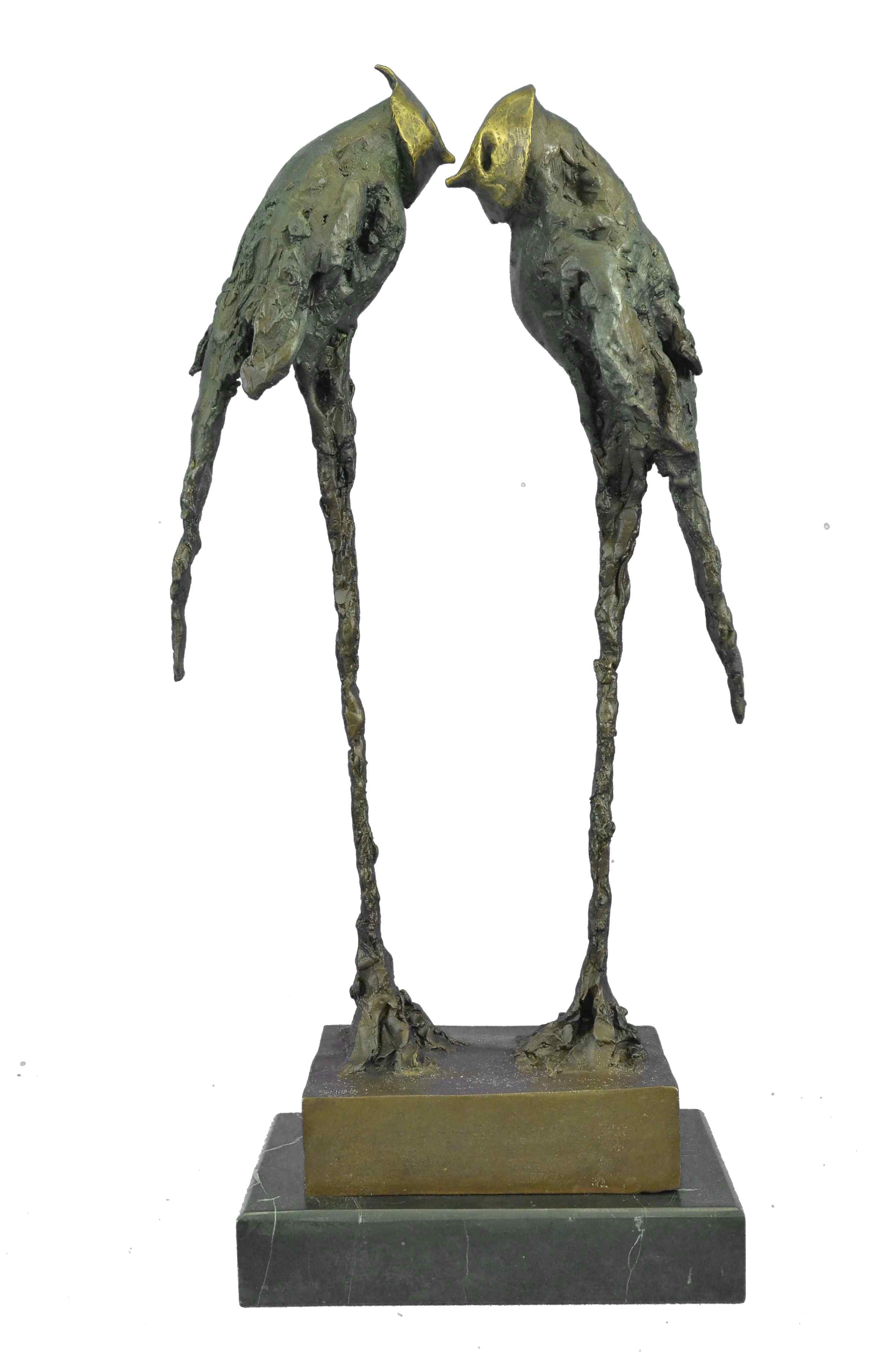 Very romantic stylish pair of bronze parrot sculptures standing tall on a simulated marshland. One parrot bird gazes forward towards its mate with its beak slightly raised while the other bird gazes to the side. Both sculptures have been treated with a lustrous bronze patina that has been applied by hand and polished. The parrot wings have abstract qualities and are finished with a Verde green patina which has a marble-like appearance with rippling grain patterns throughout the surfaces. The magnificent sculpture is mounted on a polished oval black marble base and is numbered.Bronze Dimensions with Marble Base:Height 21" x Width 10"