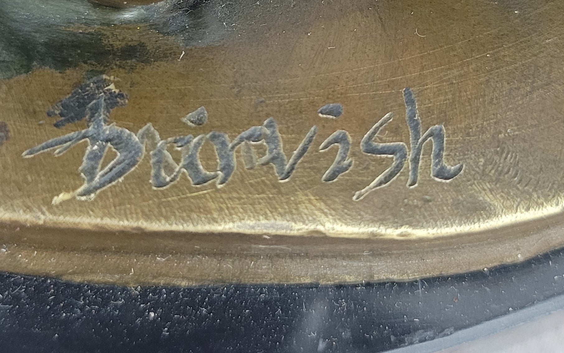 This Abstract Modern Dancer bronze sculpture captures the fluid motion and harmony of a couple intertwined in dance. Signed by the artist Darvish, this piece exhibits a modern, abstract approach, blending elegance with contemporary style. The figures are carefully crafted to convey a sense of unity and movement, with their sleek, elongated forms embodying the grace of dance and the beauty of human connection.