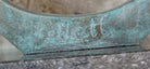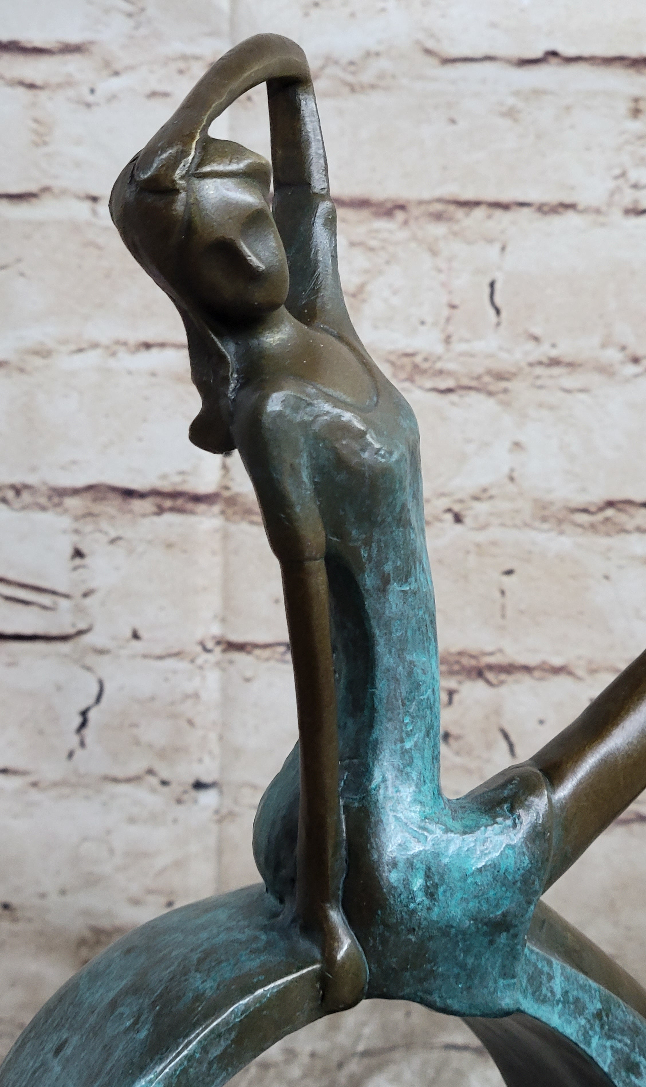 Measuring approximately 12 inches in height, the figurine's delicate craftsmanship is evident, especially in the intricate detailing of her limbs. The fragmented design imparts an aura of delicacy and minimalism, offering a dynamic visual experience. The combination of smoothly polished bronze parts in a golden hue and heavily textured surfaces adorned with a green patina creates a striking color contrast. This intentional design choice elevates the modest, feminine form, highlighting the artistry that lies in the fusion of these two distinct bronze finishes.