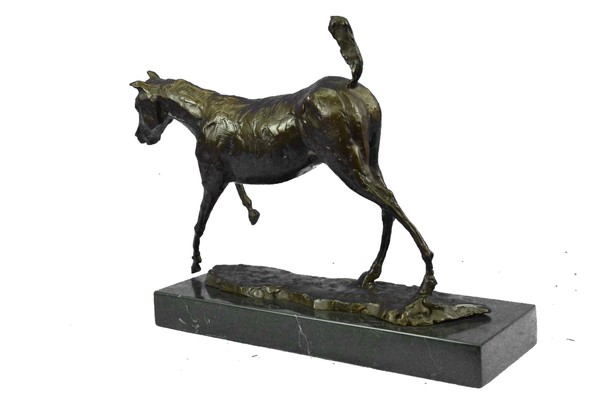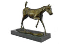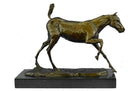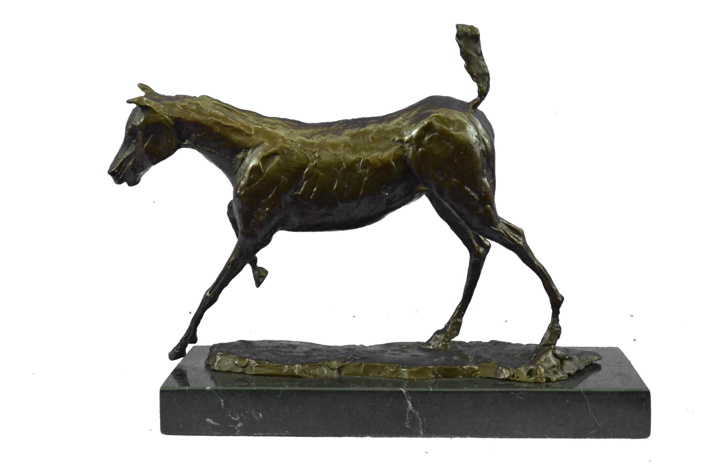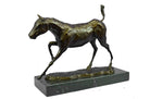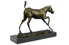 Horses are known and loved for their agility, graceful movement, strong bodies and sleek coat. They ignite a feeling of freedom and uncharted paths. This sculpture is perfect for any horse lover and collector. This horse has broken free of his reins, saddle and the restricting ranch he lived on. He trots freely in the open land. His eyes widened at the sight of soaring birds. 100% bronze and handmade, this brown patina sculpture was cast using the "Lost Wax Method" and mounted on a black marble base. It is signed by the artist Milo.Original or Reproduction: Original