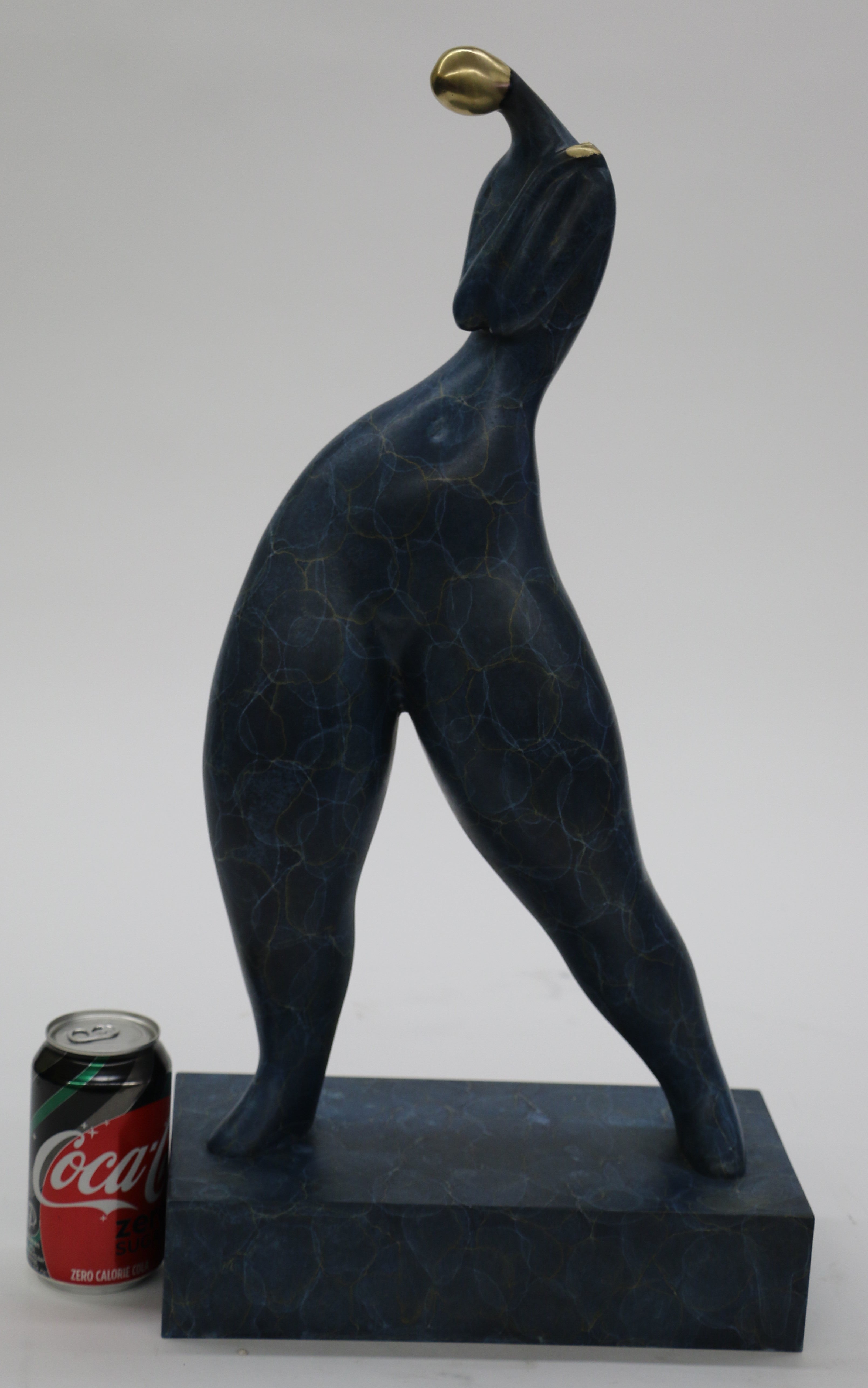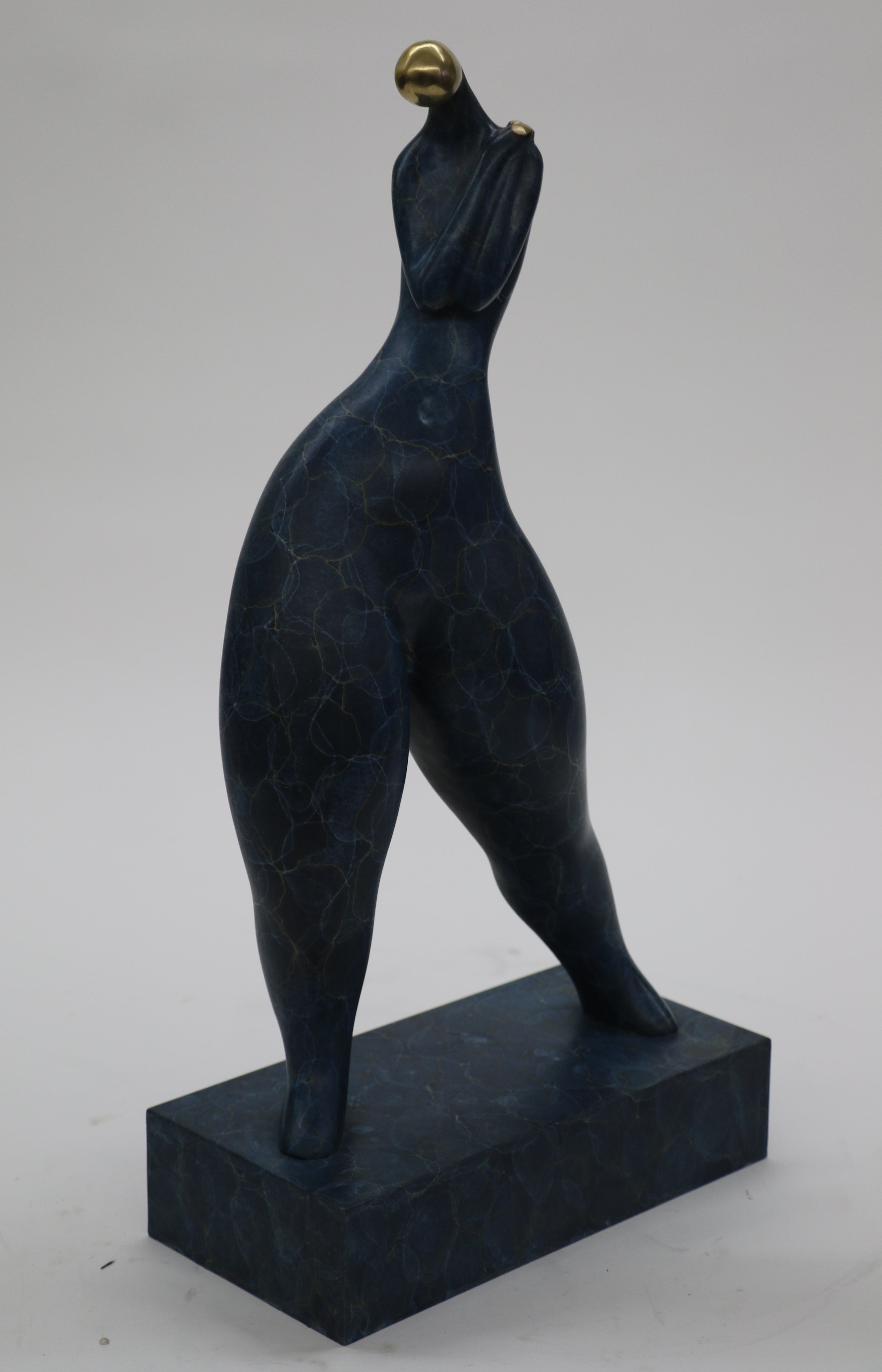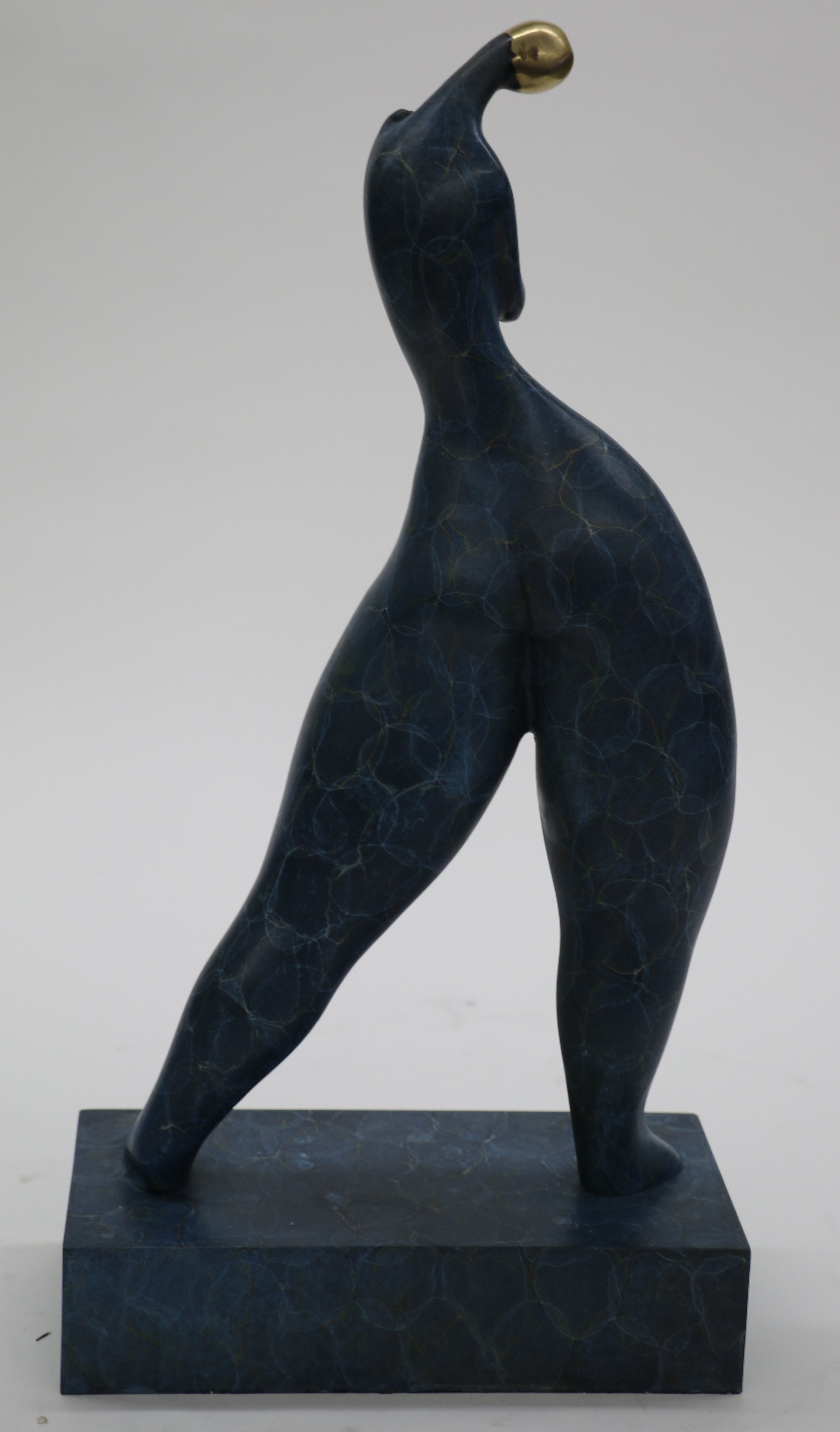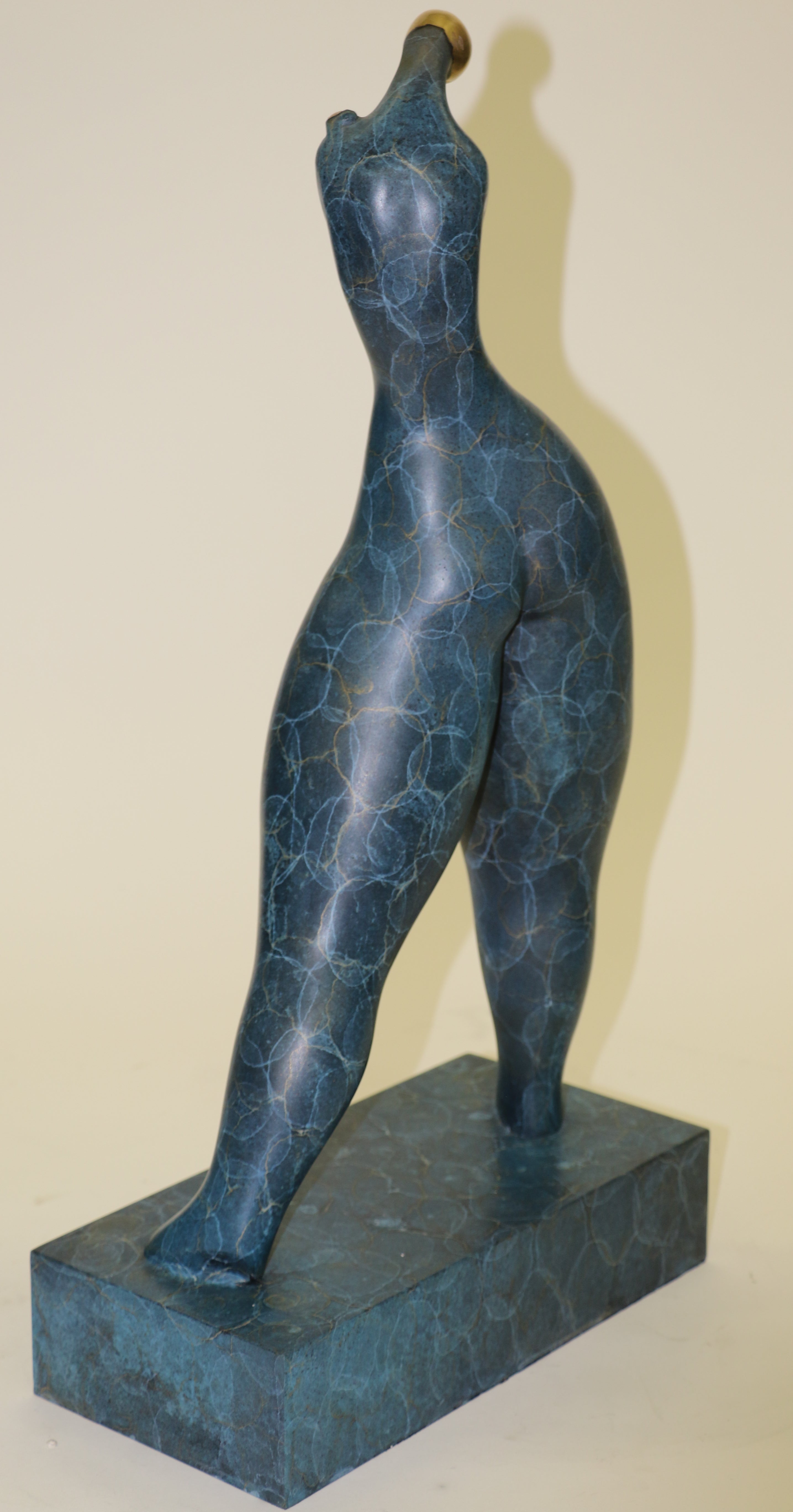 An abstract Limited Edition female dancer sculpture. You can just tell this is a powerful dancer in the sharpness of her position. This wonderfully curvaceous woman bears the wide hips commonly attributed to femininity and fertility. It is a 100% bronze, cast using the lost wax method. It stands tall on Genuine bronze base with multi color Green Blue patina. This sculpture is signed and numbered by artist Mario Nick.Bronze Dimensions :Height 23" X 12"