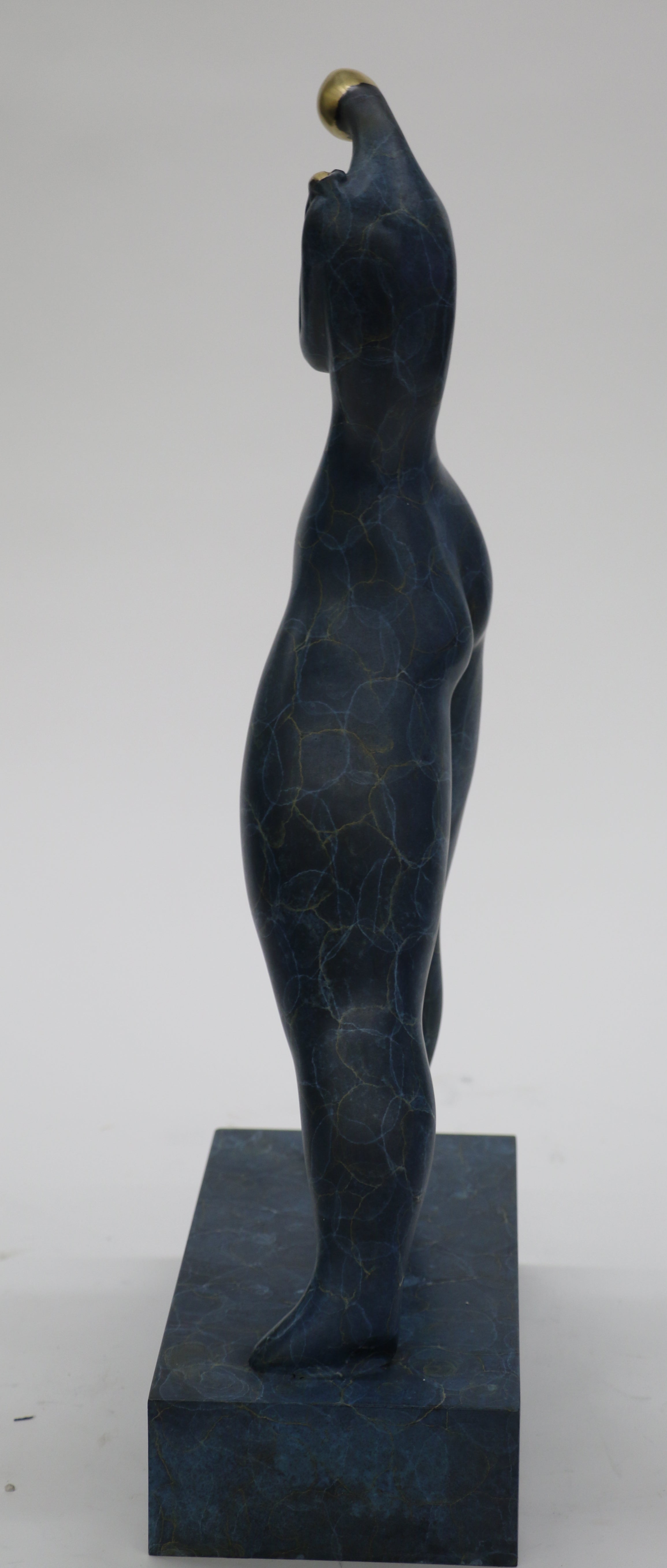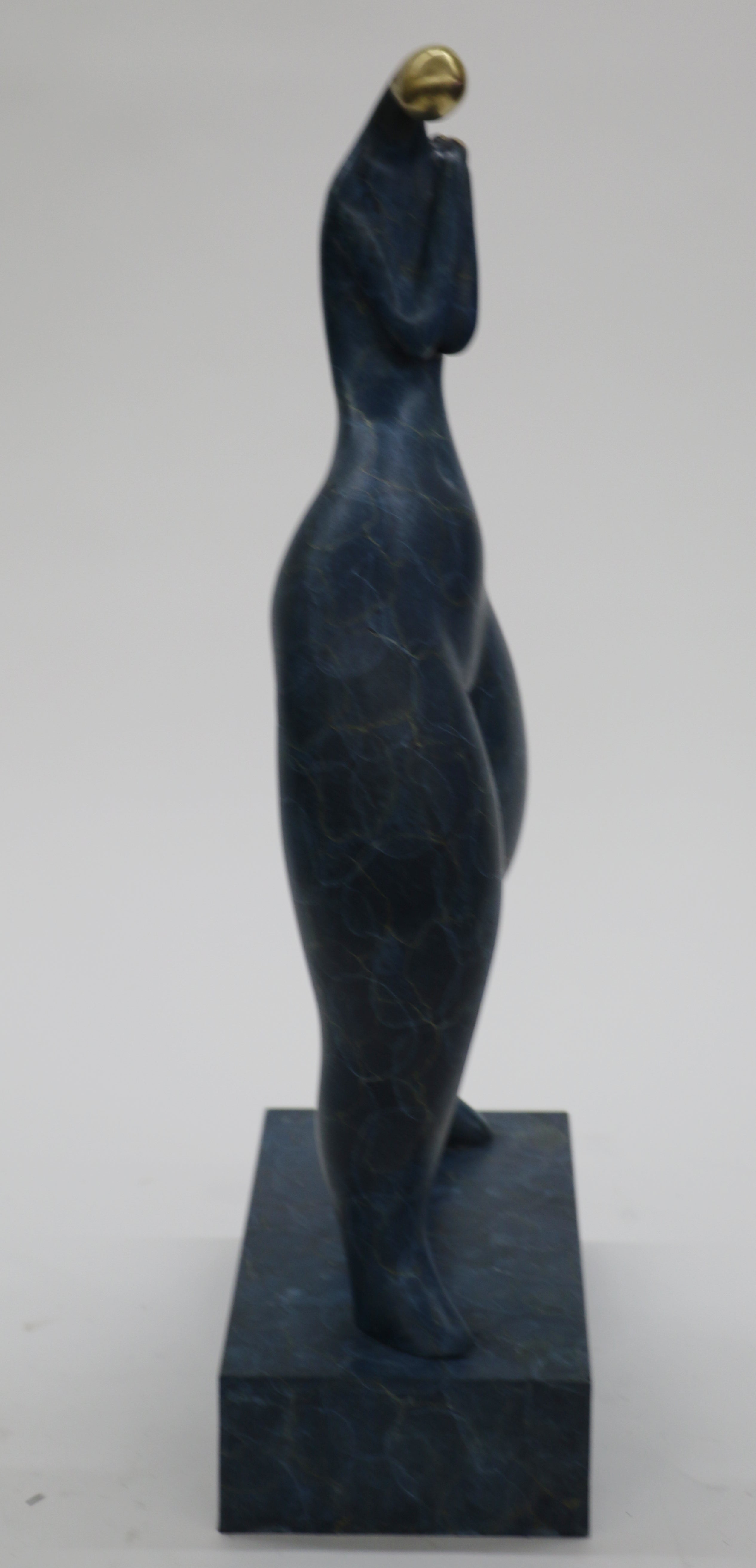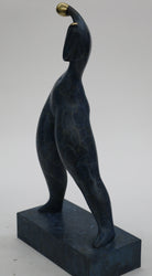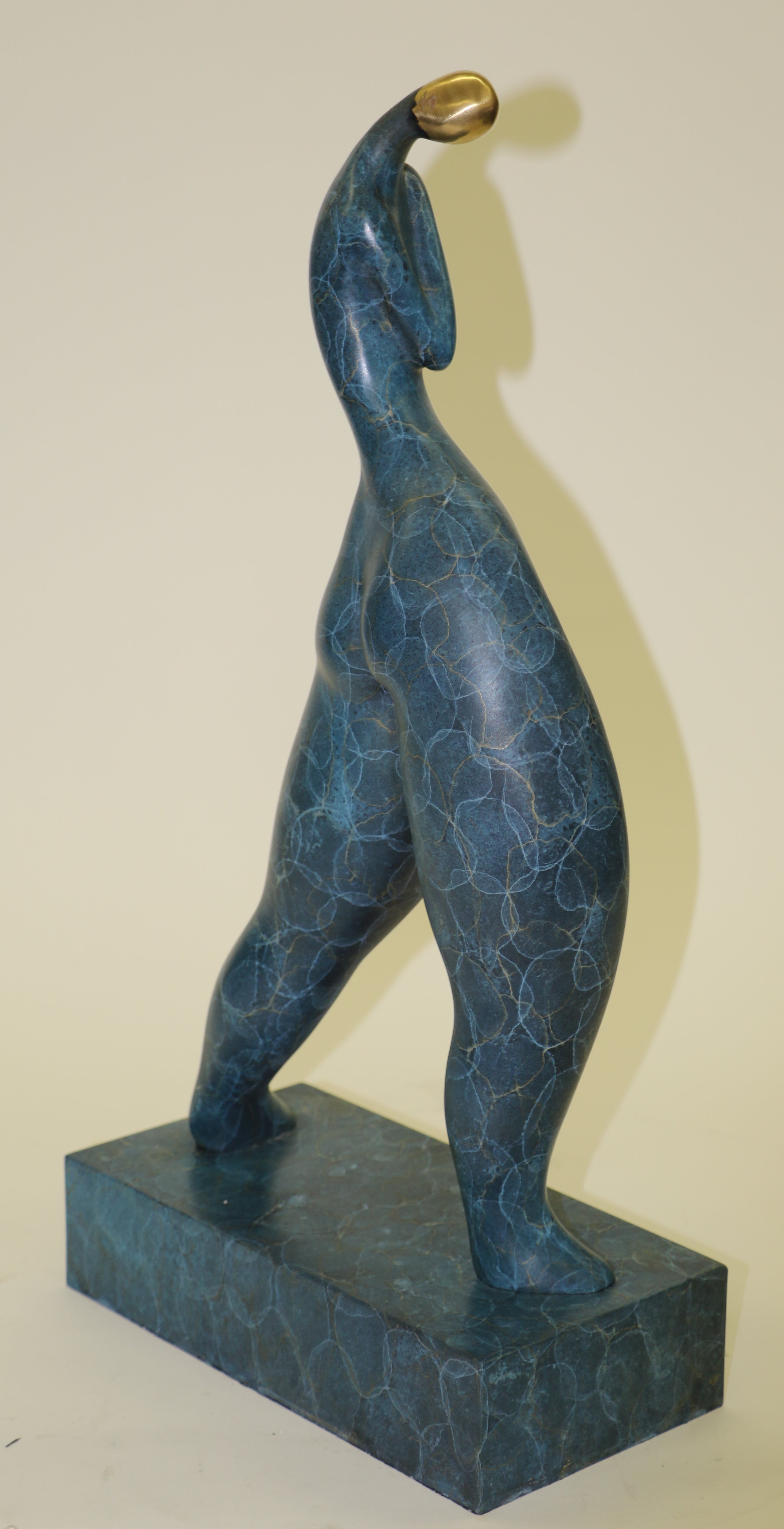 An abstract Limited Edition female dancer sculpture. You can just tell this is a powerful dancer in the sharpness of her position. This wonderfully curvaceous woman bears the wide hips commonly attributed to femininity and fertility. It is a 100% bronze, cast using the lost wax method. It stands tall on Genuine bronze base with multi color Green Blue patina. This sculpture is signed and numbered by artist Mario Nick.Bronze Dimensions :Height 23" X 12"