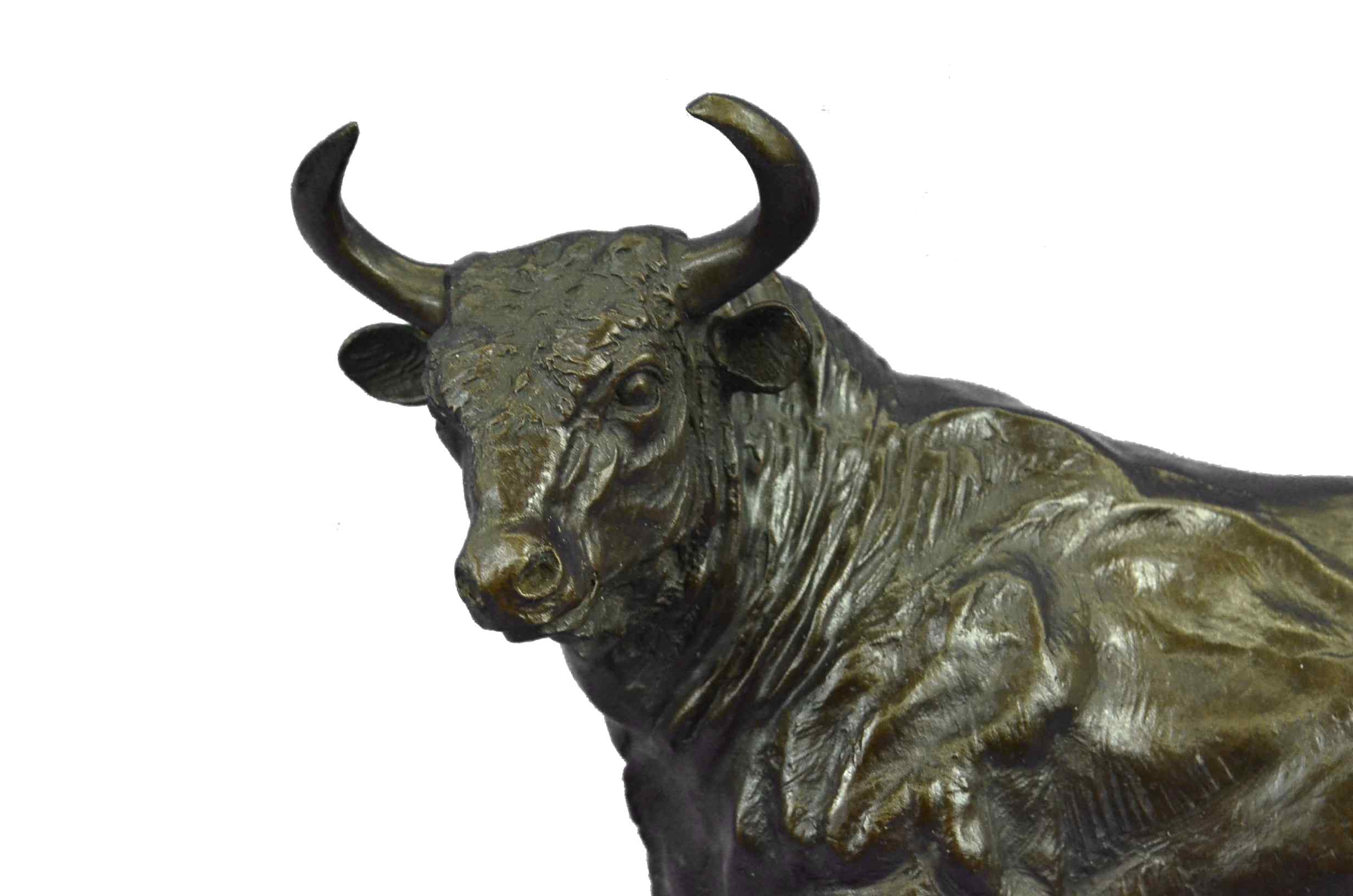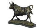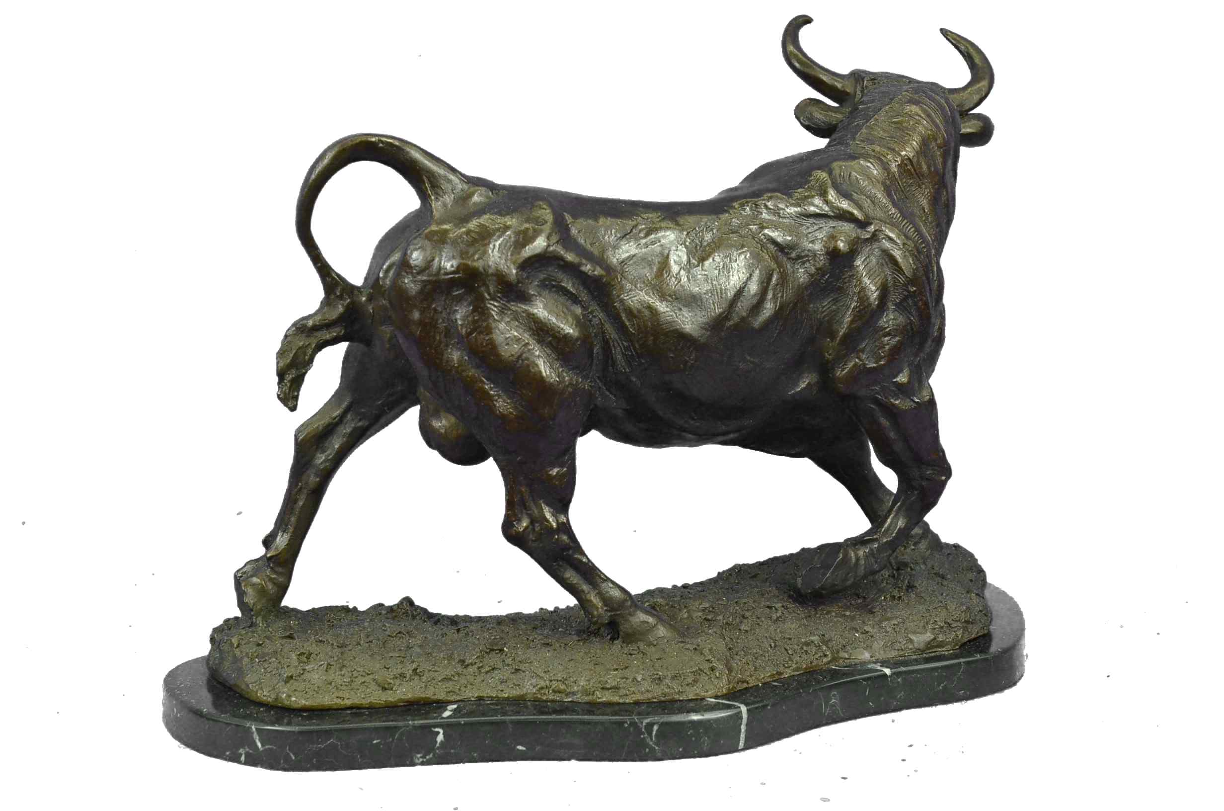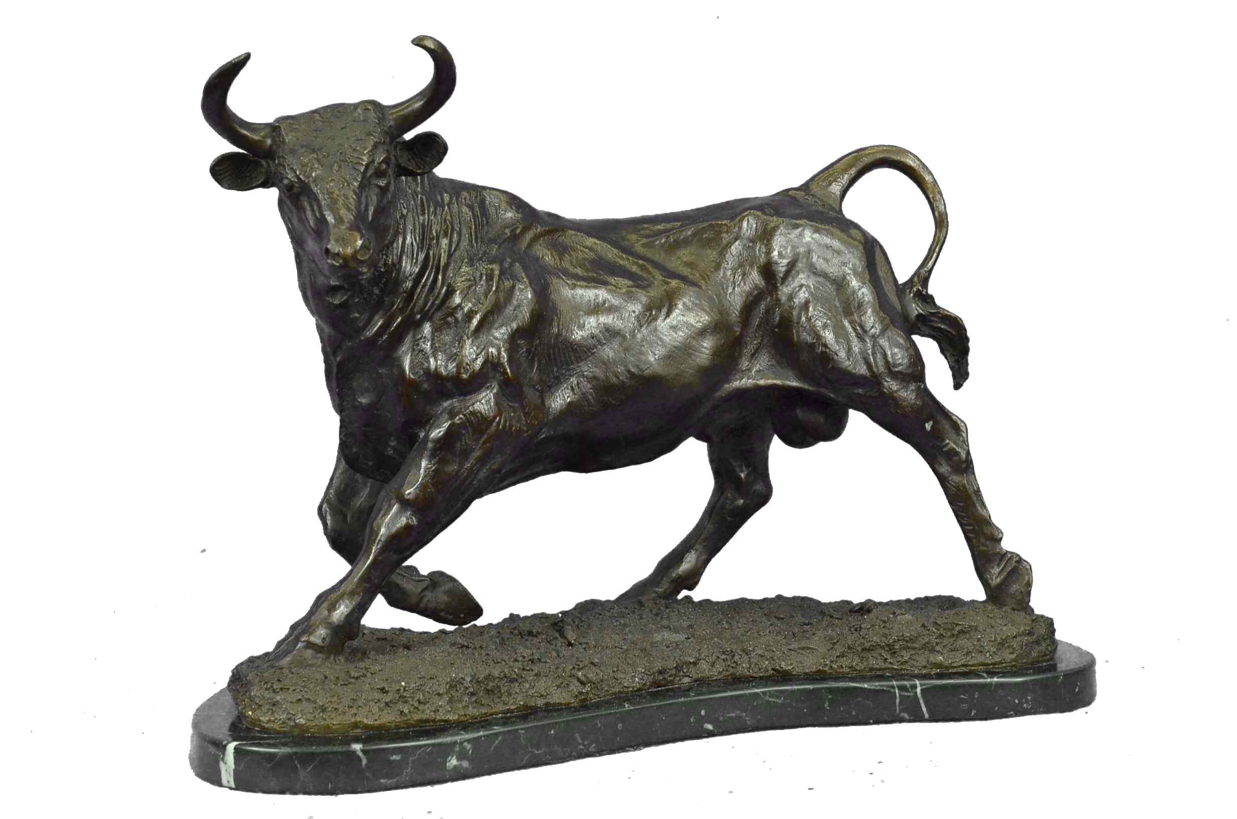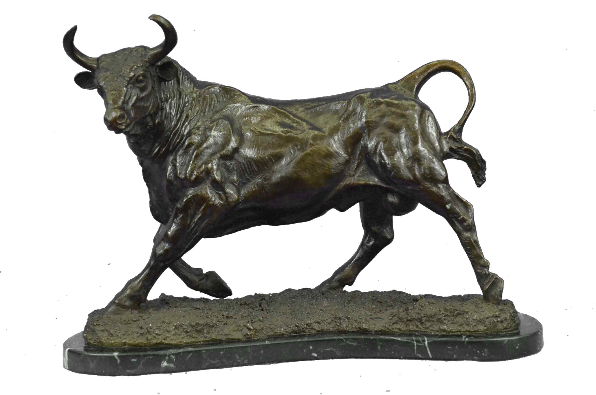 bullfight. The arena is in your home with this spanish bull sculpture. Bullfighting is a traditional spectacle of Spain, Portugal, some cities in southern France and in several Latin American countries. It can be considered a blood sport for both the bull or the brave matador that faces it in the ring. This large brown patina bull is in motion and hunting for its next target.Once he sets his eyes on you there`s no stopping him. He digs his hooves in, lowers his horns and barrels through. 100% bronze, handmade and fully detailed this sculpture was cast using the "Lost Wax Method". It is mounted on a round black marble base and signed by the artist Milo.Bronze Dimensions with Marble Base:Height 11" x Width 14"