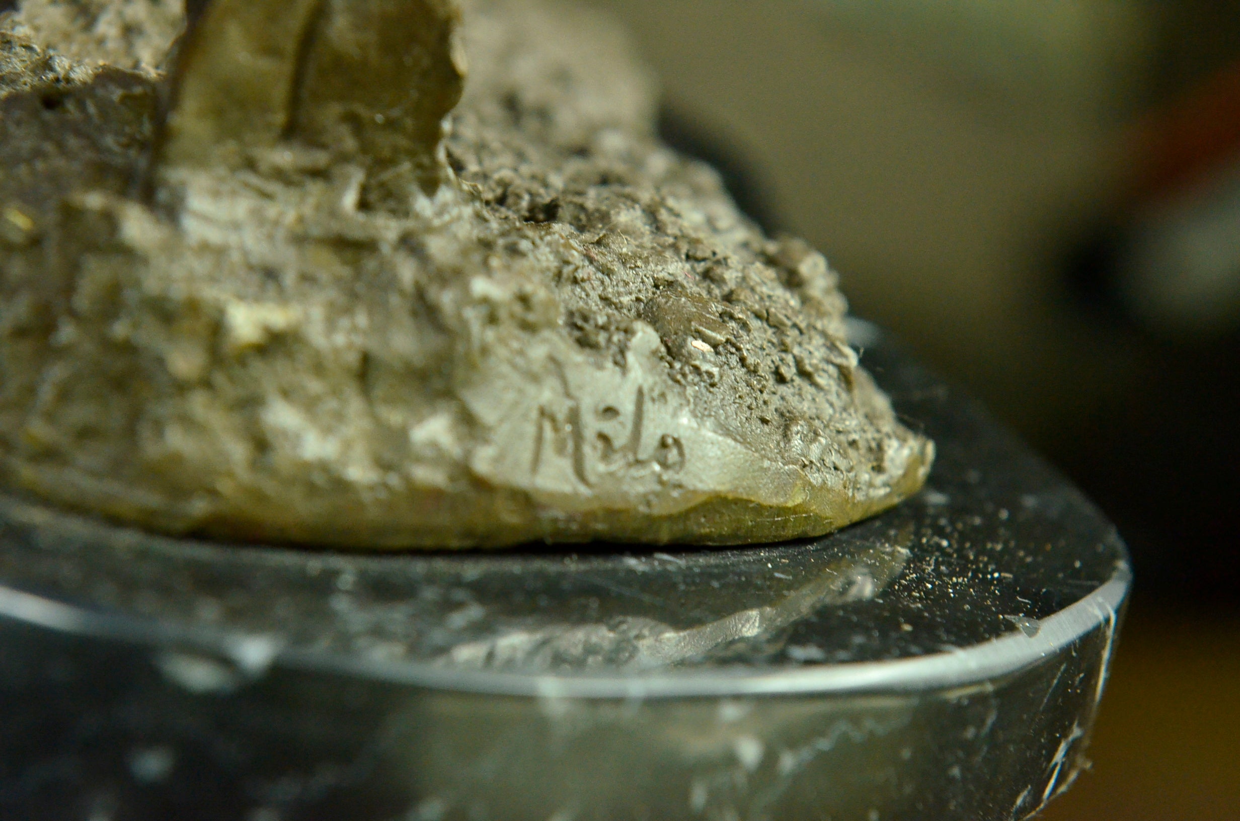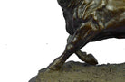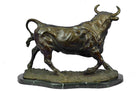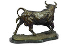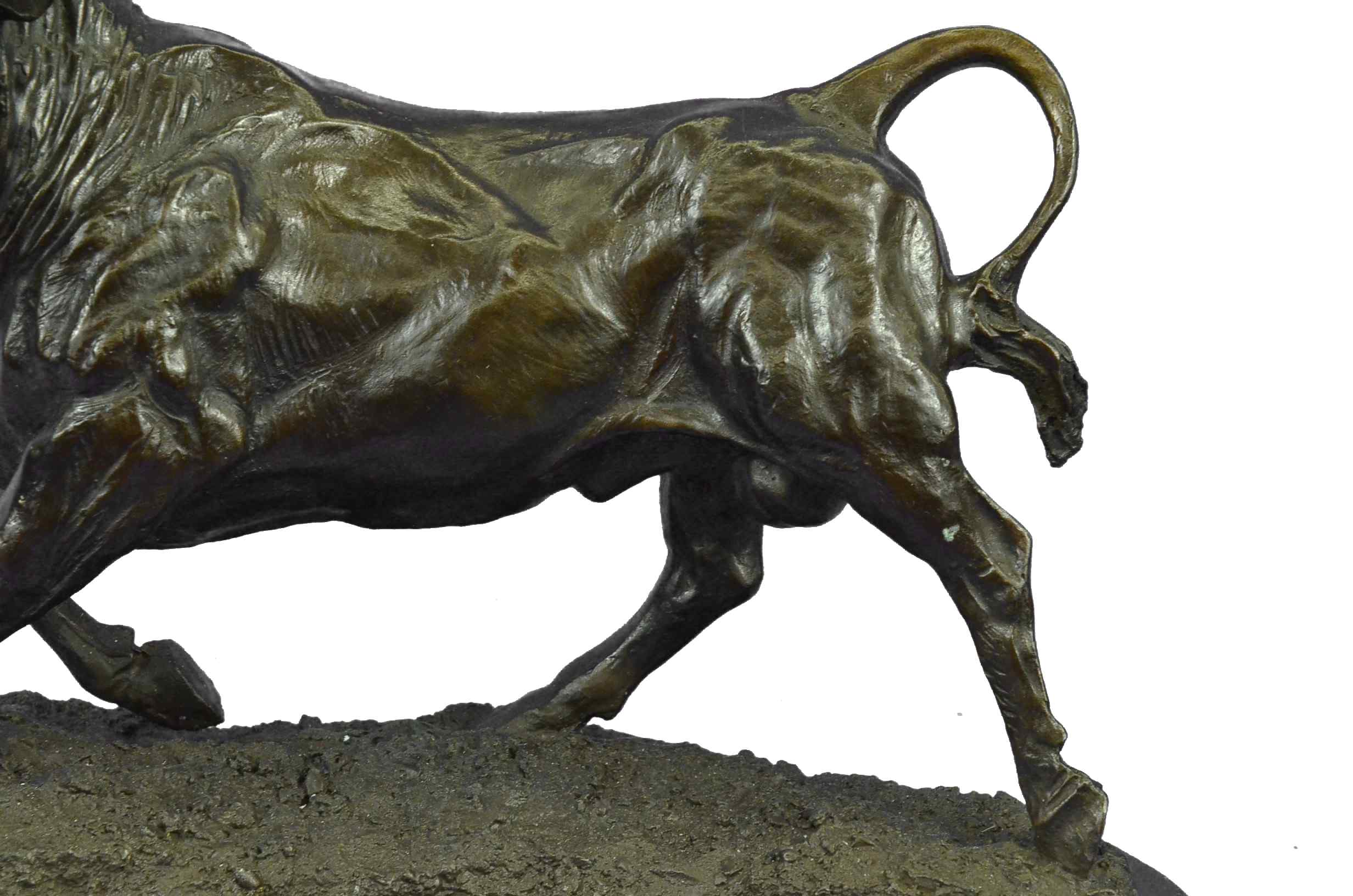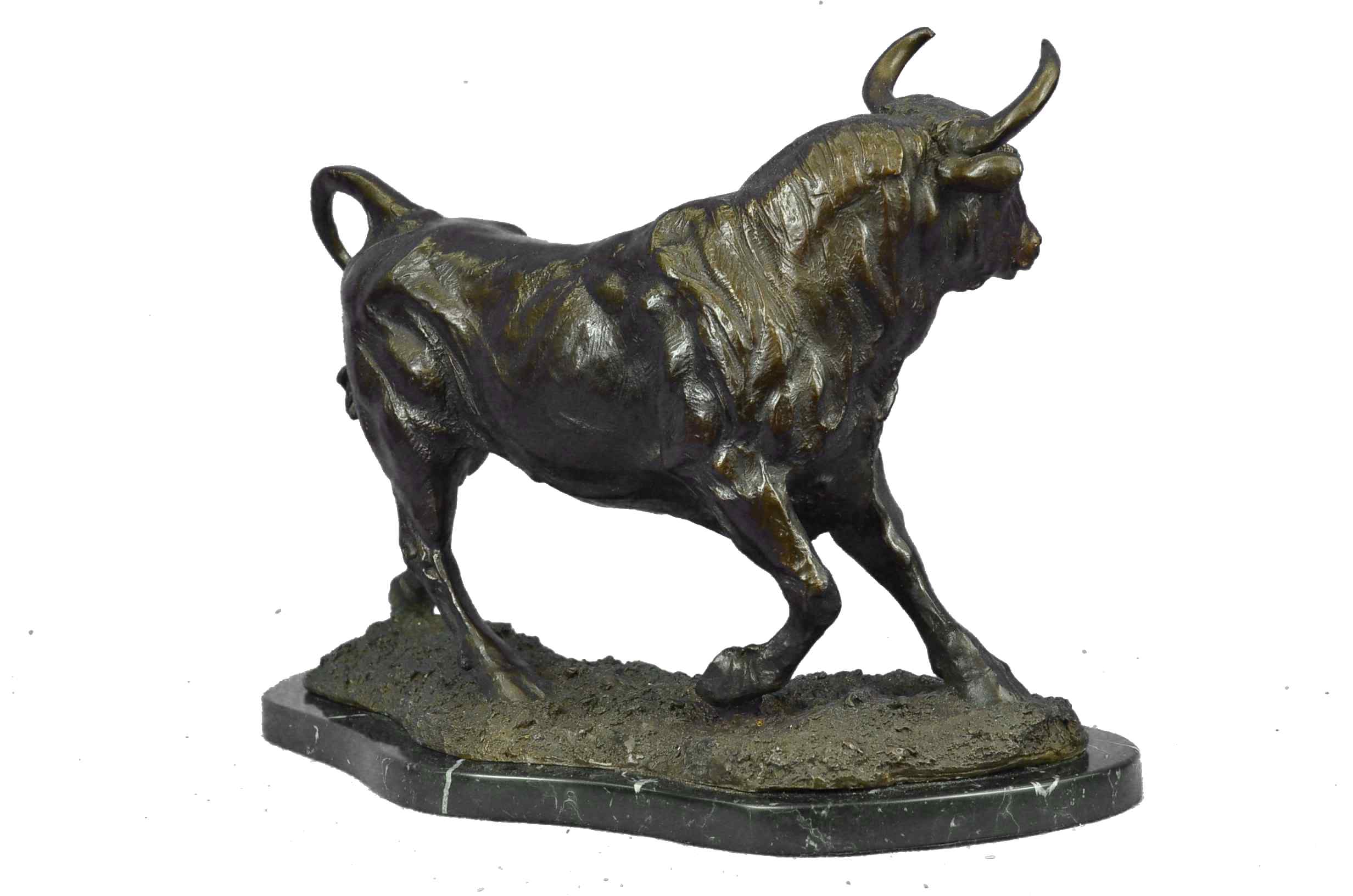 bullfight. The arena is in your home with this spanish bull sculpture. Bullfighting is a traditional spectacle of Spain, Portugal, some cities in southern France and in several Latin American countries. It can be considered a blood sport for both the bull or the brave matador that faces it in the ring. This large brown patina bull is in motion and hunting for its next target.Once he sets his eyes on you there`s no stopping him. He digs his hooves in, lowers his horns and barrels through. 100% bronze, handmade and fully detailed this sculpture was cast using the "Lost Wax Method". It is mounted on a round black marble base and signed by the artist Milo.Bronze Dimensions with Marble Base:Height 11" x Width 14"