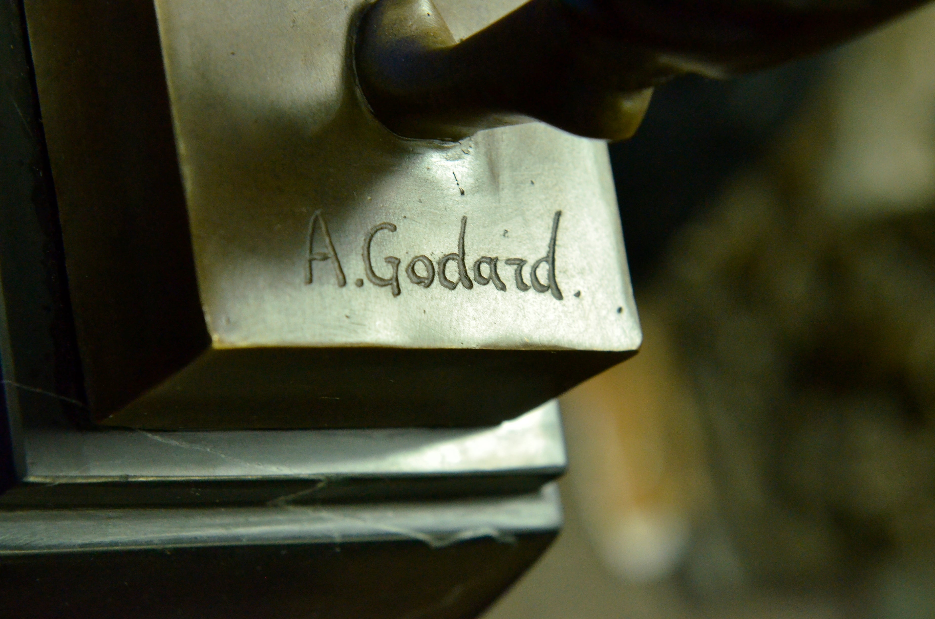 This Stunning Dancer Is One Exquisite Piece. She Stand On Her Toes, While Both Her Arms Are Spread One To The Back Of Her And The Other To The Front . She Is Wearing Earrings And A Stylish Neck-Lace To Go With Her Ankle Bracelets. Her Gorgeous Seashells Style Top With This Astonishing Skirt That Dangles Little Cute Circular Beads Up Front, She Is Also Wearing A Gorgeous Hat That Covers Most Of Her Head And Hair. She Stands At The End Of Her Performance Proudly And Excited About Her Grand Finale. The Feed Back She Gets From The Crowd Leaves Her Well Pleased And Delighted This Amazing Sculpture Is In A Brown Patina And Mounted On A Marble Fire Red Colored Base. 100% Bronze And Handmade, She Was Cast Using The "Lost Wax Method. And Is Signed A.Goodard".Original or Reproduction: Reproduction