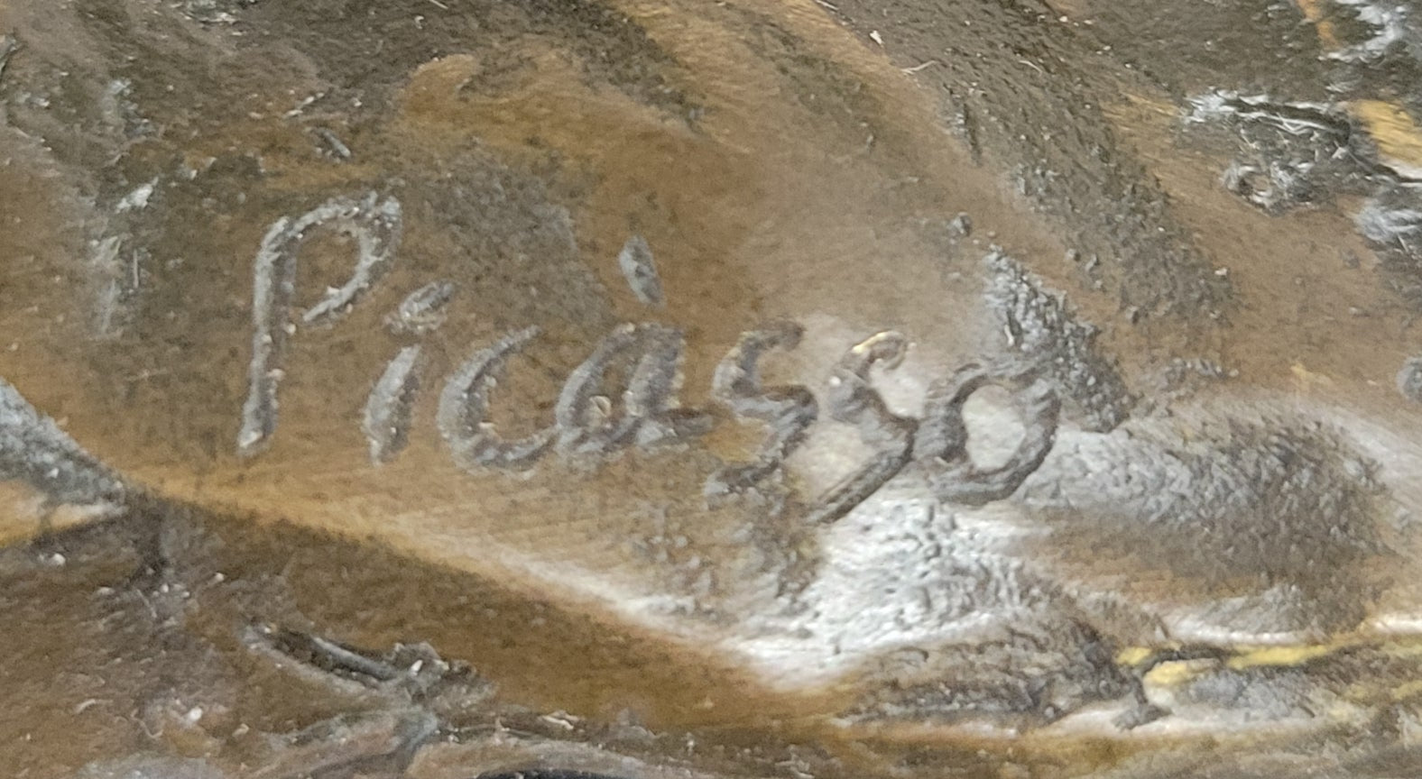 Crafted with exceptional artistry, this 100% bronze sculpture is handmade using the time-honored "Lost Wax Method," ensuring unparalleled quality and detail. The rich brown patina enhances its texture and character, while the round black marble base provides a solid and elegant foundation. Signed by the artist Picasso, this piece is a bold homage to the cultural and artistic legacy of bullfighting.Bronze Dimensions with Marble Base: Height 5.5" X Width 8"