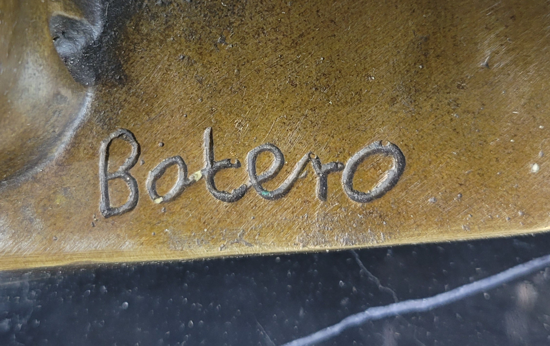 As a celebrated Colombian figurative artist, Botero has garnered international acclaim for his paintings, drawings, and sculptures. With exhibitions held worldwide and his art collected by major museums, corporations, and private collectors, Botero's work has left an indelible mark on the art world. This exquisite three-dimensional sculpture is a testament to Botero's mastery and is sure to delight enthusiasts of his unique artistic vision.Bronze Dimensions with Marble Base: Height 16" X Width 11"