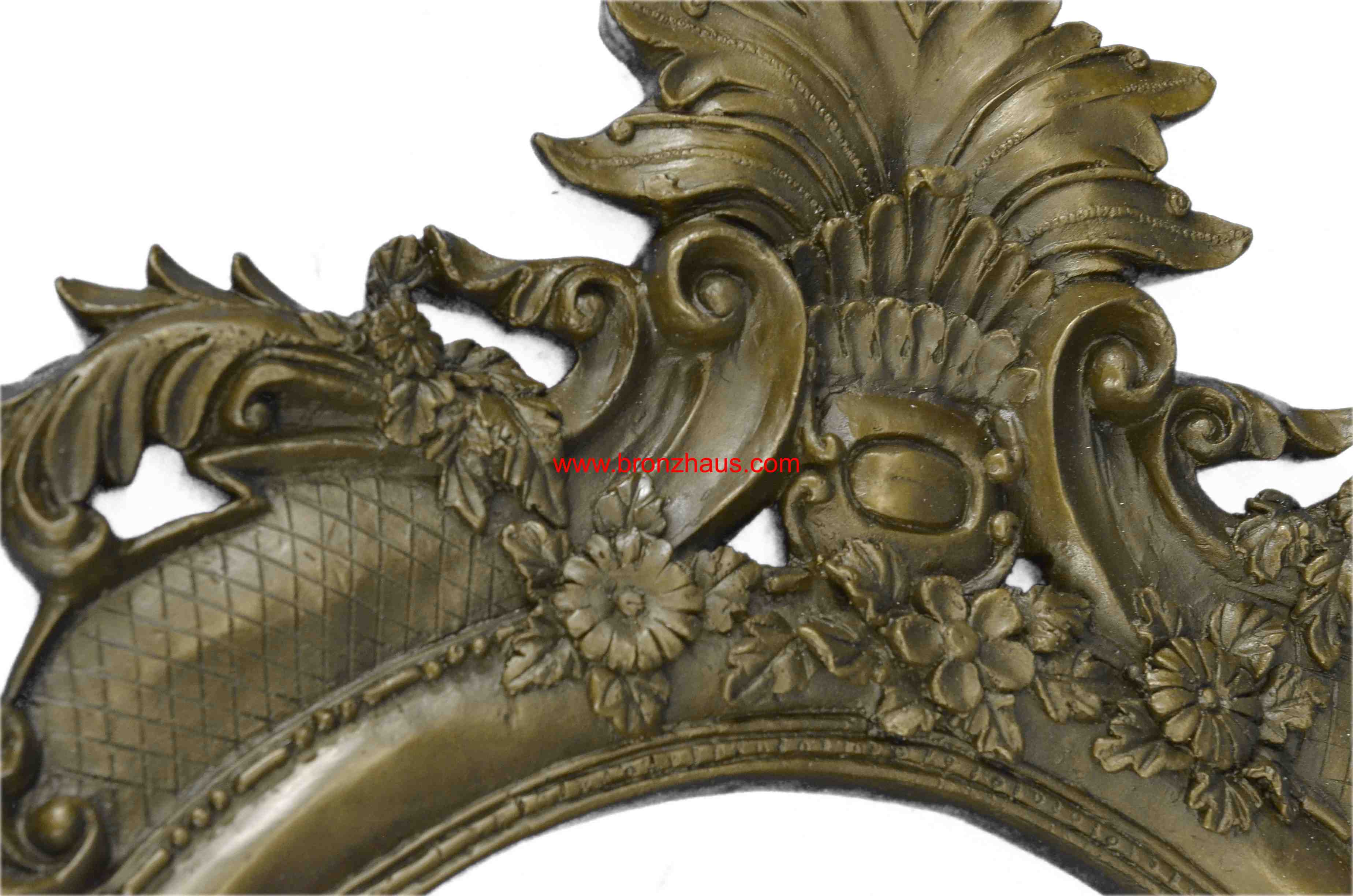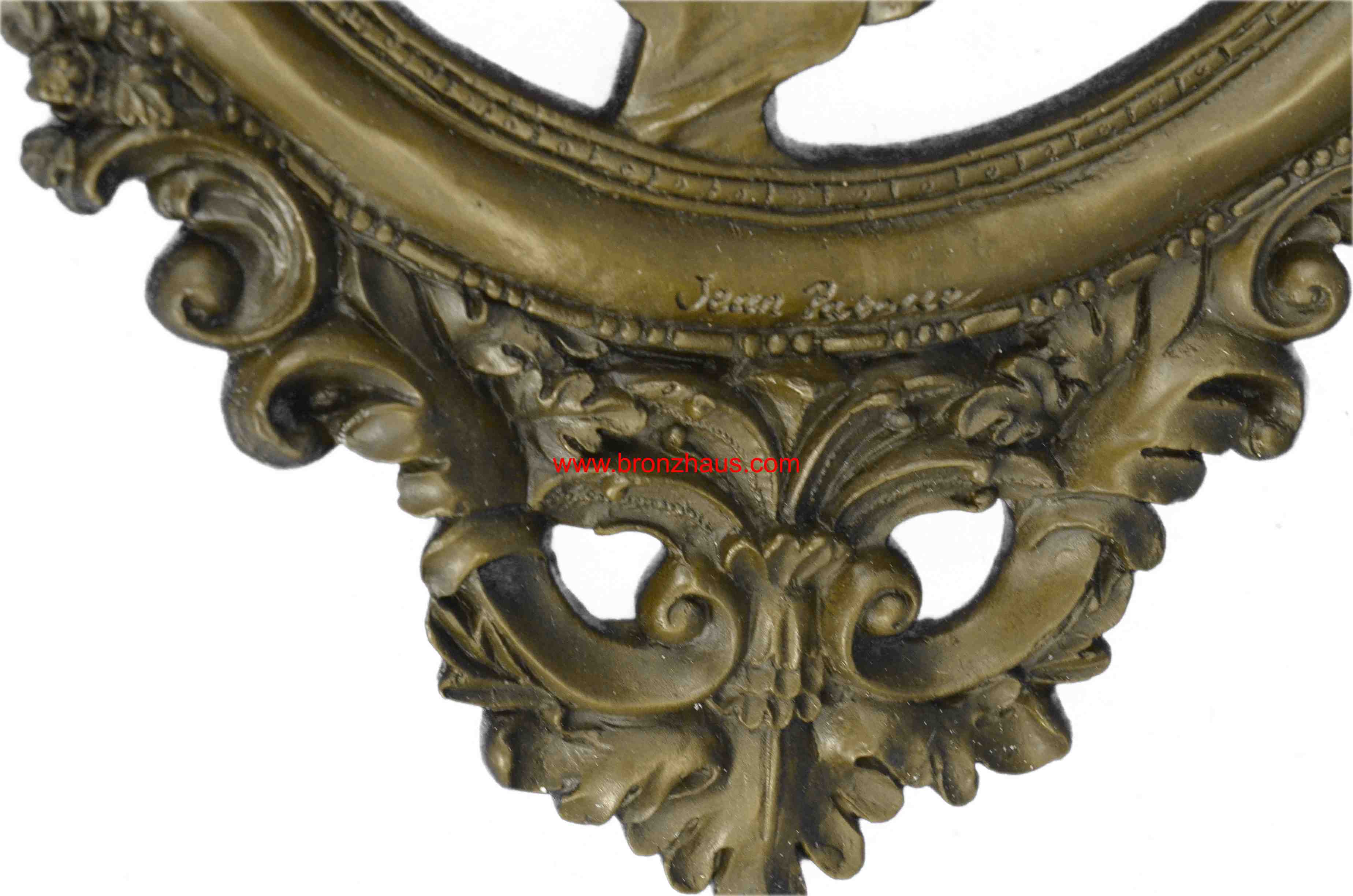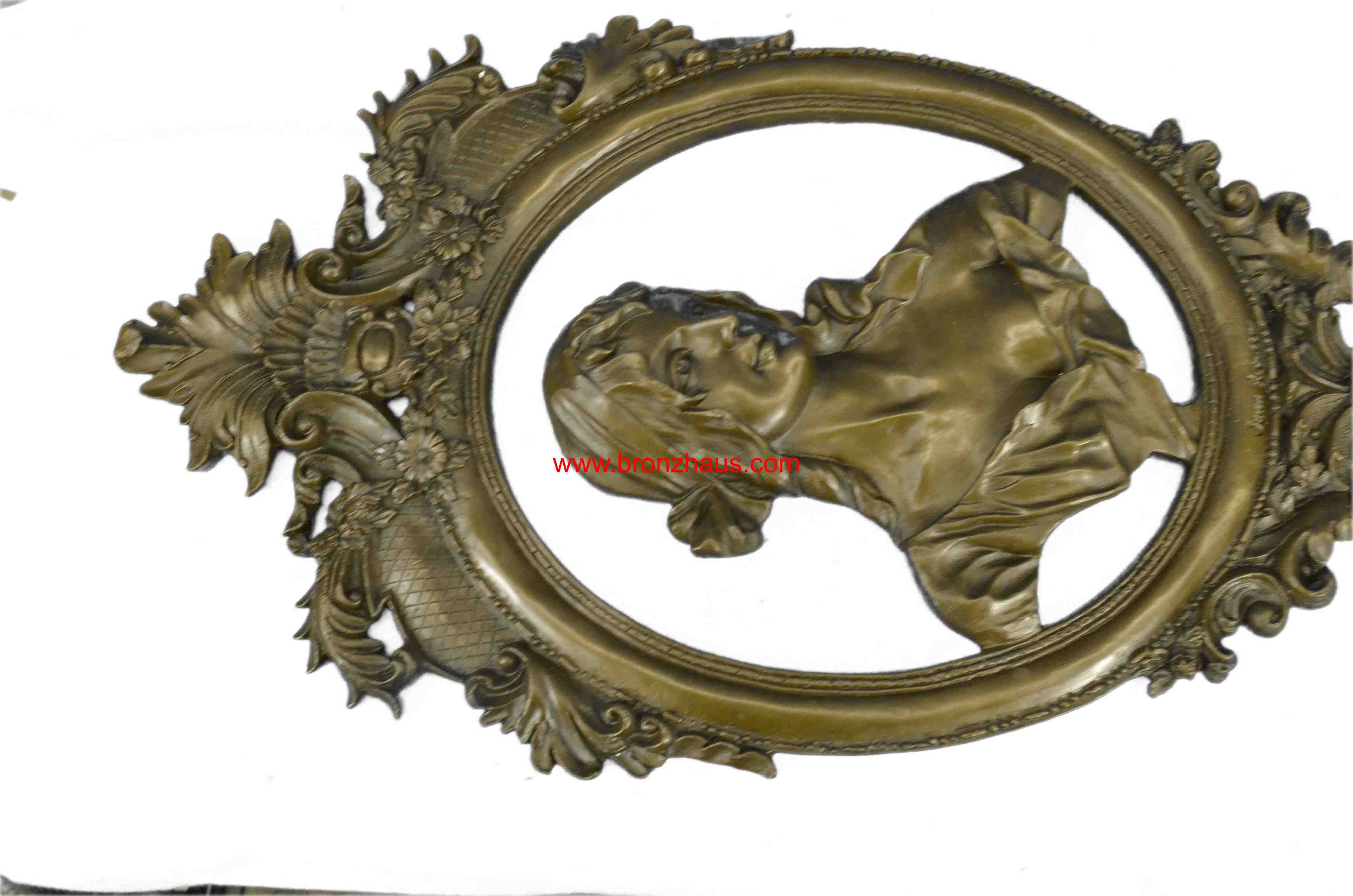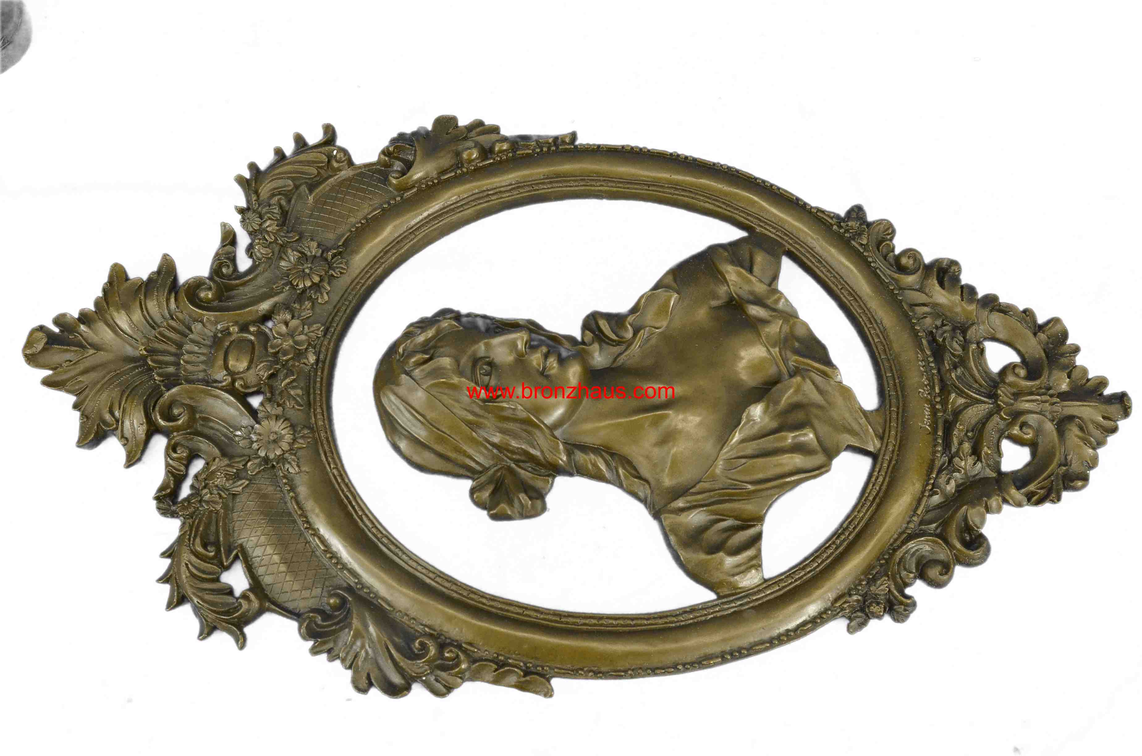 This beautiful wall piece depicts a the profile a young woman. Her expression is solemn. Freshly blossomed flowers surround the whole piece. Her hair hare is styled in soft waves. This elegant piece will add class and style to any living room, dining room or parlor. The piece wax crafted using the lost wax method. It is signed by the artist Jean Patoue.Bronze Dimensions :Height 28" x Width 16"