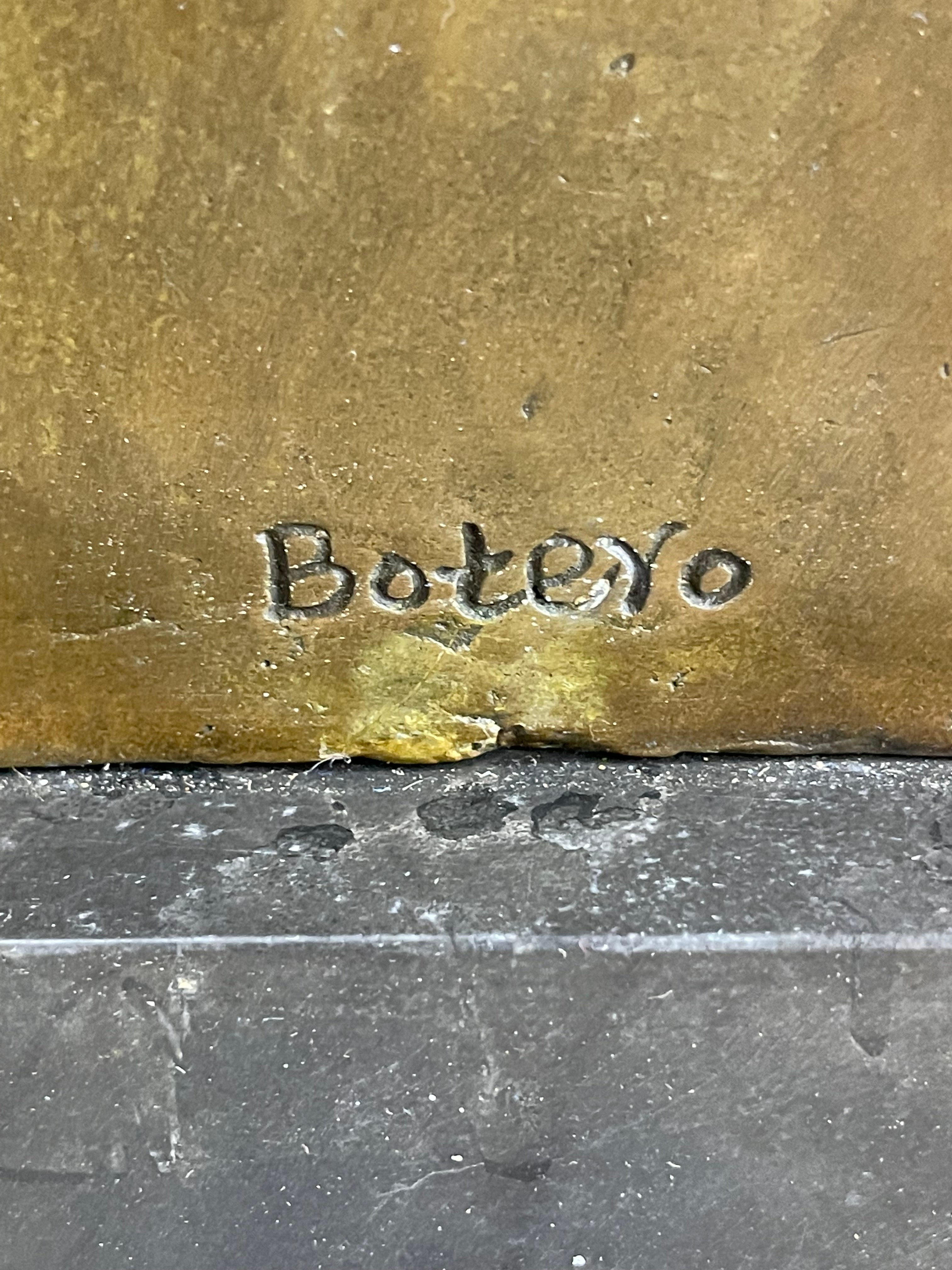 Crafted from genuine solid bronze using the traditional lost-wax casting method, the sculpture is endowed with both exceptional quality and enduring durability, ensuring its timeless appeal and longevity. Poised on an elegant black marble base, the sculpture is signed by the artist, bearing the distinguished mark of Botero's craftsmanship and artistic vision. Its striking and contemporary design serves as a captivating focal point, infusing any space with an air of sophistication and artistic allure.
