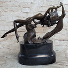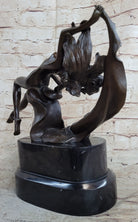 Introducing a captivating bronze sculpture that embodies the essence of freedom and self-expression. This sculpture portrays a nude dancer in a moment of liberation, as she joyfully releases her garment into the air. Her body is gracefully arched, and her feet are pointed with elegance, contrasting the flowing waves that surround her in various directions.