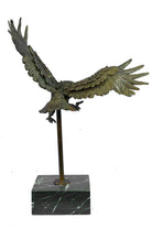 Whether displayed as a centerpiece or an accent, this magnificent eagle sculpture will surely captivate the hearts of art enthusiasts and nature lovers alike. Its dynamic and commanding presence exudes a sense of freedom and power, inviting onlookers to immerse themselves in the wonder of the natural world. Take this opportunity to add a touch of wild beauty to your space and allow the spirit of the eagle to soar in your surroundings.Bronze Dimensions with Marble Base: Height 15.5" X Width 13"