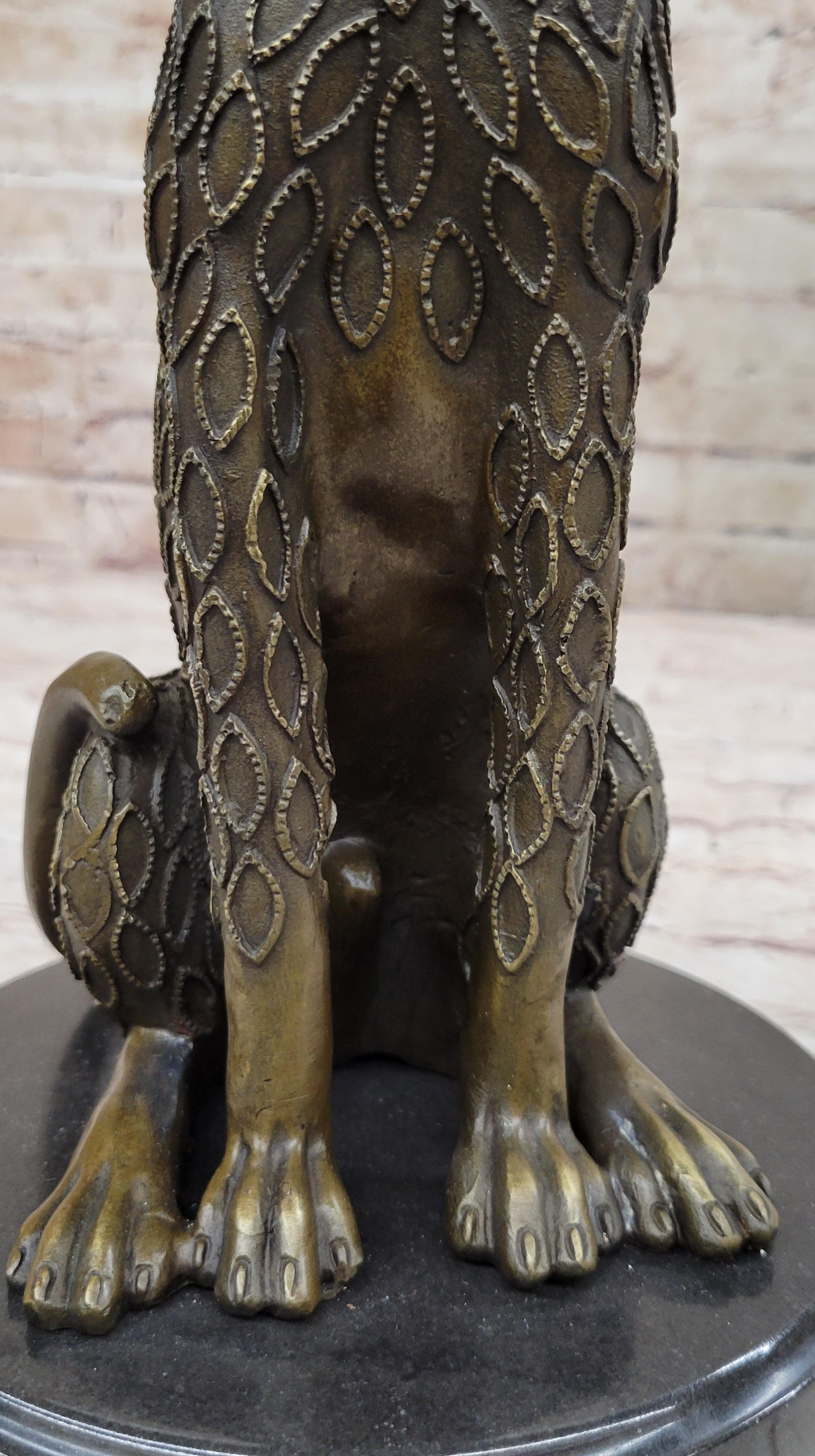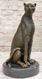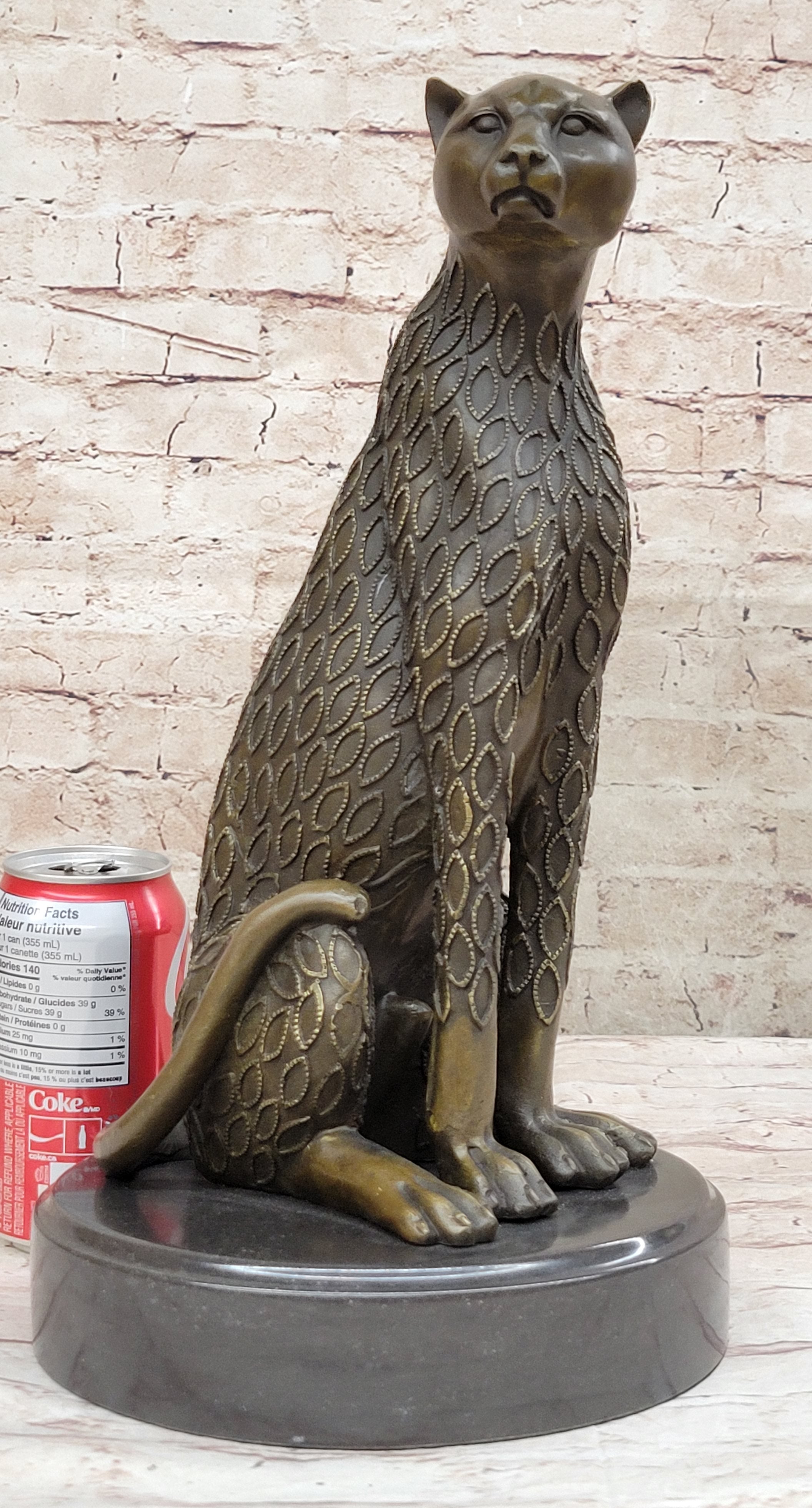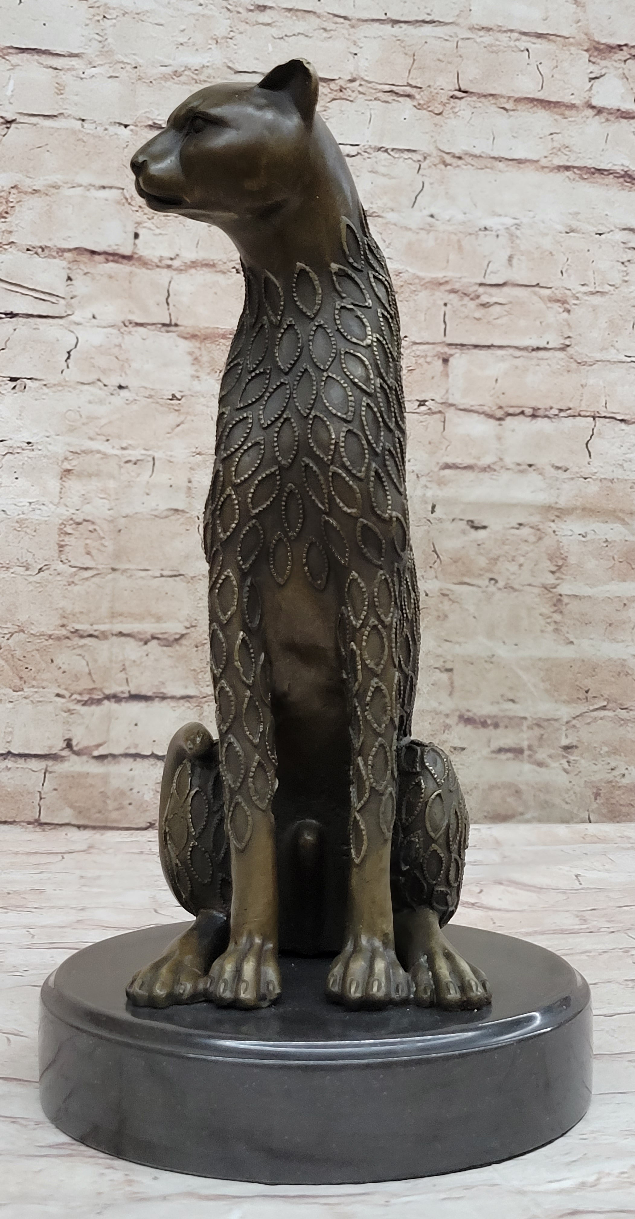 Crafted with the esteemed "Lost Wax Method," a time-honored technique revered for its precision and detail, this bronze cheetah is a masterpiece that reflects the exceptional artistry of its creator. Adorned with a rich brown patina finish, the sculpture not only accentuates the nuanced features of the cheetah but also adds a warm and inviting touch to its overall aesthetic. The signature of the renowned artist Henry Moore graces this hot cast masterpiece, further enhancing its quality and value. Positioned on a sleek round black marble base, this sculpture becomes a captivating focal point, celebrating the intersection of artistic excellence and the untamed beauty of the natural world..Bronze Dimensions with Marble Base: Height 13.5" X Width 7.5"