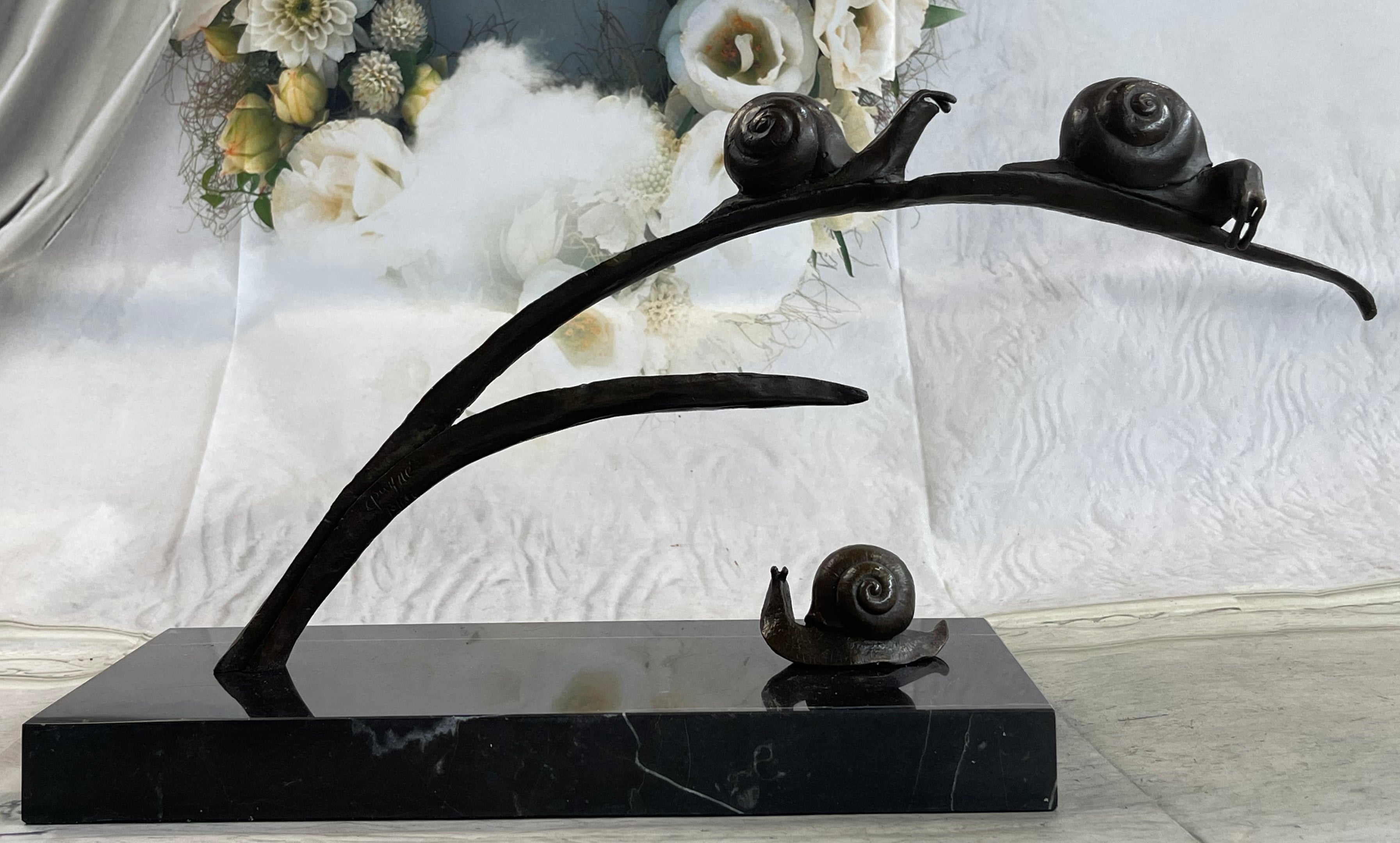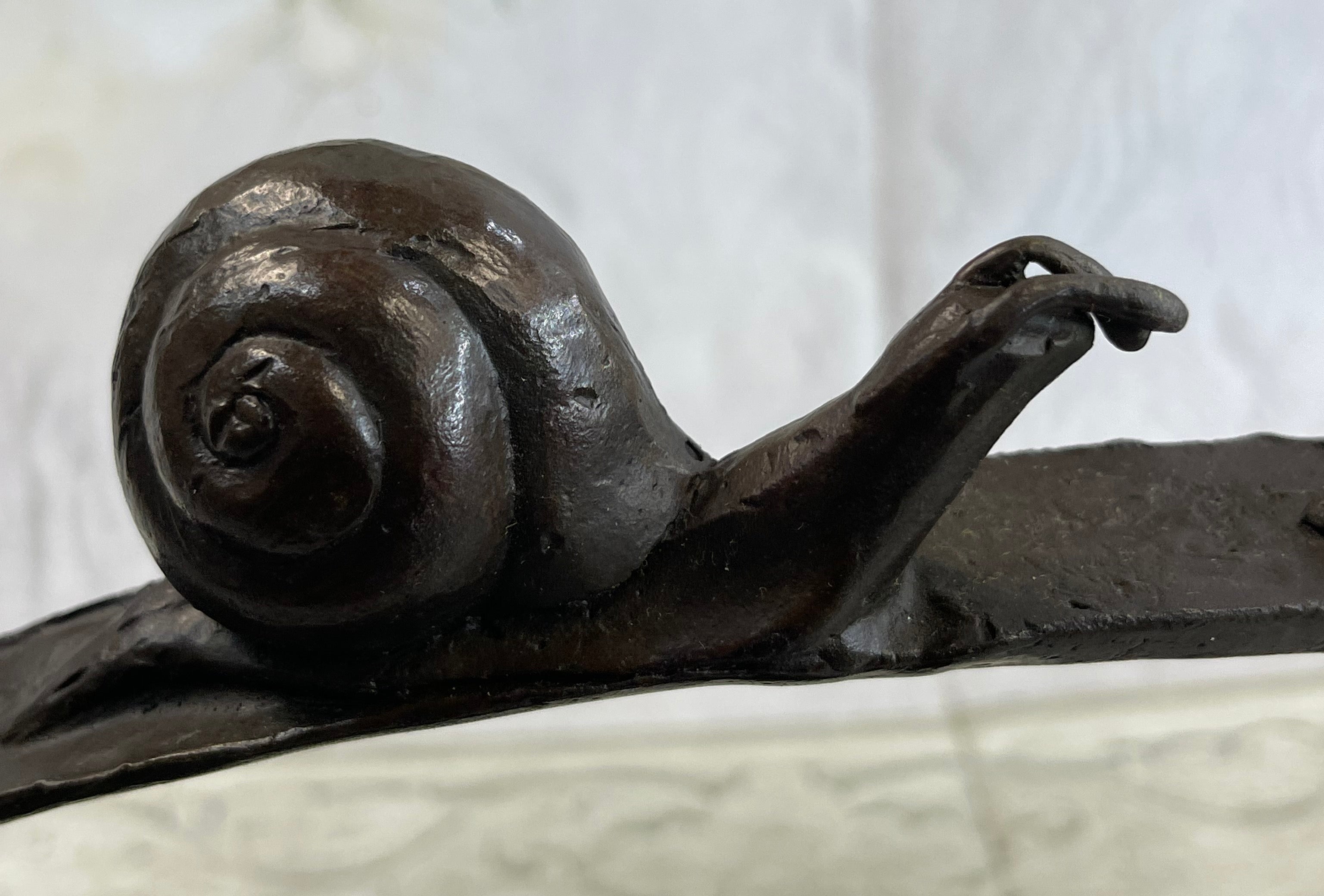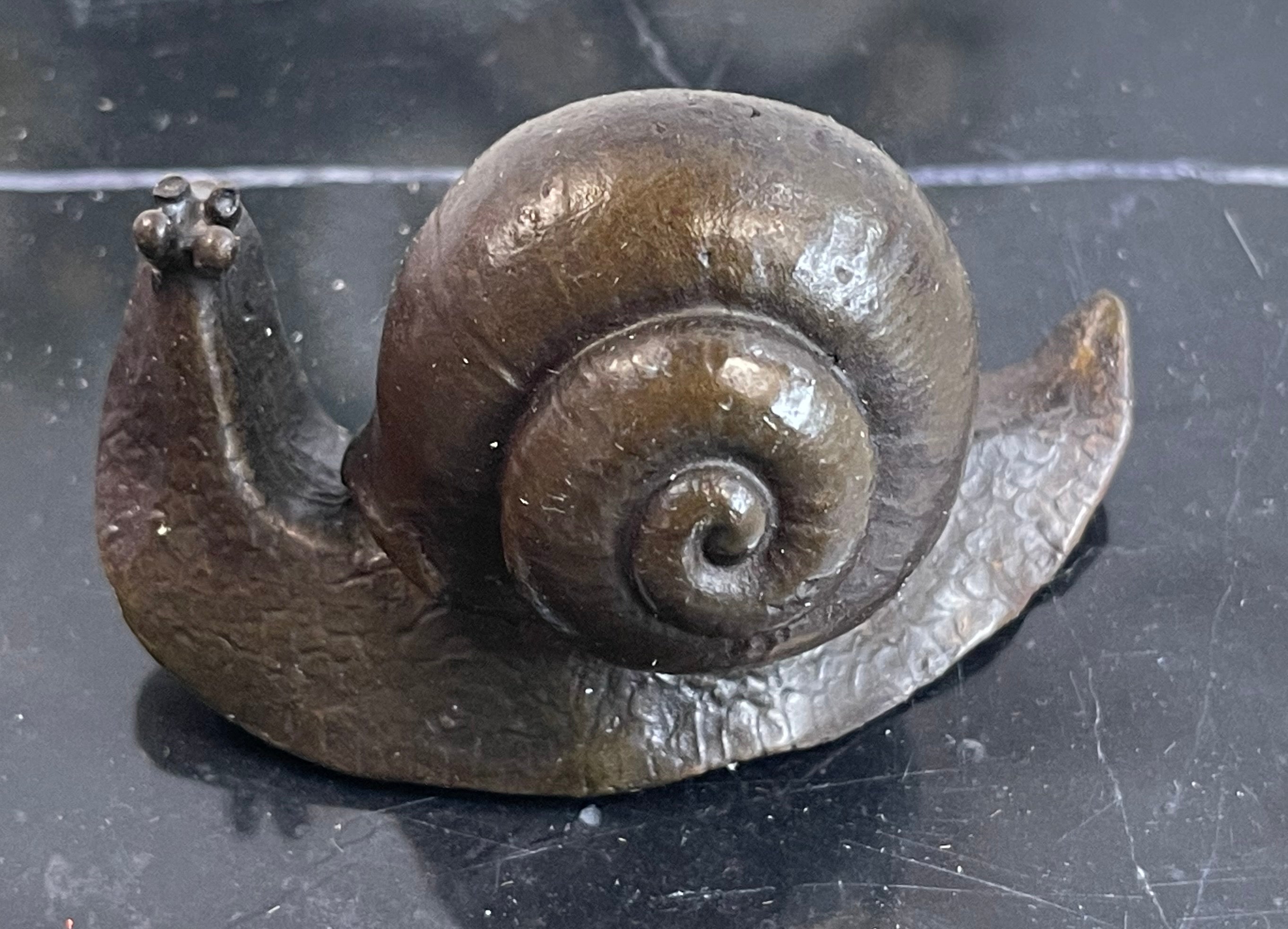 Bio of Charles Payne:  Some of my first sculptures, I created my snail series in honor of my Dad, nicknamed “Snail” for his slow and steady pace. They all represent different journeys in our lives. I first used the Art Nouveau designs on these creatures because I felt they wereoverlooked and underappreciated, much like my Dad.     While their shape is simple, their designs show the playful and creative journey on which life leads them. We have all seen the crazy trails left by snails as they travel on their slow journey. The polished body fold along their side helps to convey a sense of movement – albeit slow!Bronze Dimensions with Marble Base:Height 10" x Width 18"