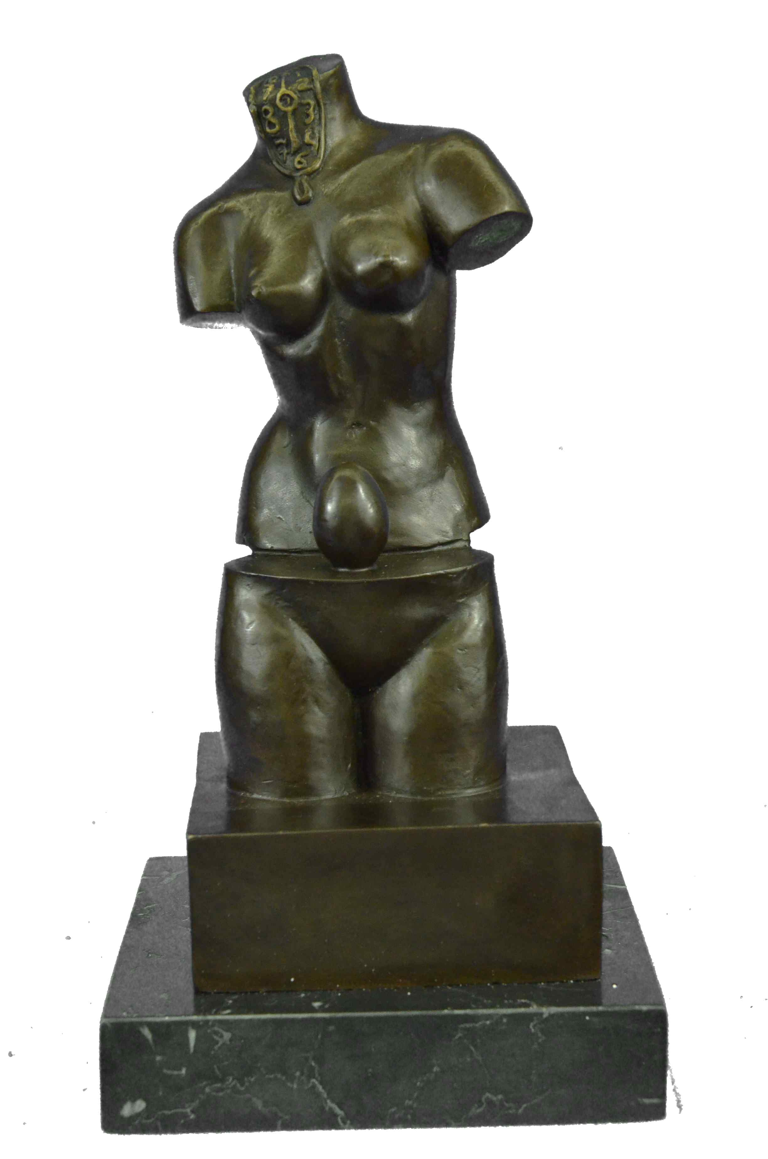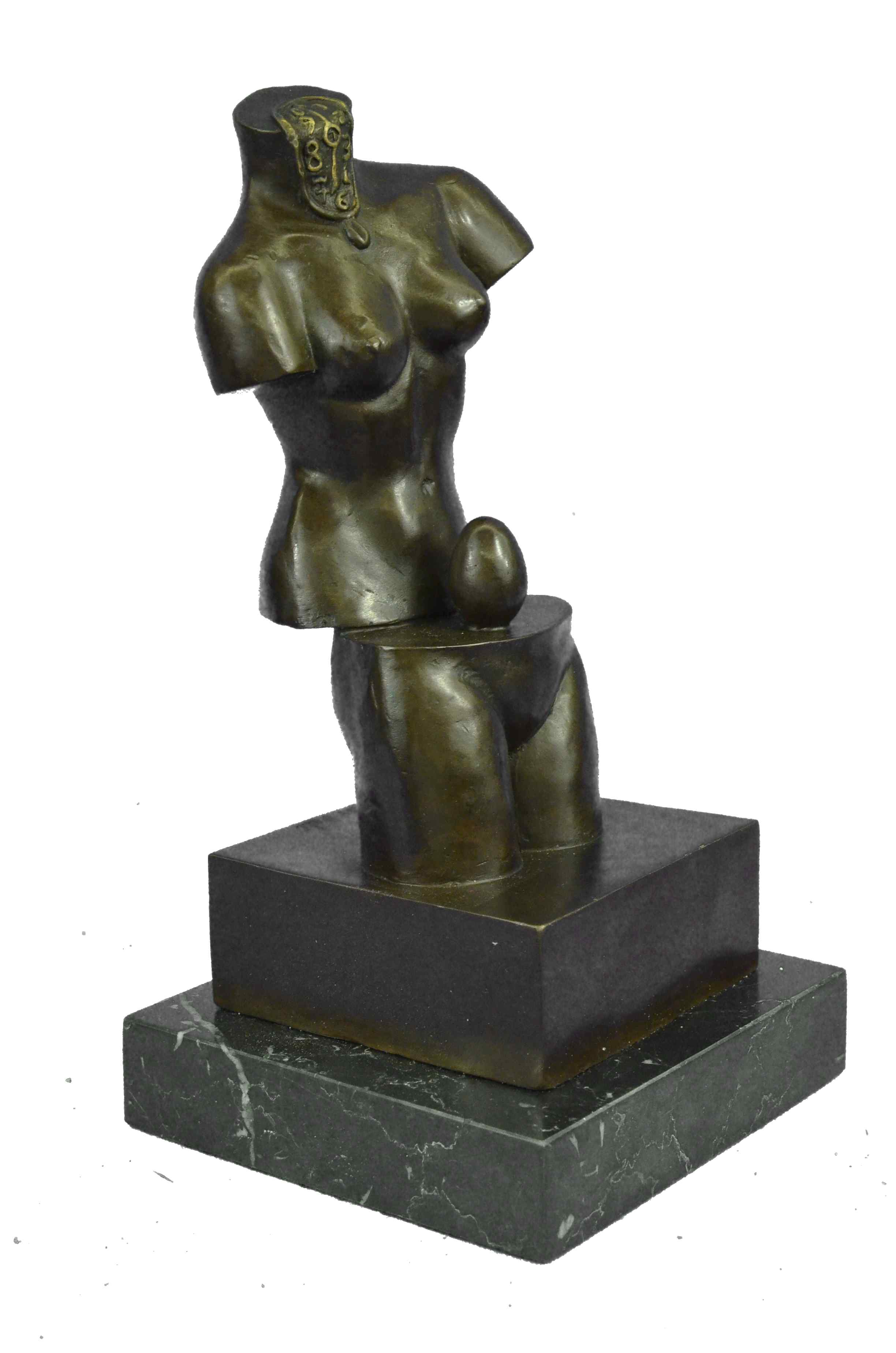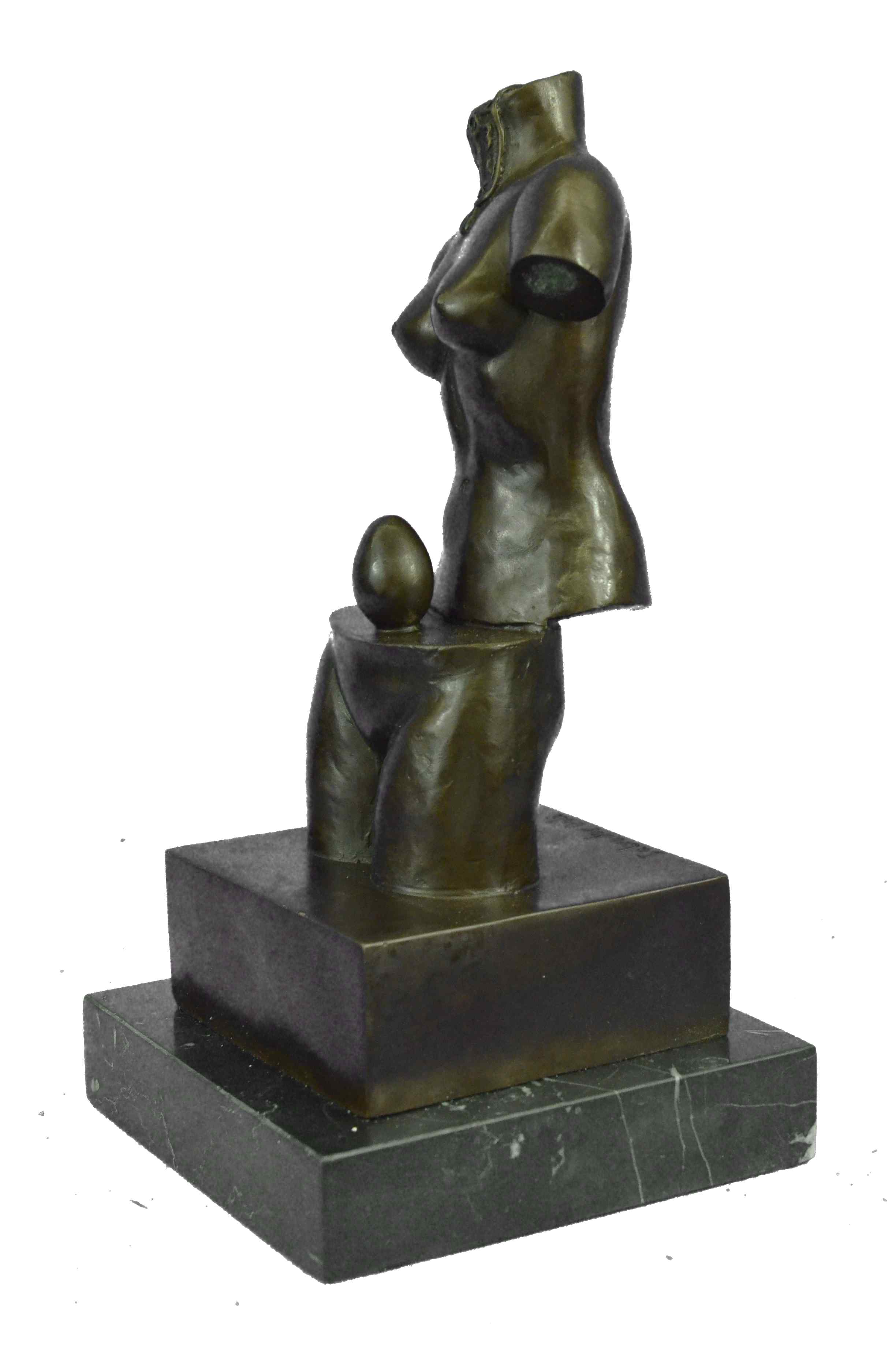Space Venus is Dali’s goddess of beauty although headless and without arms. It is divided into two parts that reveals an egg, a symbol of life, continuation and hope. This bronze sculpture was cast using the "Lost Wax Method" ensuring quality of detail. This bronze sculpture has a special hand painted brown color patina. Mounted upon a Brown marble base and is signed by Artist Salvador Dali.Bronze Dimensions with Marble Base:Height 12" X Width 6"