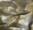 This graceful bronze sculpture by L.F. Morau beautifully portrays a maiden standing as she drinks from a spring, a timeless symbol of purity and serenity. Her posture is elegant and natural, with a delicate balance as she rises barefoot onto her toes. Every detail captures the charm of the moment, from her poised stance to the quiet dignity expressed through her movement. She wears a flowing one-piece dress that drapes low to the floor, its folds rendered with remarkable realism. The garment gently grazes her feet, leaving only a subtle glimpse of her bare toes beneath. Her hair is styled neatly and pulled back, completing the image of sophistication and classical beauty. The artist’s sensitivity to form and detail enhances the sculpture’s lifelike presence. Handcrafted with the traditional lost wax method, the figure is finished in a warm brown patina that enhances its depth and texture. Resting on a polished double marble base, the piece exudes refinement and stability. Signed by L.F. Morau, this sculpture is both a celebration of feminine elegance and a testament to fine artistry, making it an ideal collectible for admirers of classic bronze work.