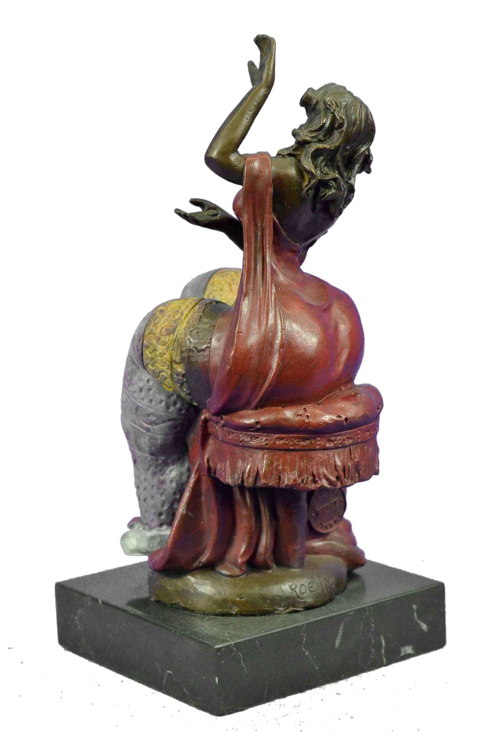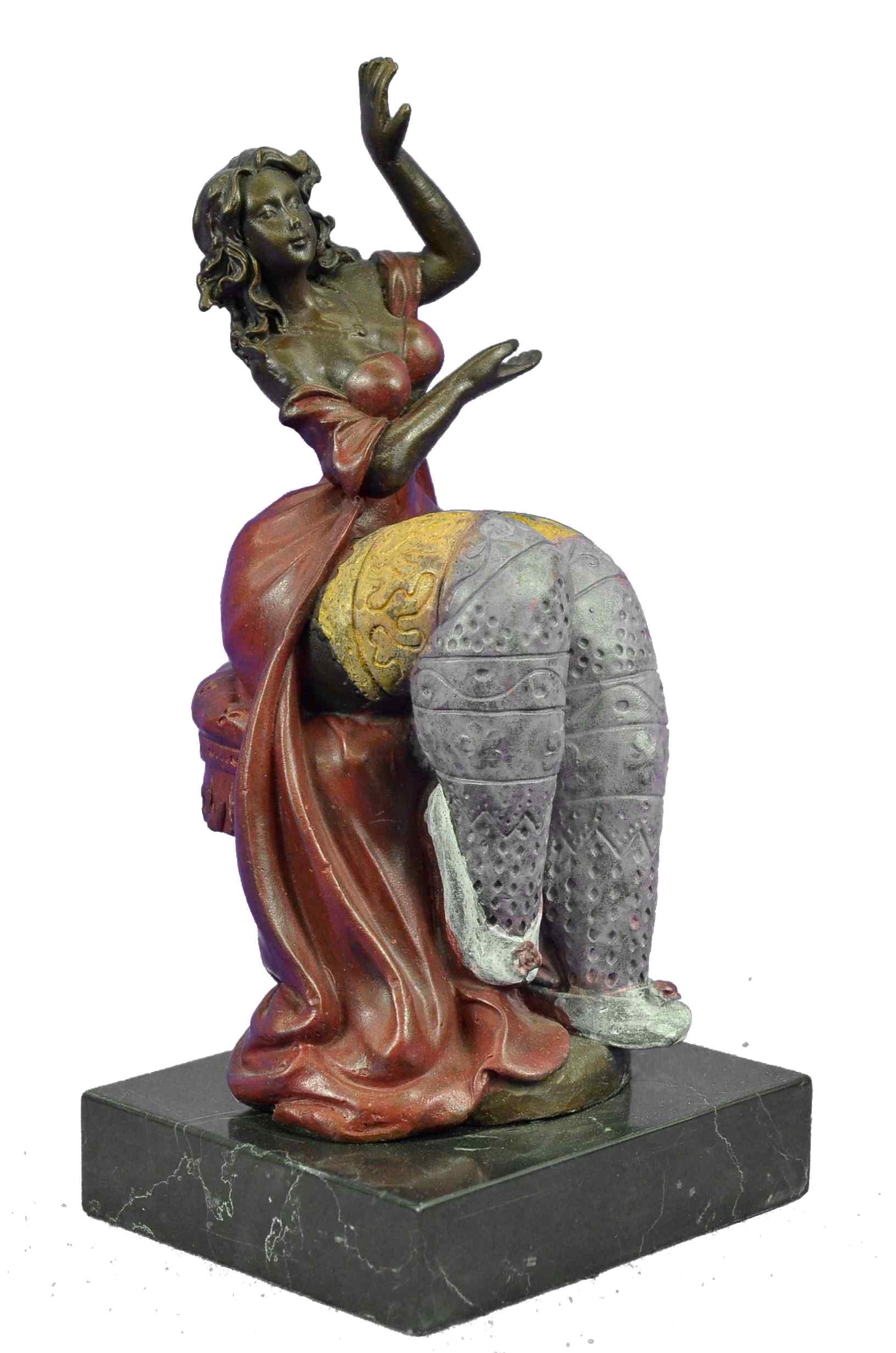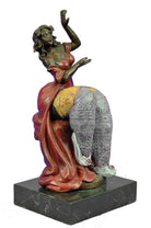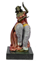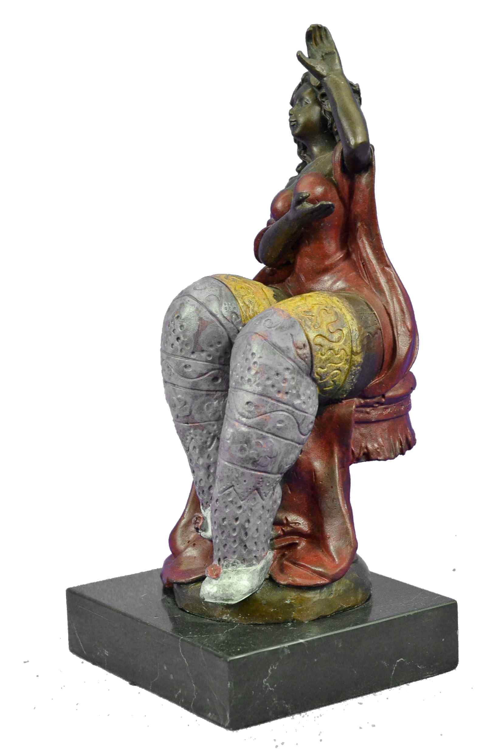 The curvy Lady Dancer is ready to make her next audition in her bikini customs. The composition recalls the Classical sense yet adopts a modern abstract flair that gives her body an added emphasis on her curvaceousness a tribute to Botero. She seems to coyly look up as if blushing due to the gushing admiration she gets from the beholder witnessing her body. The bronze sculpture was captured using the ancient method of lost-wax casting and finished with a brown patina stain for preservation. She is mounted upon a black marble base with the artist Roelna`s signature.Bronze Dimensions with Marble Base:Height 10.5" x Width 5"
