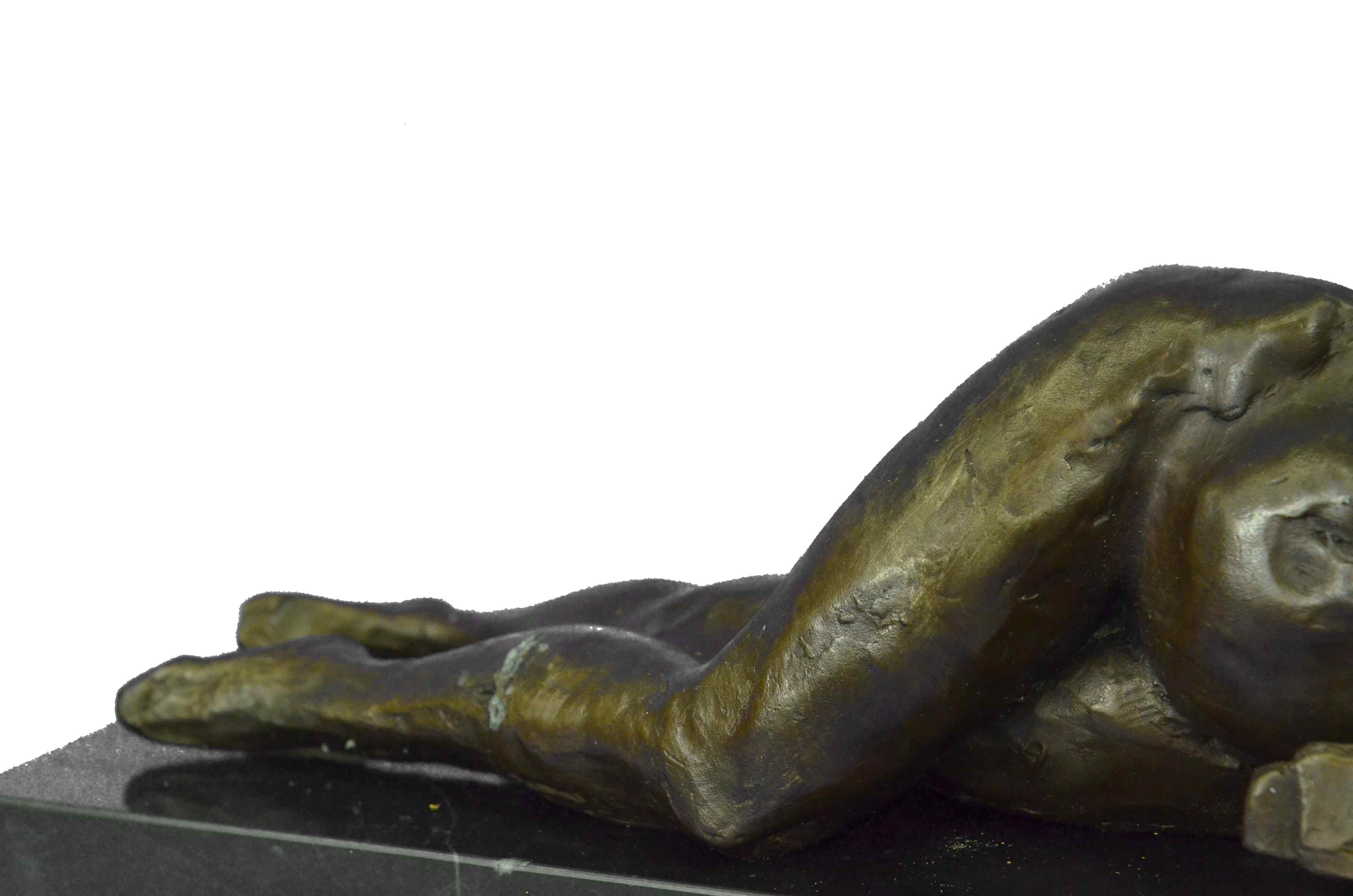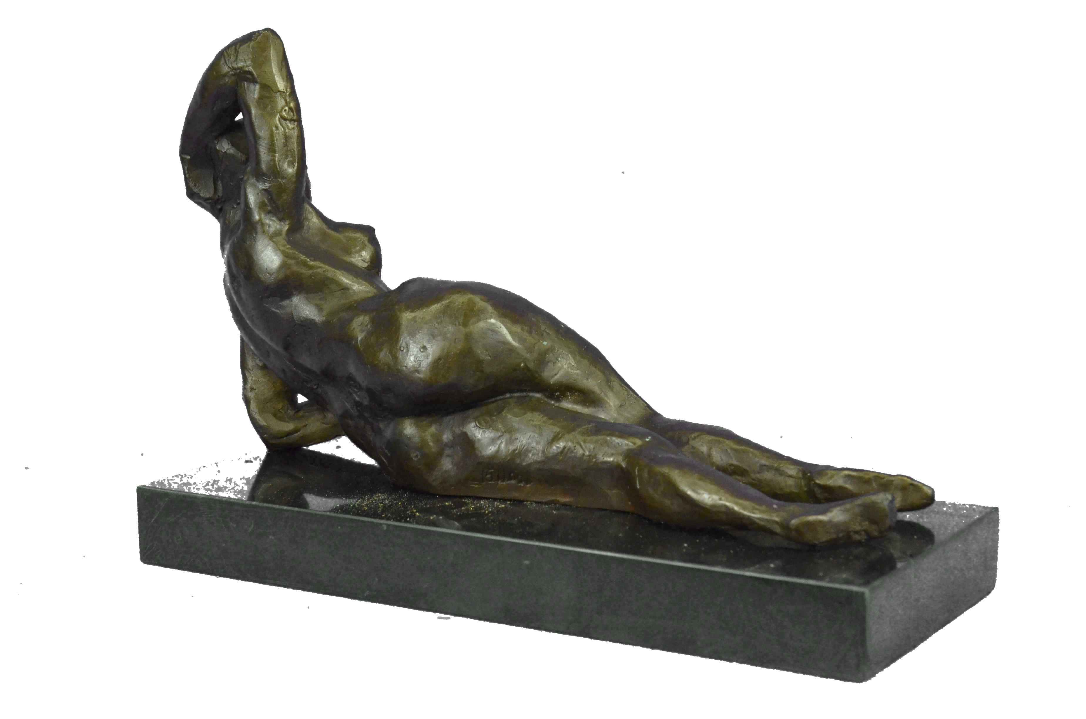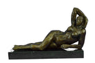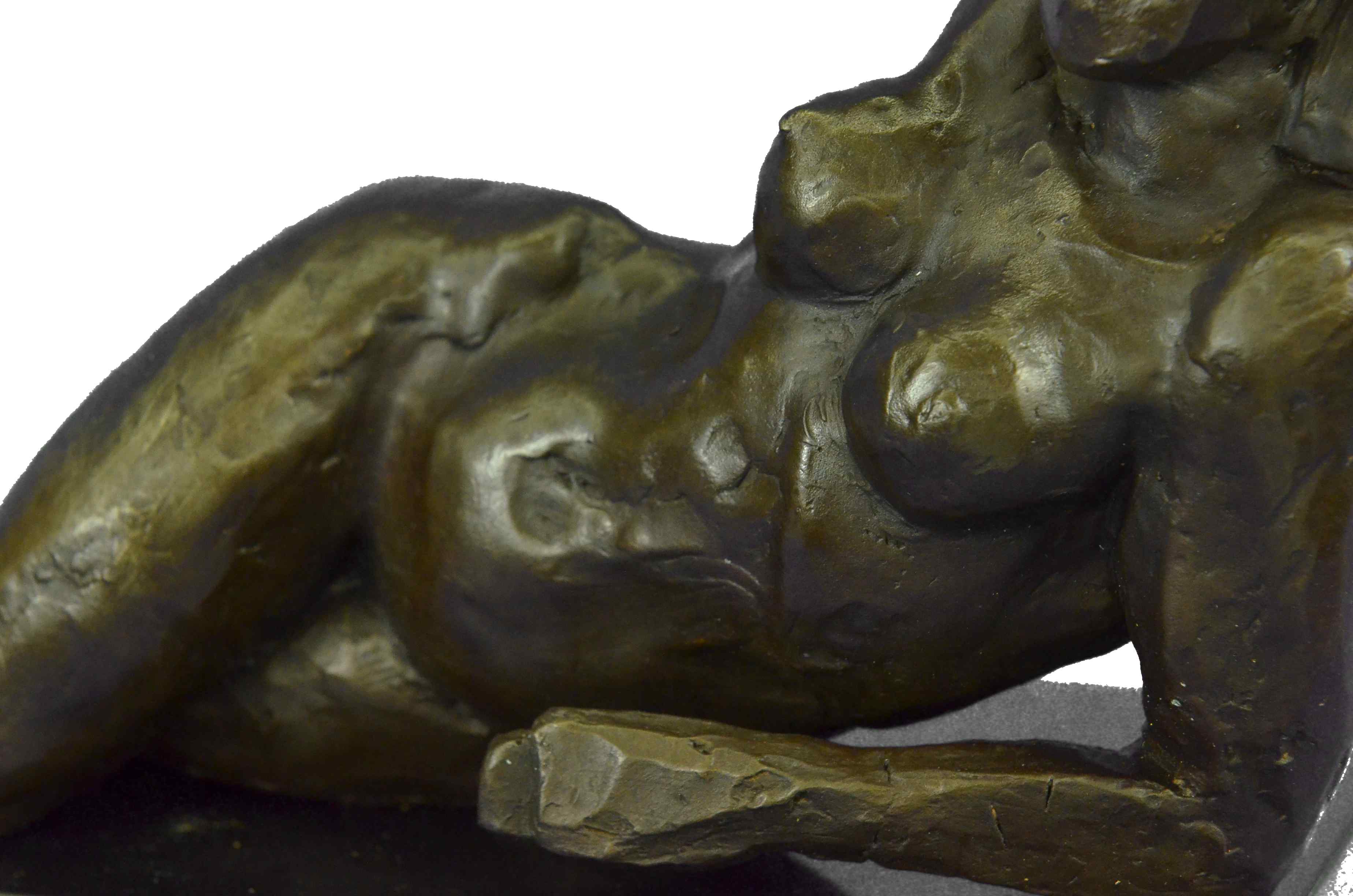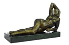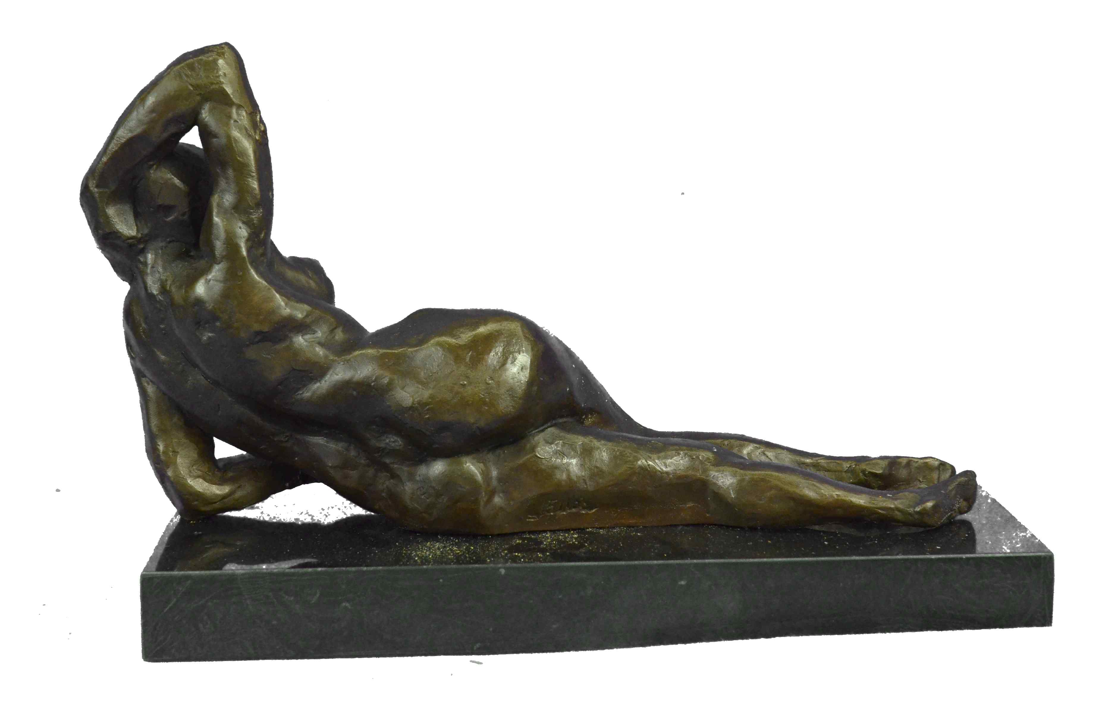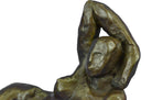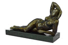Tribute to the artist Henry Moore abstract and representational style, the woman is proportionally exaggerated, giving a defined plumpness to every part of her form. The pleasantly full-figured lady lays on ground both calm and relaxed. Her head tilts dexterously upwards as she casts her eyes to the blue skies of a beautiful summer day. A sense of peace and happiness runs across her smile. Her left arms hangs downward onto her lap. Her right arm rest on the ground as if she were posing for the beholder. She was created using the lost-wax method of casting. This technique allows the molten precious metal to mold to the smallest detail of the artists cast. Fantastic detail is seen in the folds of skin on her stomach, neck and mouth. The 100% bronze sculpture with a brown patina finish is mounted upon a black marble and is numbered.Bronze Dimensions with Marble Base:Height 8.5" x Width 13"