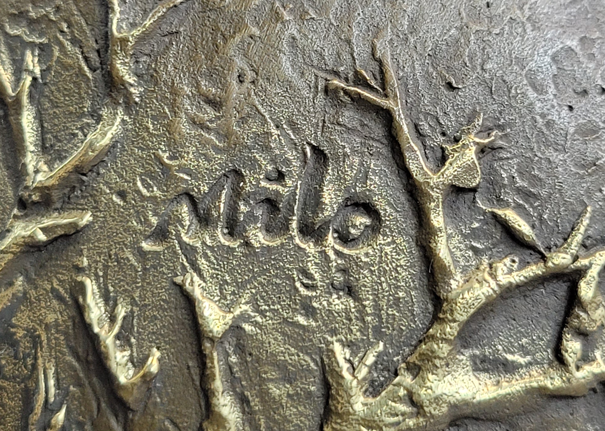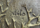 Standing tall on a sleek black marble base, this bronze sculpture commands attention with its striking presence. The artist's signature, Milo, ensures its authenticity and adds to its collectible value. The sculpture's brown patina finish, adorned with gold accents, adds depth and elegance to the piece, accentuating the curves and contours of the woman's figure.