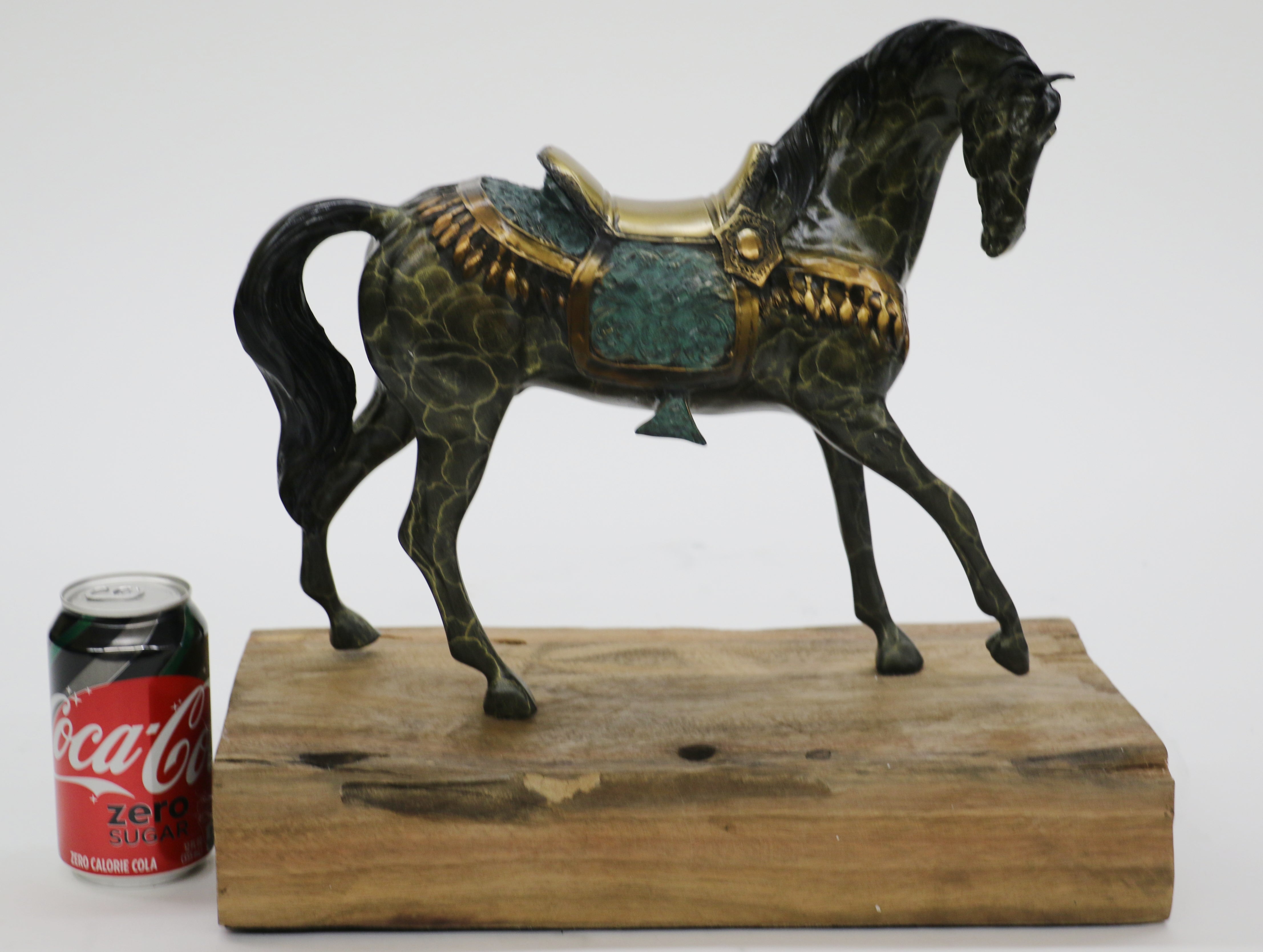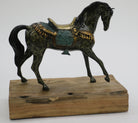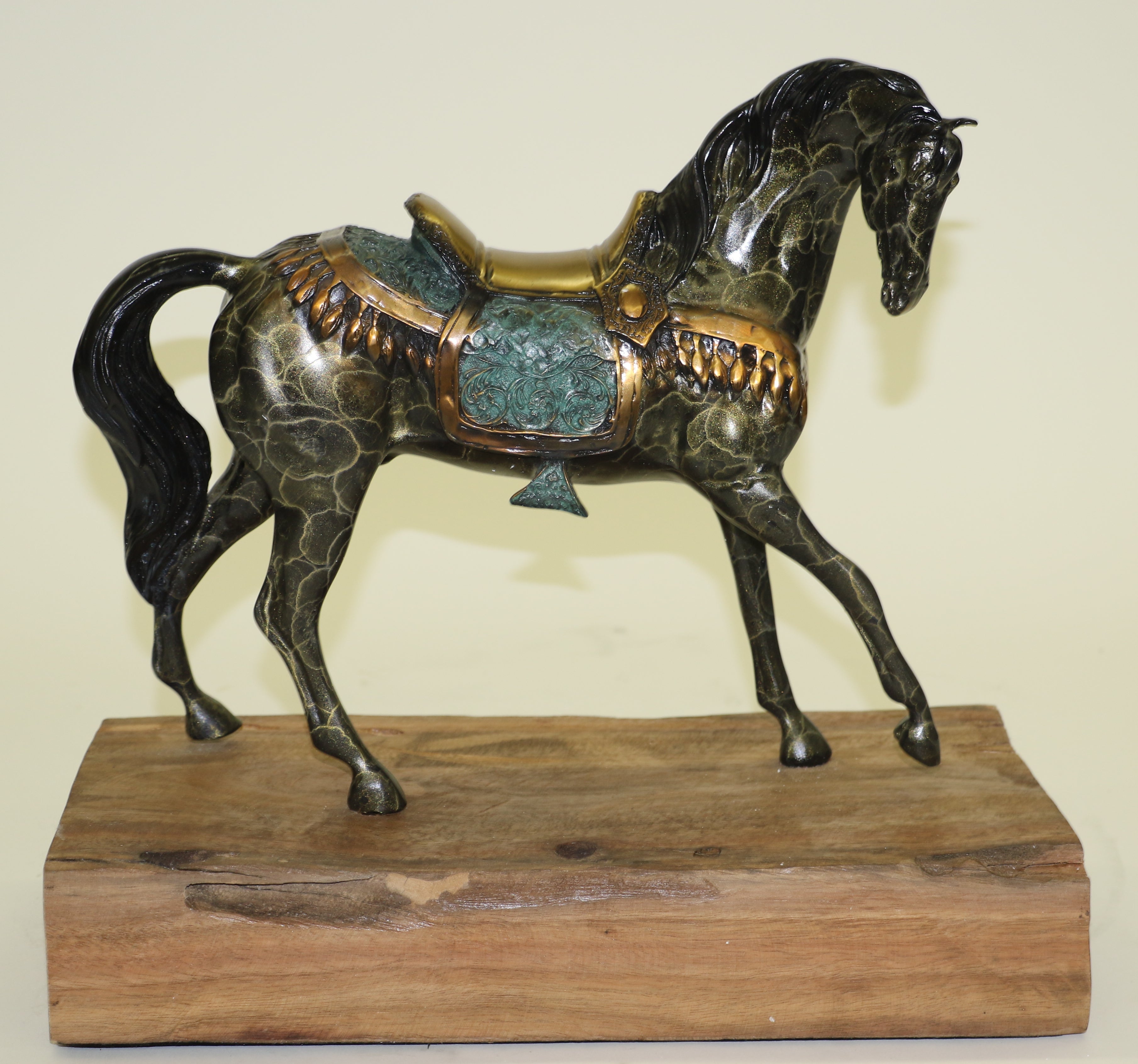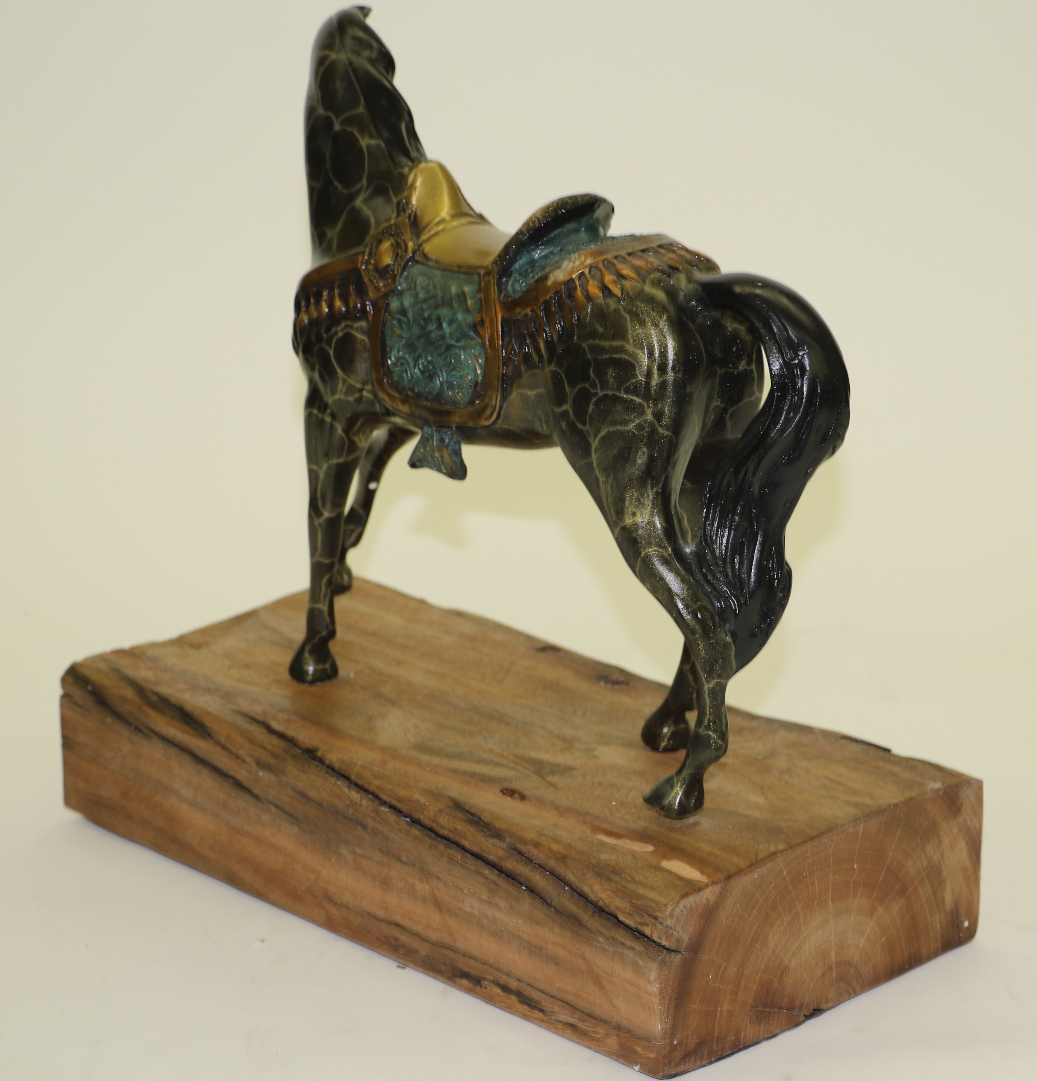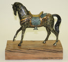 Horses are known and loved for their agility, graceful movement, strong bodies and sleek coat. They ignite a feeling of freedom and uncharted paths. This sculpture is perfect for any horse lover and collector. This horse has broken free of his reins, saddle and the restricting ranch he lived on. He trots freely in the open land. His eyes widened at the sight of soaring birds. 100% bronze and handmade, this Multi Color patina sculpture was cast using the "Lost Wax Method" and mounted on a natural Oak wood base. It is Created by the artist Milo.Bronze Dimensions with Wood Base:Height 14.5" x Width 15"