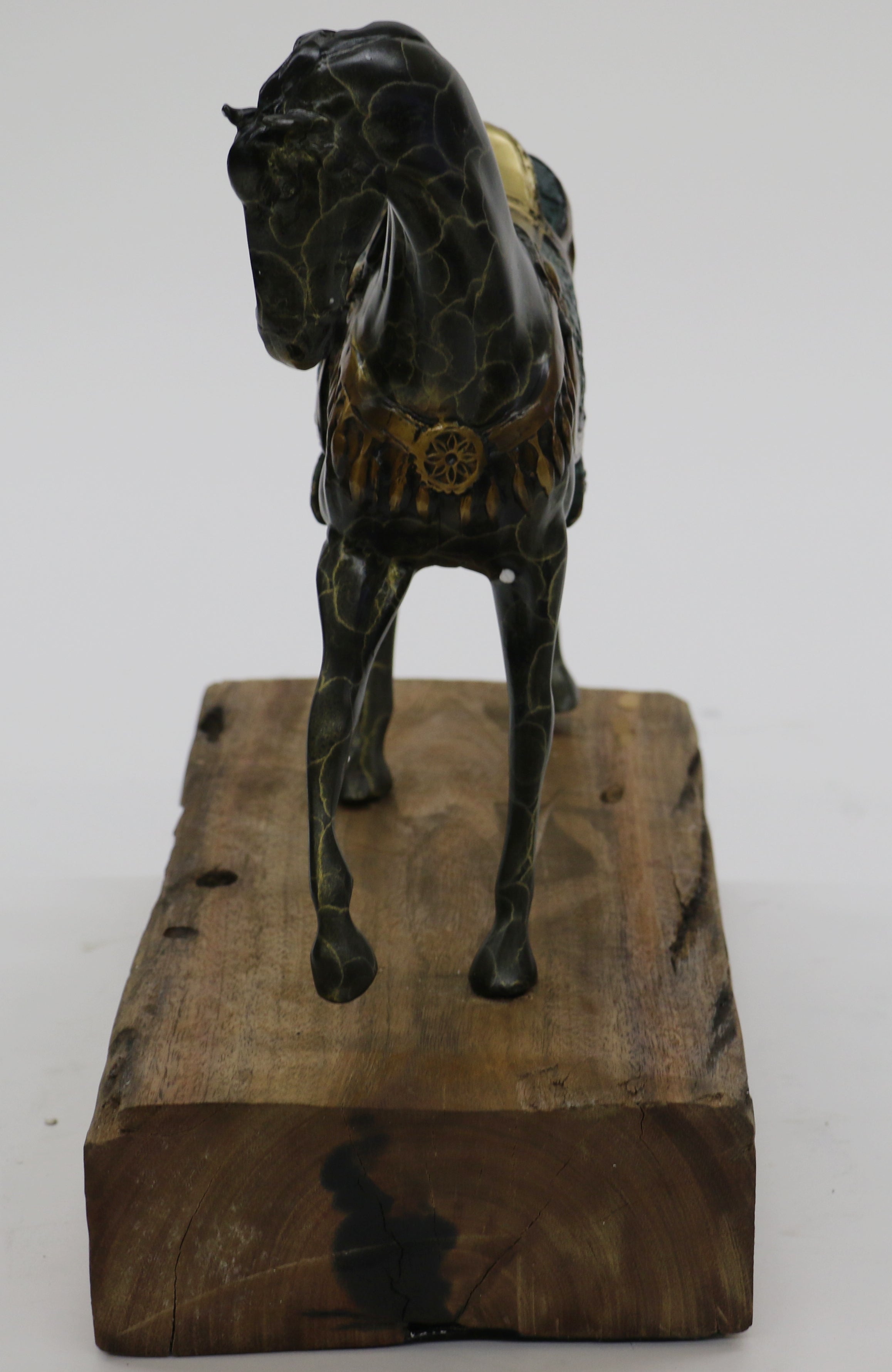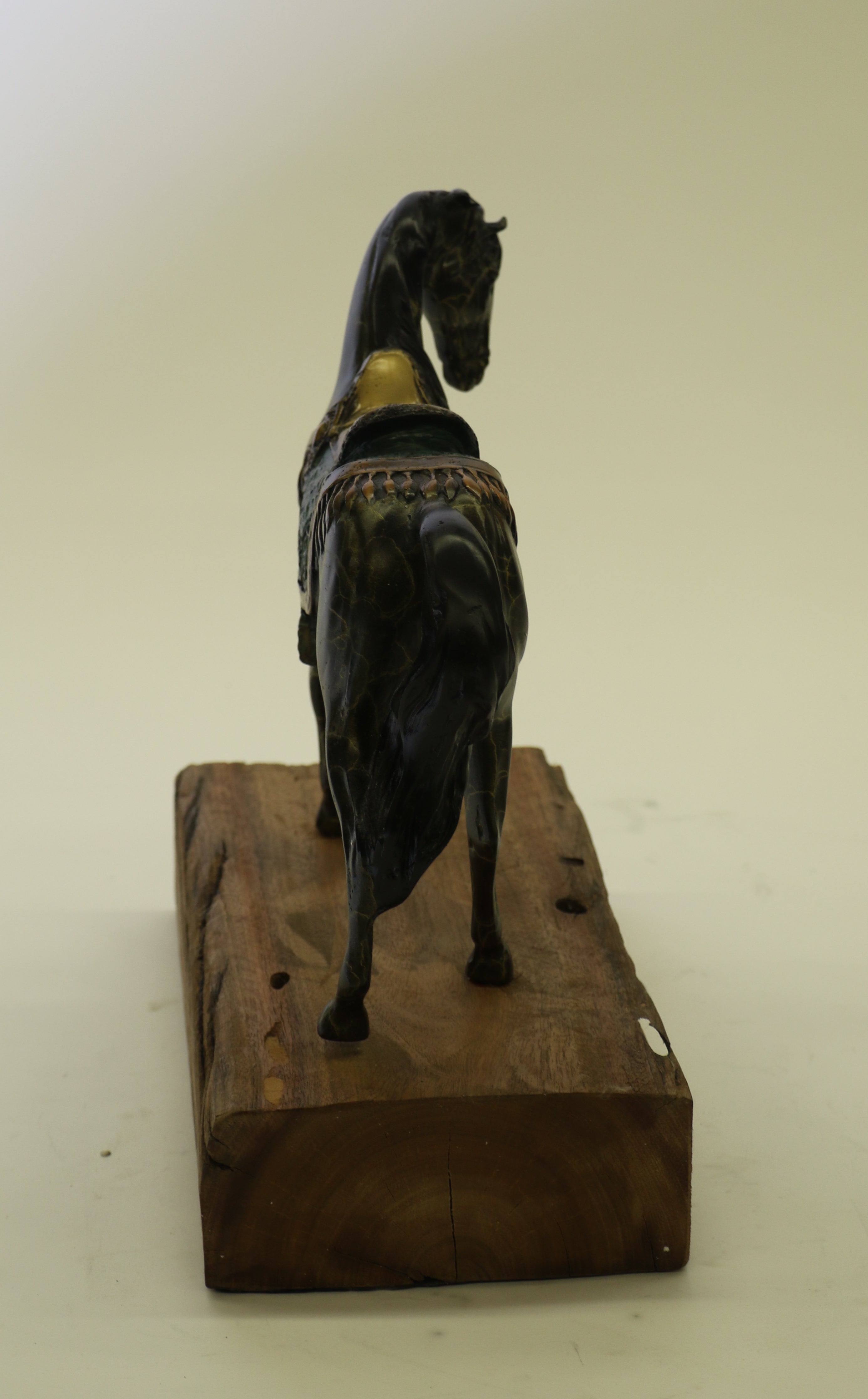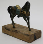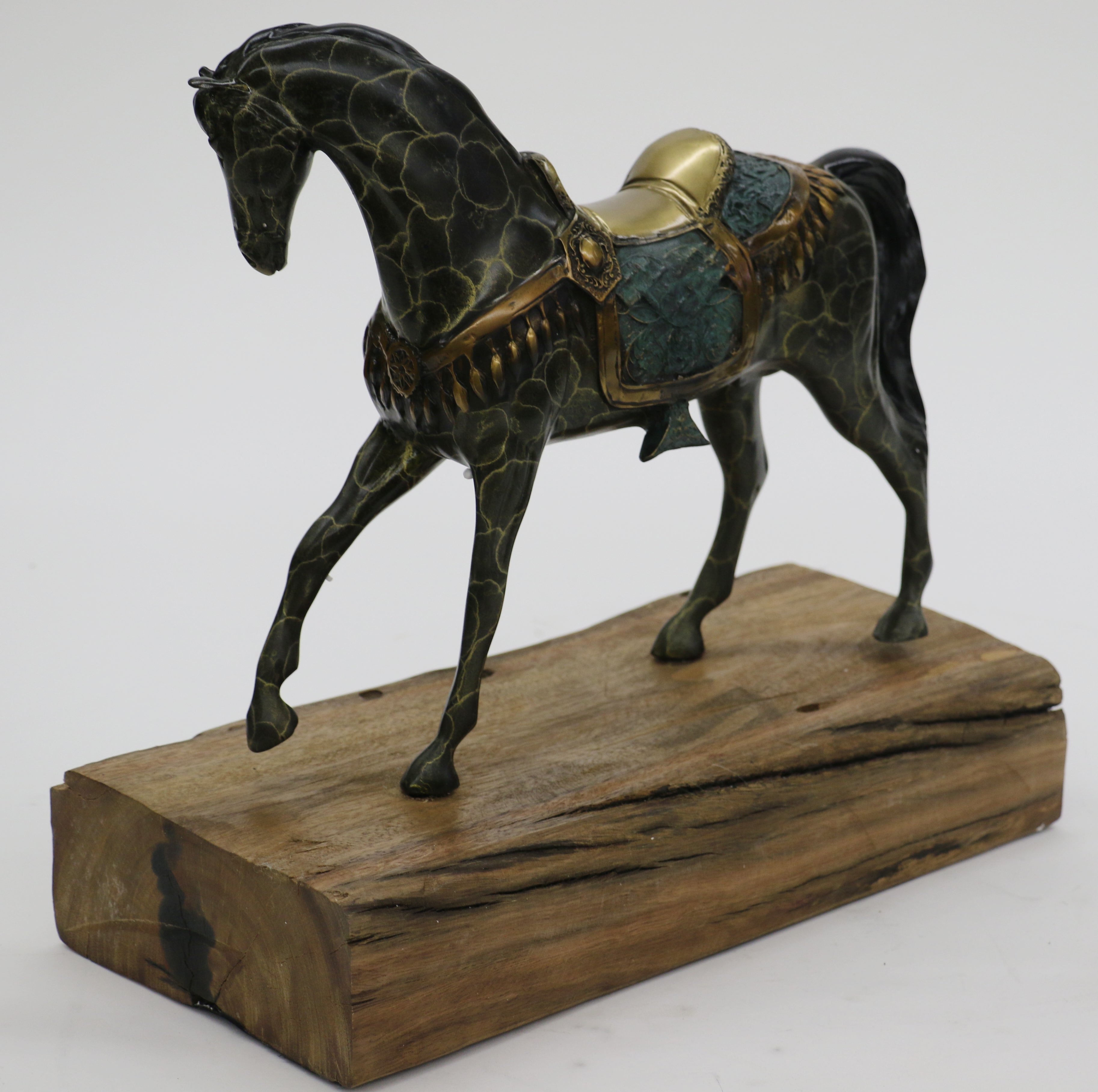 Horses are known and loved for their agility, graceful movement, strong bodies and sleek coat. They ignite a feeling of freedom and uncharted paths. This sculpture is perfect for any horse lover and collector. This horse has broken free of his reins, saddle and the restricting ranch he lived on. He trots freely in the open land. His eyes widened at the sight of soaring birds. 100% bronze and handmade, this Multi Color patina sculpture was cast using the "Lost Wax Method" and mounted on a natural Oak wood base. It is Created by the artist Milo.Bronze Dimensions with Wood Base:Height 14.5" x Width 15"