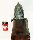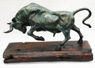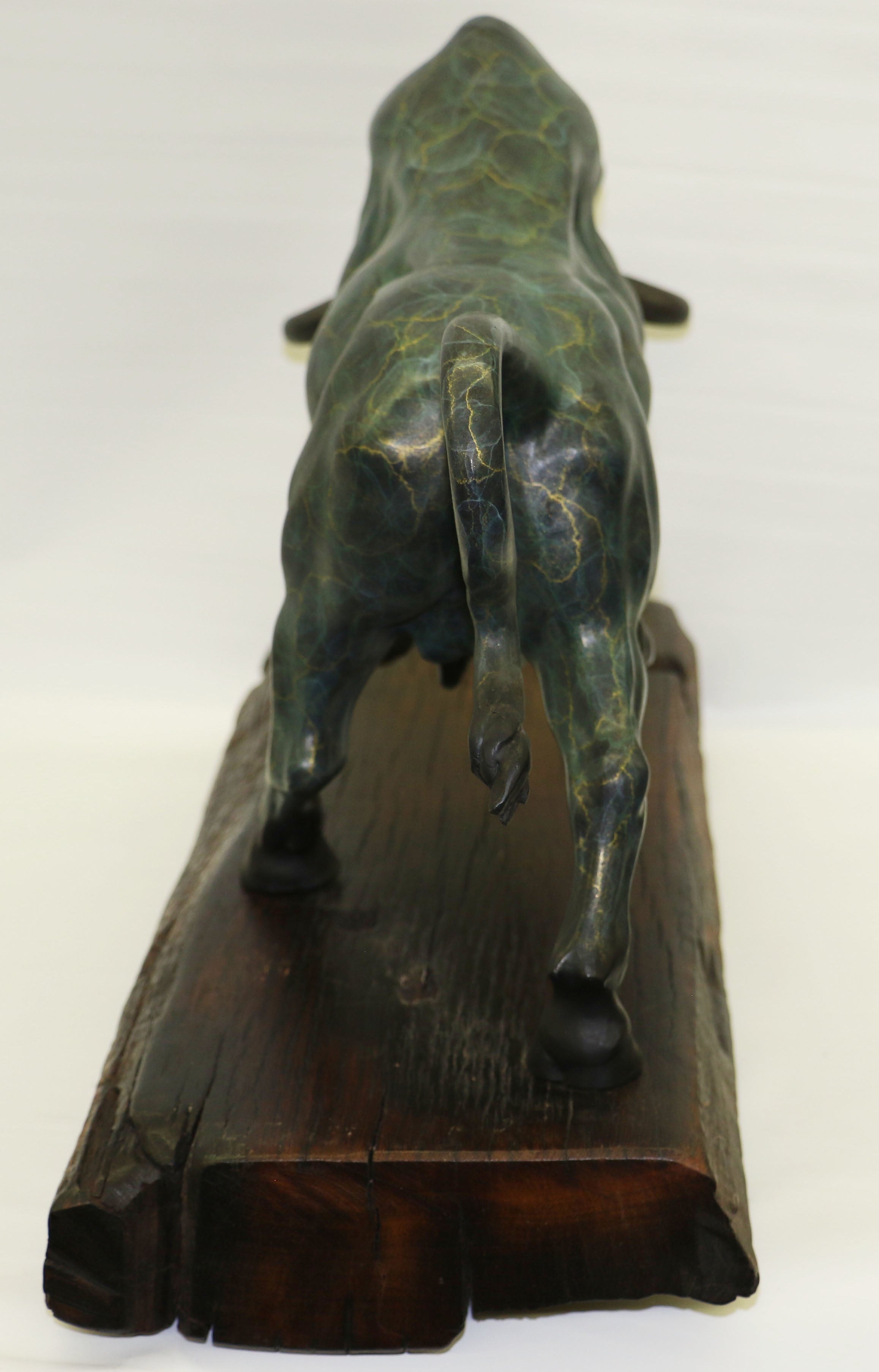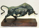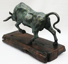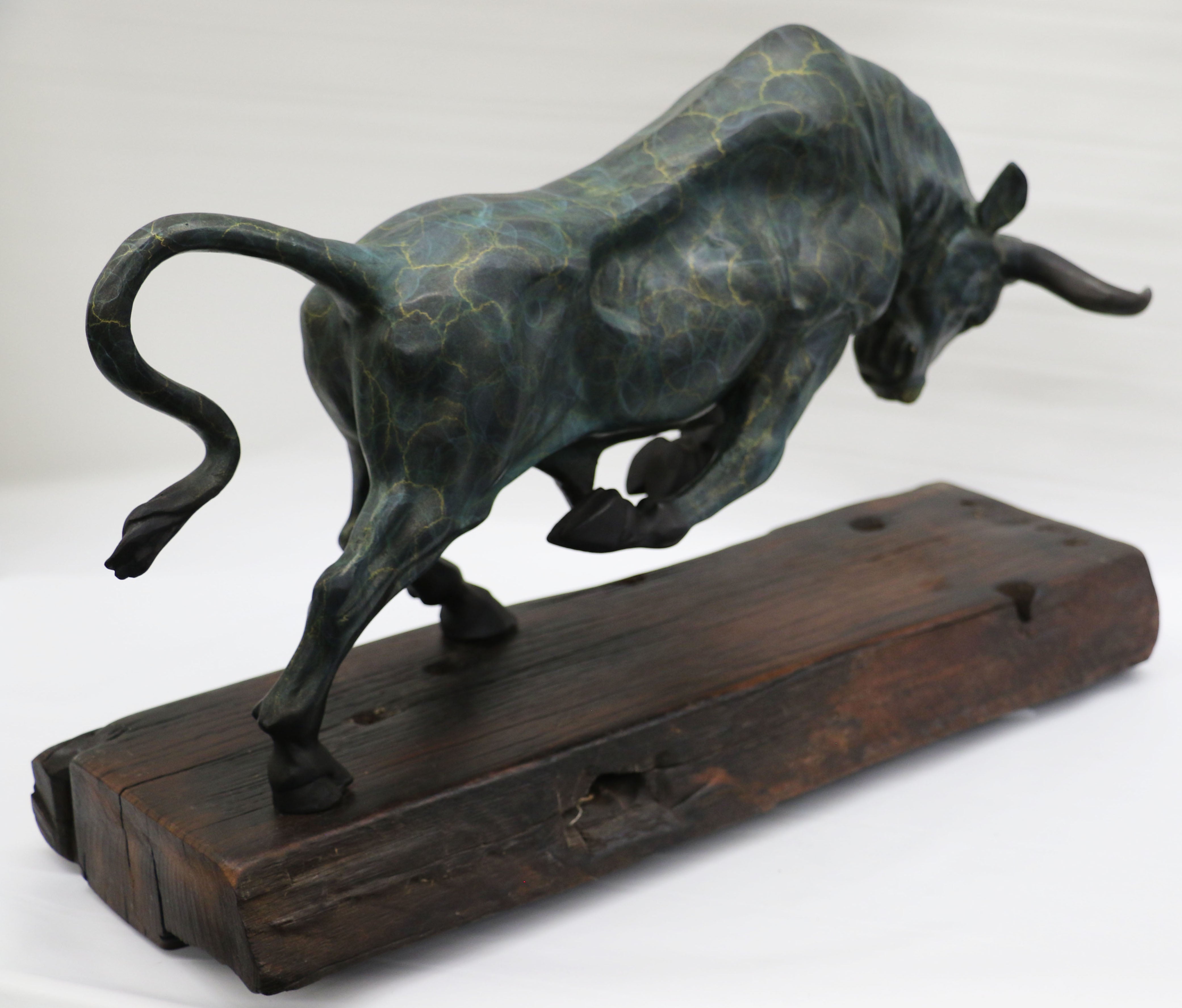 bullfight. The arena is in your home with this spanish bull sculpture. Bullfighting is a traditional spectacle of Spain, Portugal, some cities in southern France and in several Latin American countries. It can be considered a blood sport for both the bull or the brave matador that faces it in the ring. This large Green patina bull is in motion and hunting for its next target.Once he sets his eyes on you there's no stopping him. He digs his hooves in, lowers his horns and barrels through. 100% bronze, handmade and fully detailed this sculpture was cast using the "Lost Wax Method". It is mounted on a natural Wood base.Bronze Dimensions with Wood Base:Height 14" x Width 20"