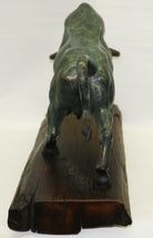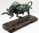 Large Special Patina Stock Market Bull With Natural Wood Base Bronze Sculpture