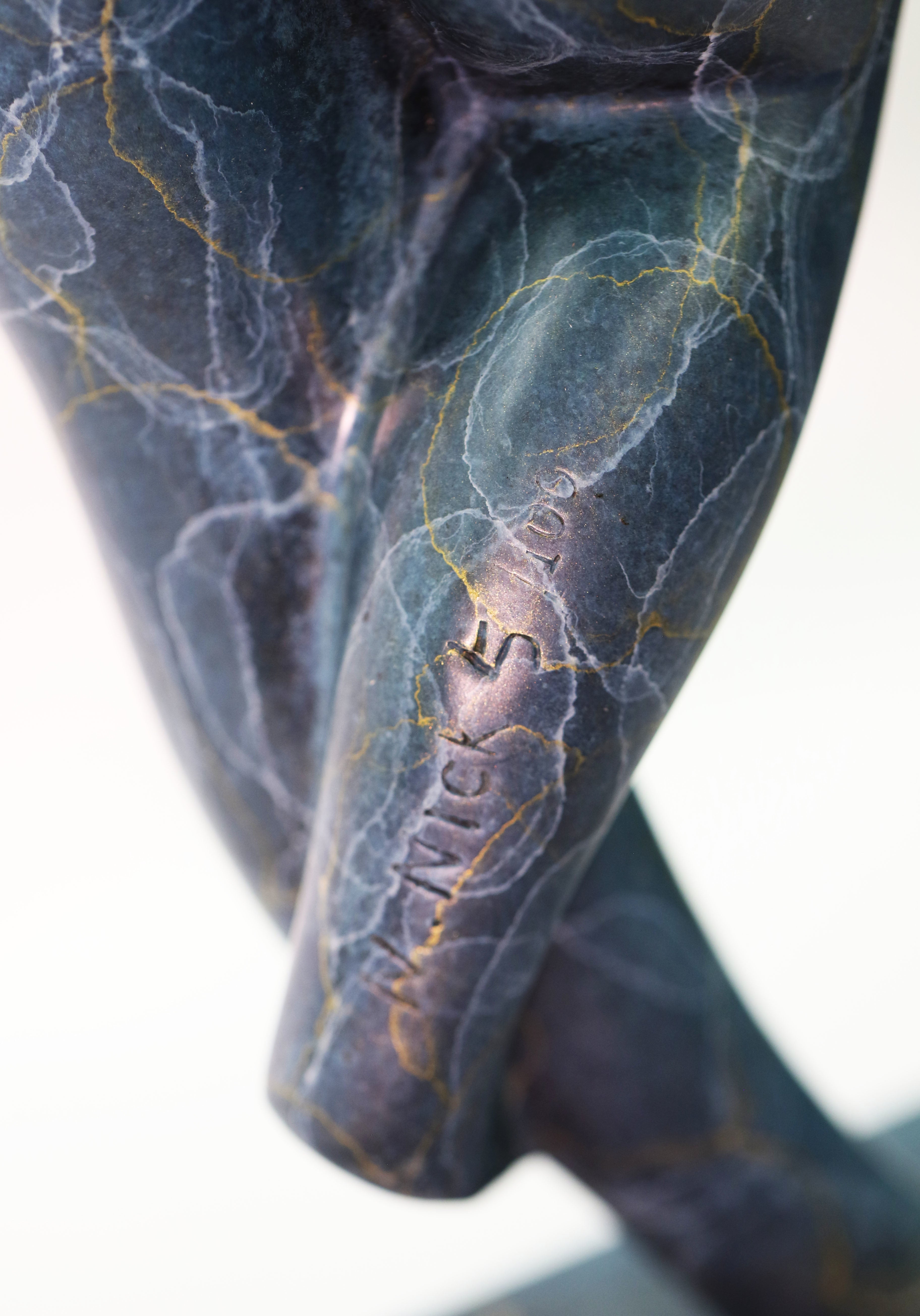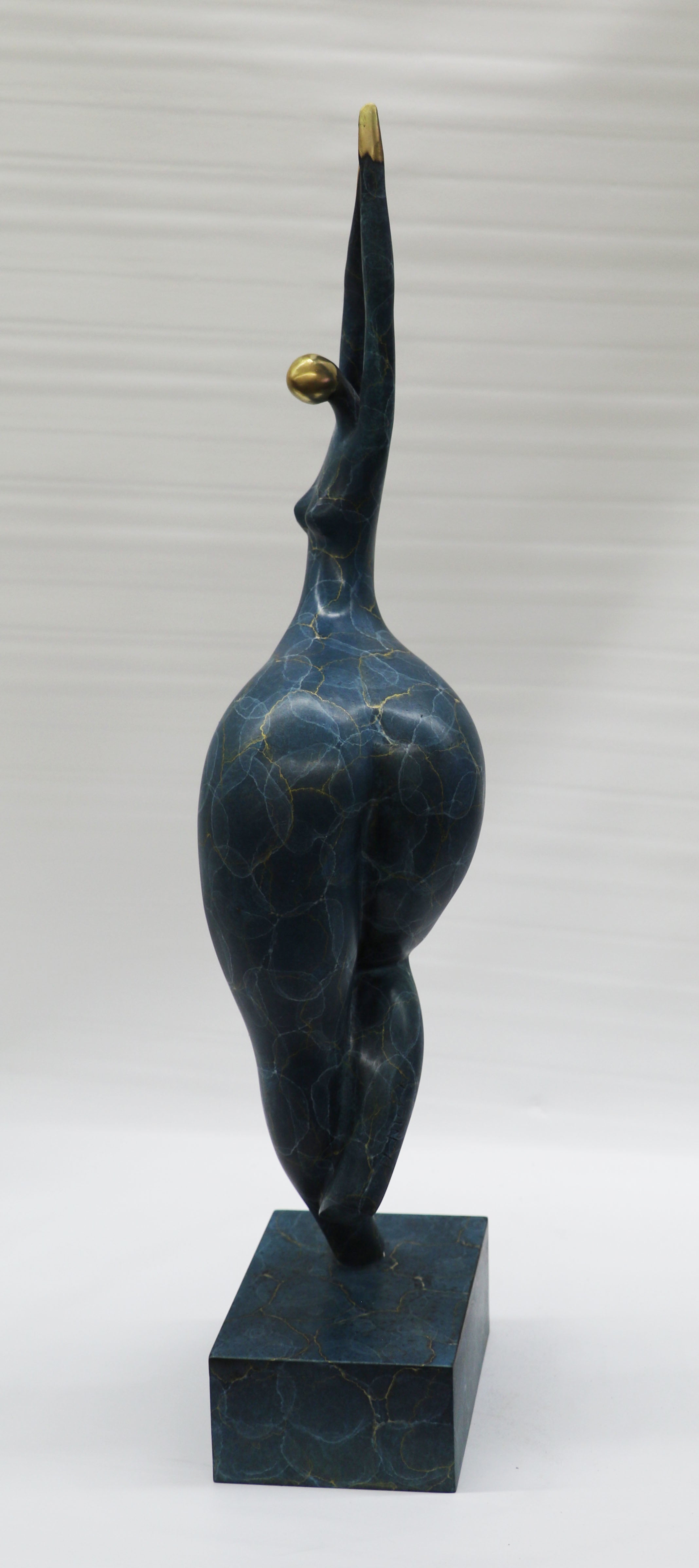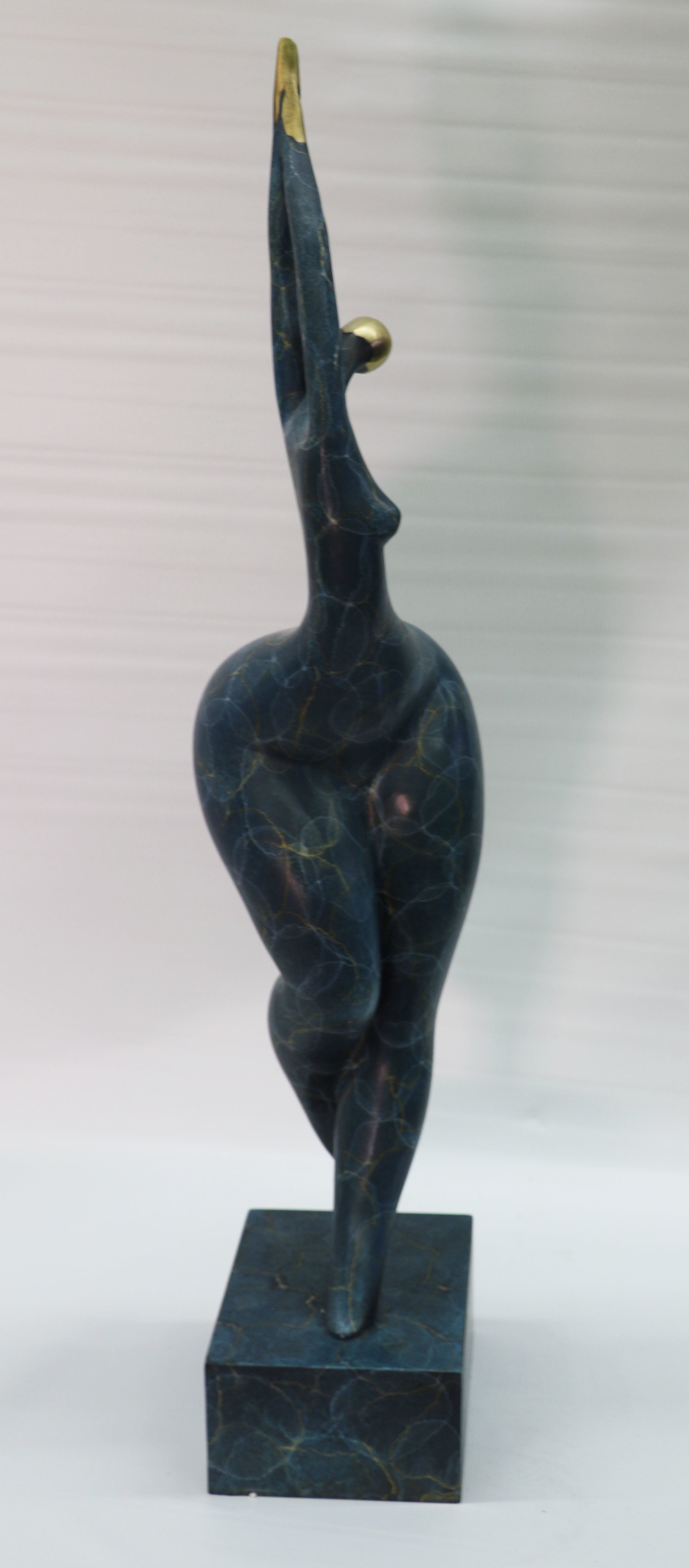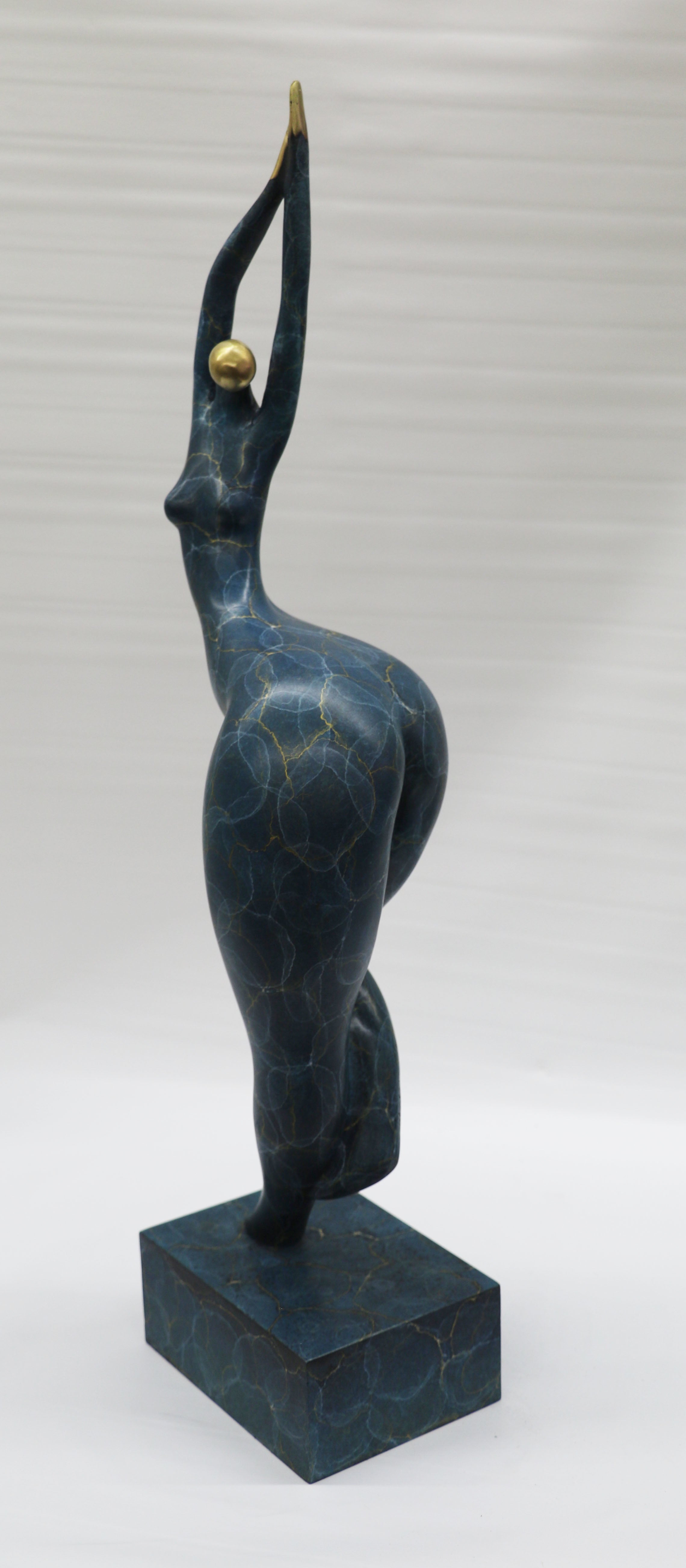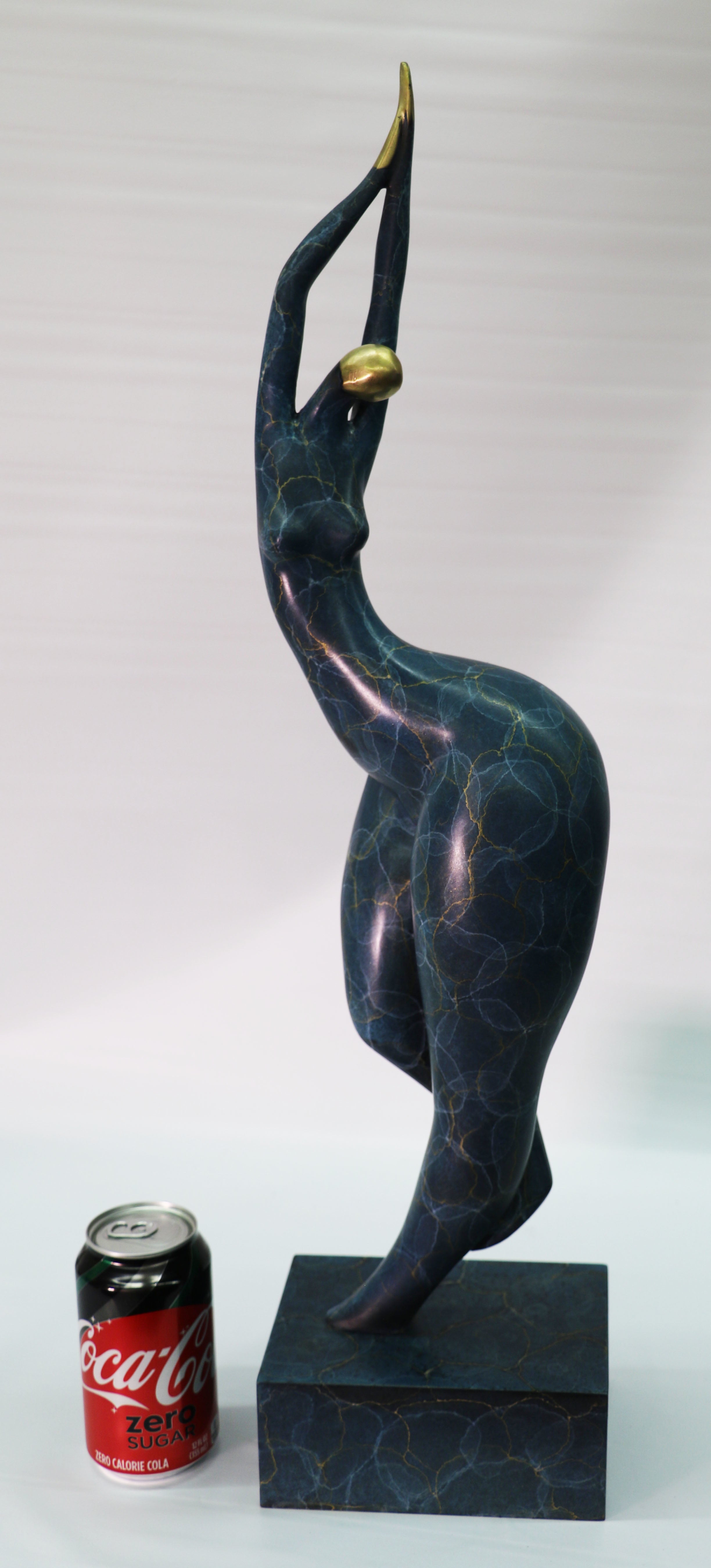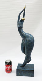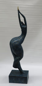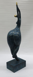 The pirouette is one of the most famous ballet movements wherein the dancer spins around on demi-pointe on one leg. The other leg can be in various different positions.This calm ballerina is in the process of completing a pirouette. Her leg is fully extended as she effortlessly completes the move. Her green patina camisole dress flows gracefully in accordance with her movement and is signed and numbered by artist Mario Nick.Bronze Dimensions :Height 26.5" X 6"