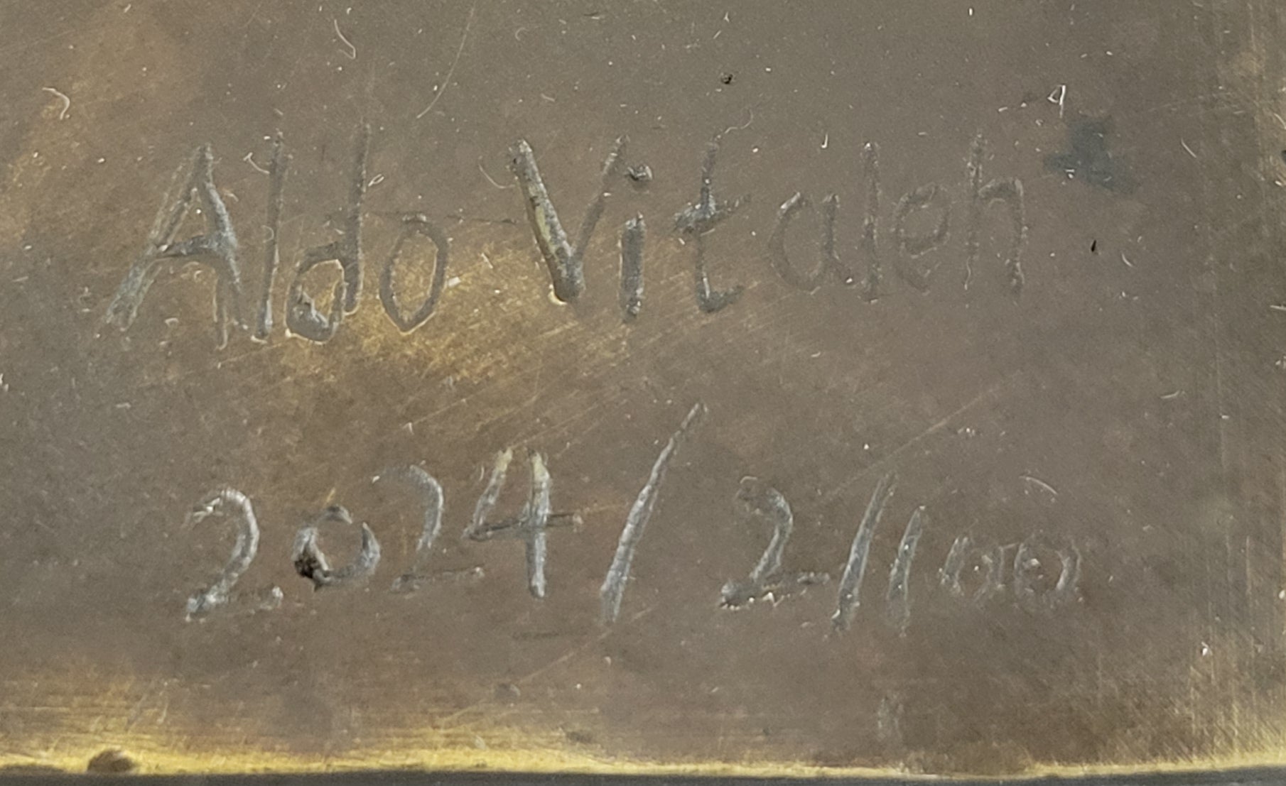 Expertly handcrafted using the lost wax method, this sculpture demonstrates exceptional skill and attention to detail. The smooth surfaces and intentional asymmetry are accentuated by a warm brown patina, which adds richness and depth to the bronze. The organic flow of the form reflects Vitaleh’s distinctive artistic voice, merging traditional technique with a modern sensibility.