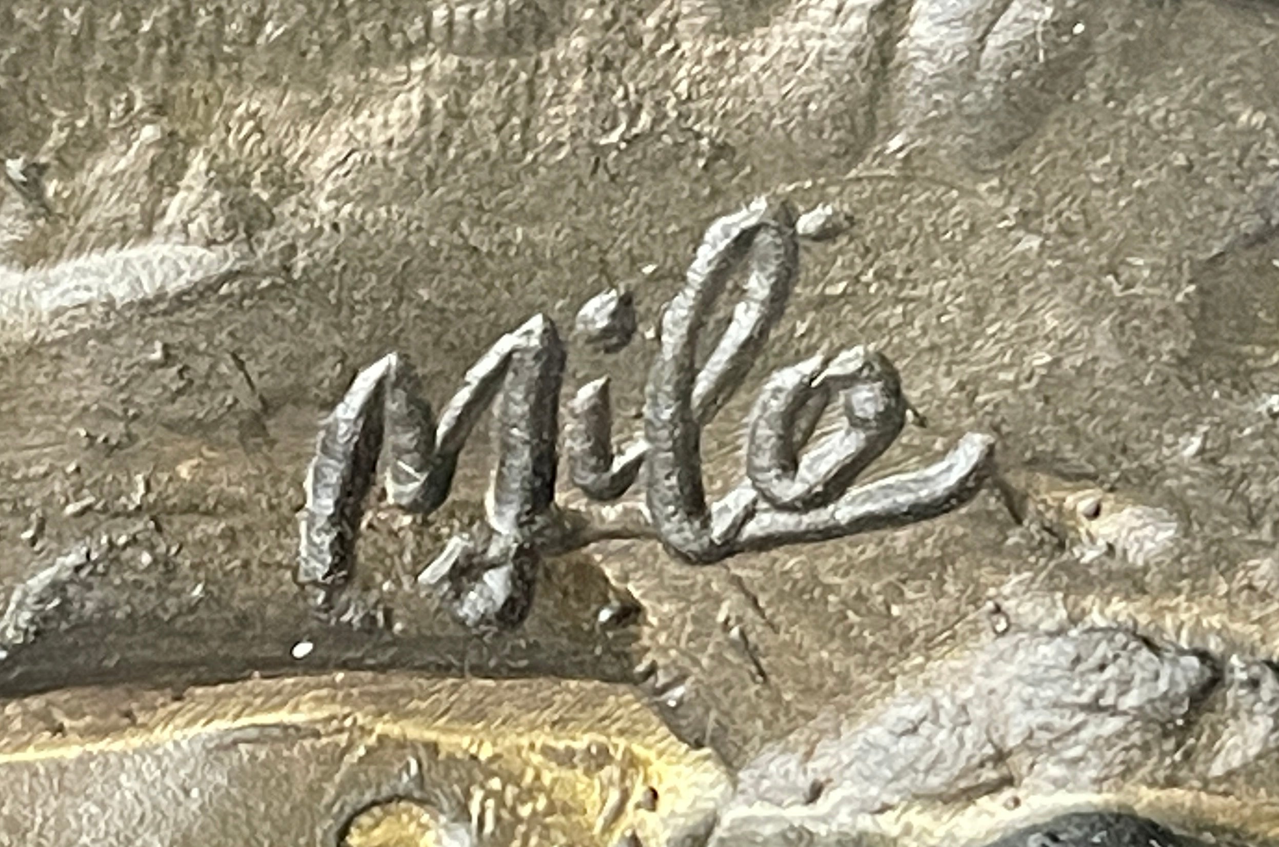 This artwork pays homage to the cultural significance of the moose in Native American lore, symbolizing attributes such as headstrong determination, unstoppable resilience, longevity, and integrity. The abstract and unrefined texture of the sculpture's surface adds a tactile dimension to the artwork, enhancing its visual impact and evoking a sense of connection with the natural world. Crafted using the timeless lost-wax casting method, the bull moose sculpture features a rich brown patina finish that further accentuates its lifelike appearance. Resting upon a black marble base and bearing the signature of the esteemed artist Milo, this sculpture is a tribute to the wilderness and the enduring spirit of the majestic moose.Bronze Dimensions with Marble Base: Height 12" X Width 12"