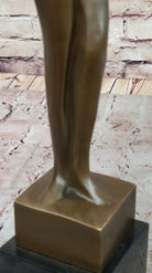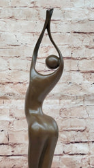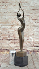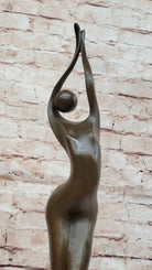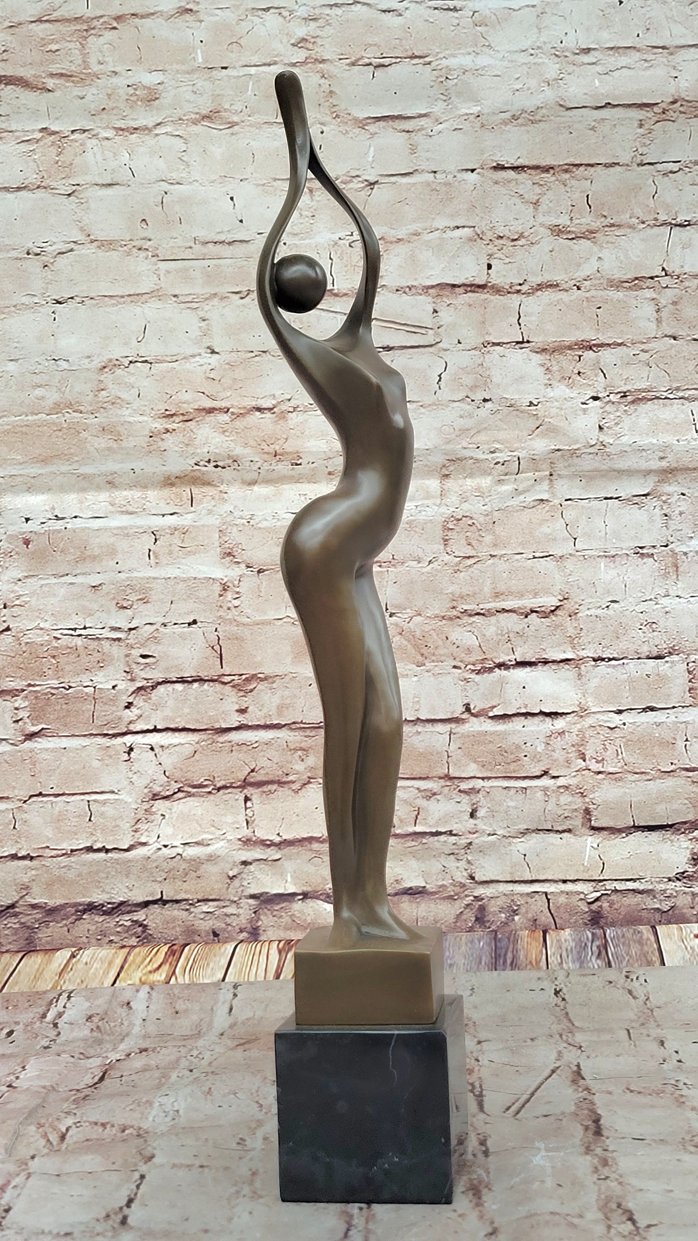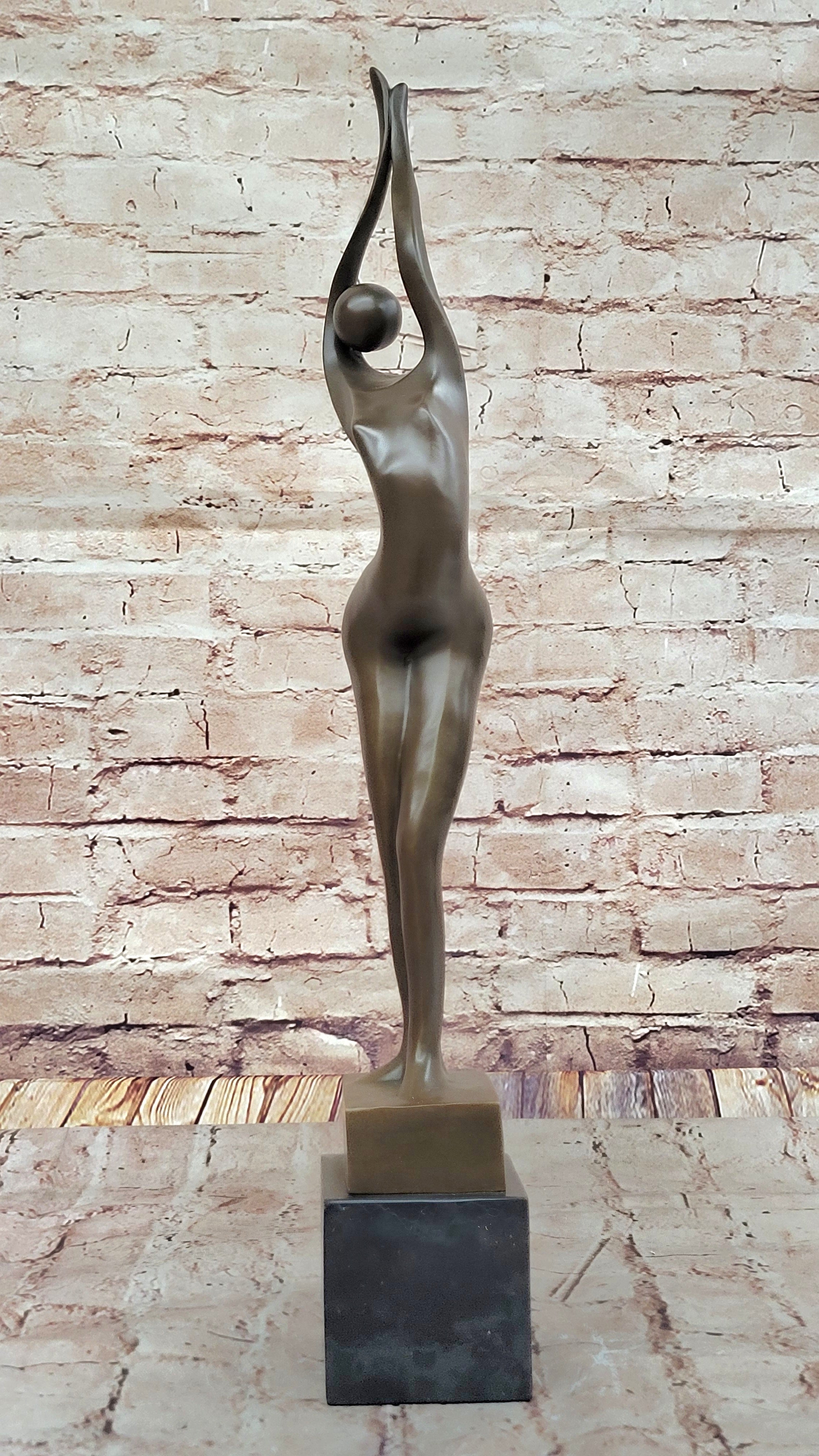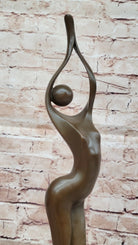 This exquisite bronze sculpture, meticulously crafted by hand using the lost wax method, showcases a modern abstract design. The artwork portrays a captivating female figure in an outstretched position, with her head detached from her body in an unconventional manner. The enticing curves of her body create an alluring asymmetrical spiral pattern, evoking a sense of intrigue. One can interpret this sculpture as a representation of a yoga pose, reflecting strength and grace.