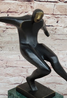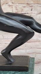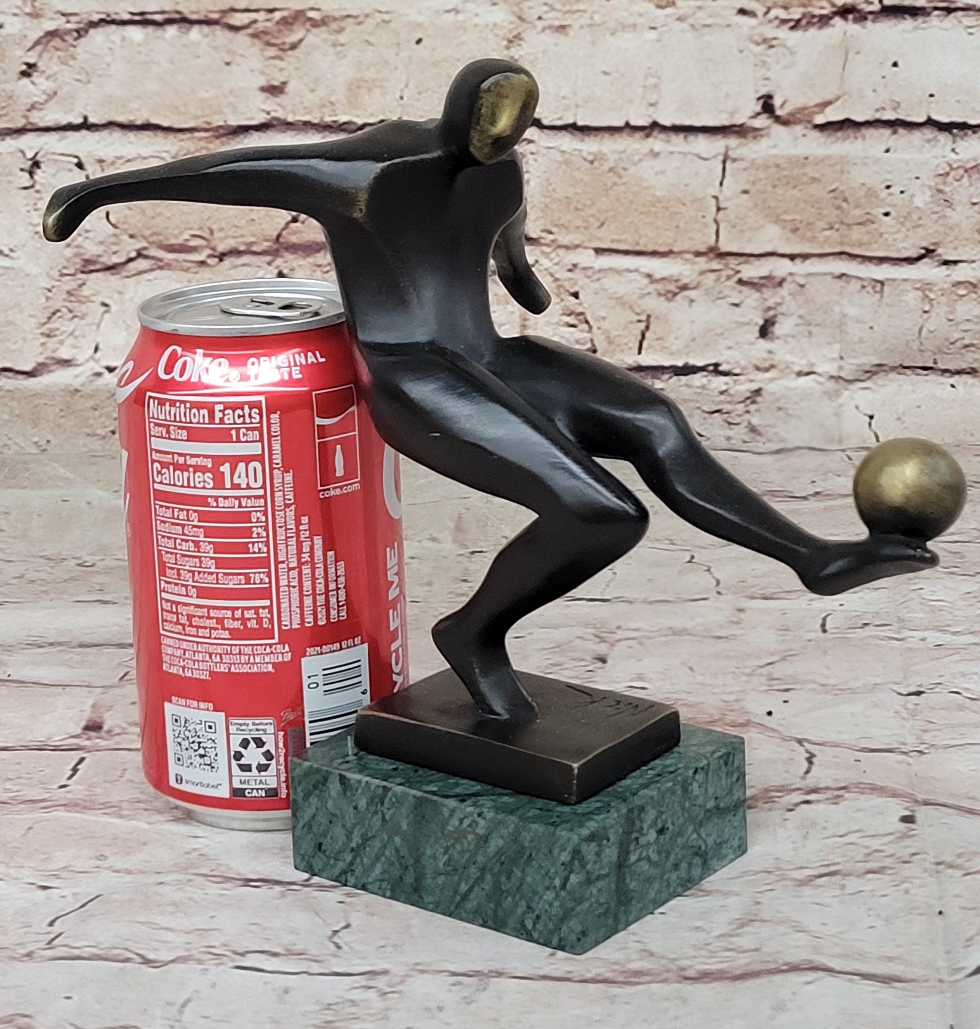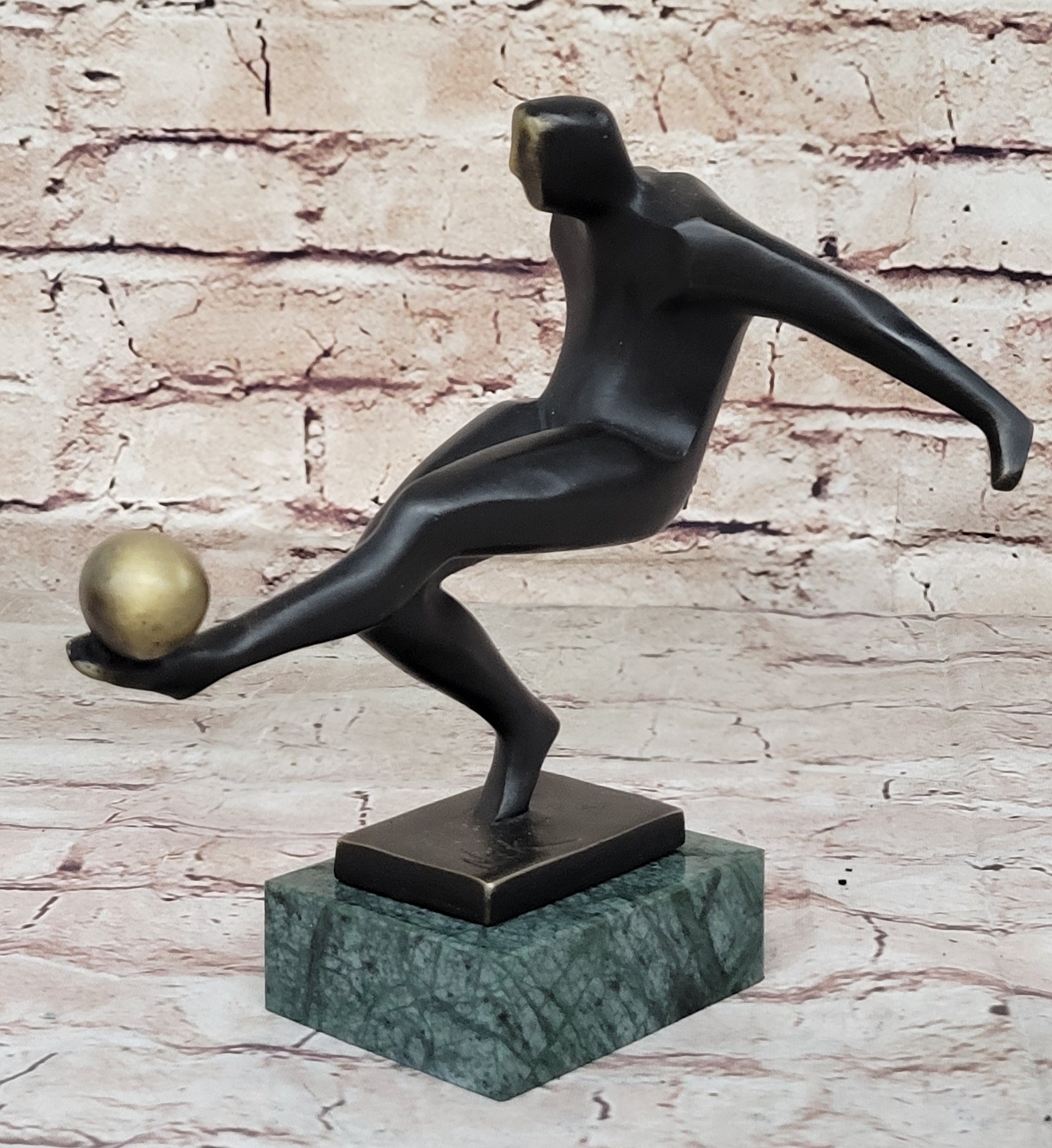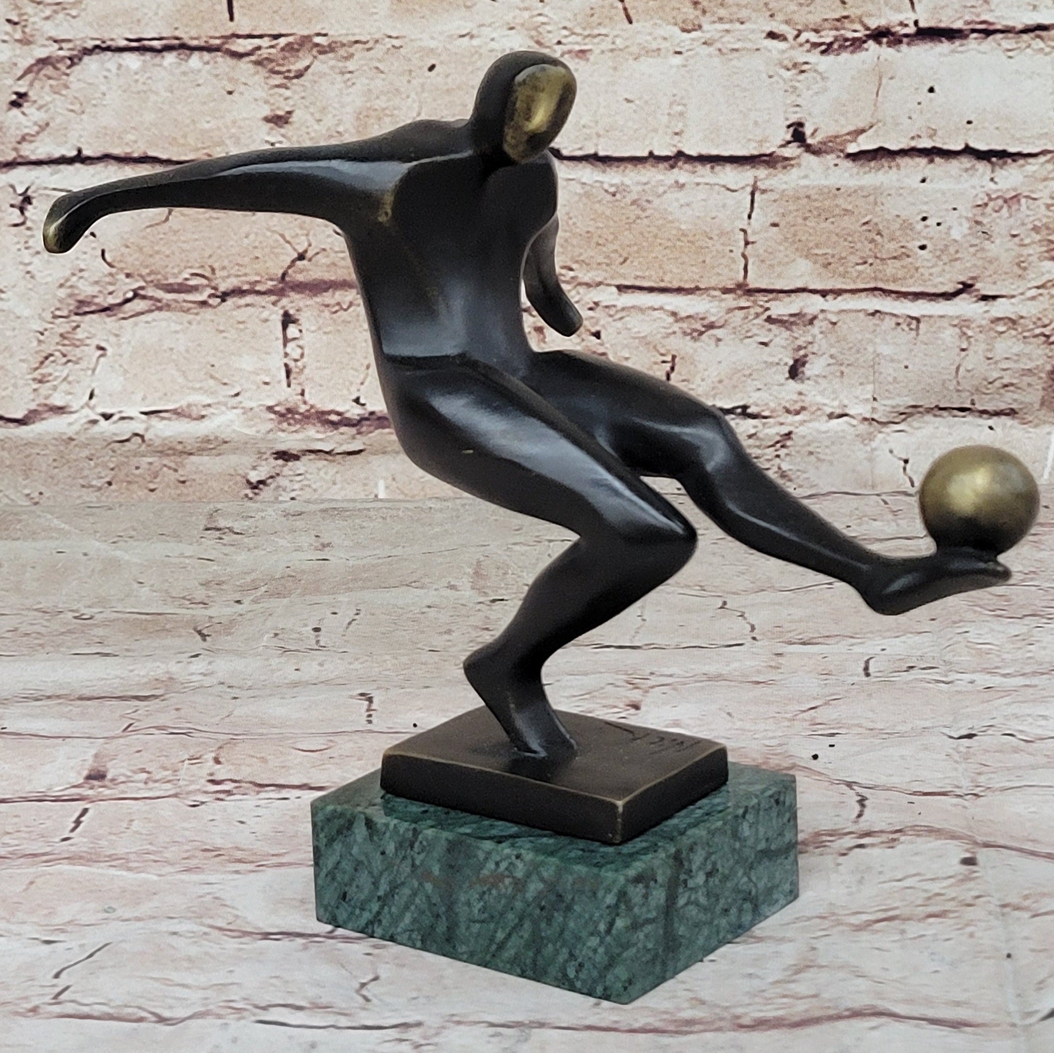 Crafted with meticulous attention to detail, this sculpture is a testament to the artistry and craftsmanship of the sculptor, Nick. Made from 100% bronze and crafted using the revered "Lost Wax Method," the sculpture boasts a dark brown patina finish that enhances its visual impact. Mounted on a green marble base and signed by the artist, it is not only a stunning work of art but also a fitting tribute to the spirit of soccer that inspires players and fans alike.Bronze Dimensions with Marble Base: Height 7.5" X Width 8"