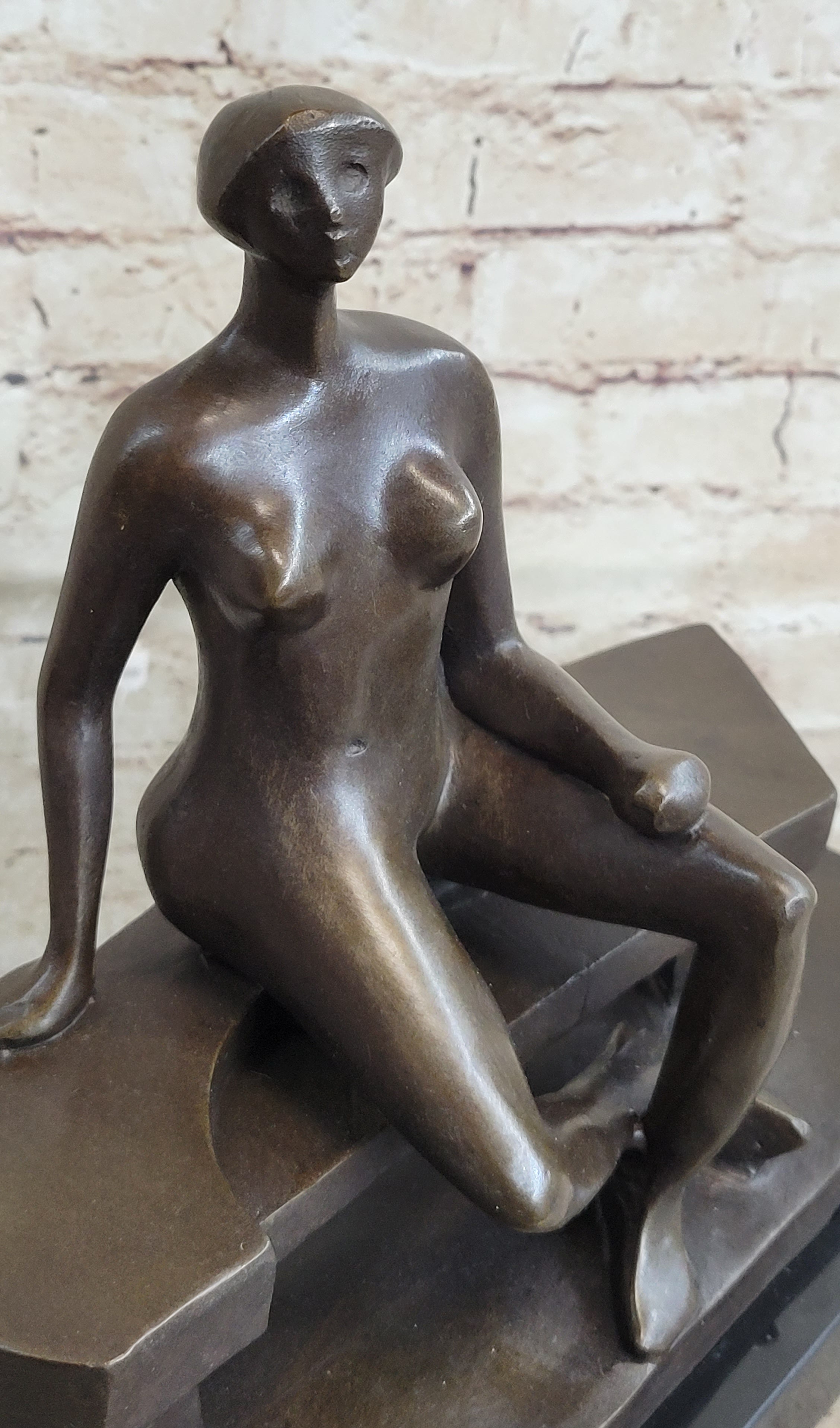 Crafted using the lost-wax method of casting, this sculpture attains a level of precision that allows the molten precious metal to mold to the smallest details of the artist's cast. The result is a masterpiece that showcases fantastic detail, particularly evident in the folds of skin on her stomach, neck, and mouth. The use of 100% bronze with a brown patina finish adds richness and depth to the sculpture, while the black marble base provides a solid foundation for the artwork.
