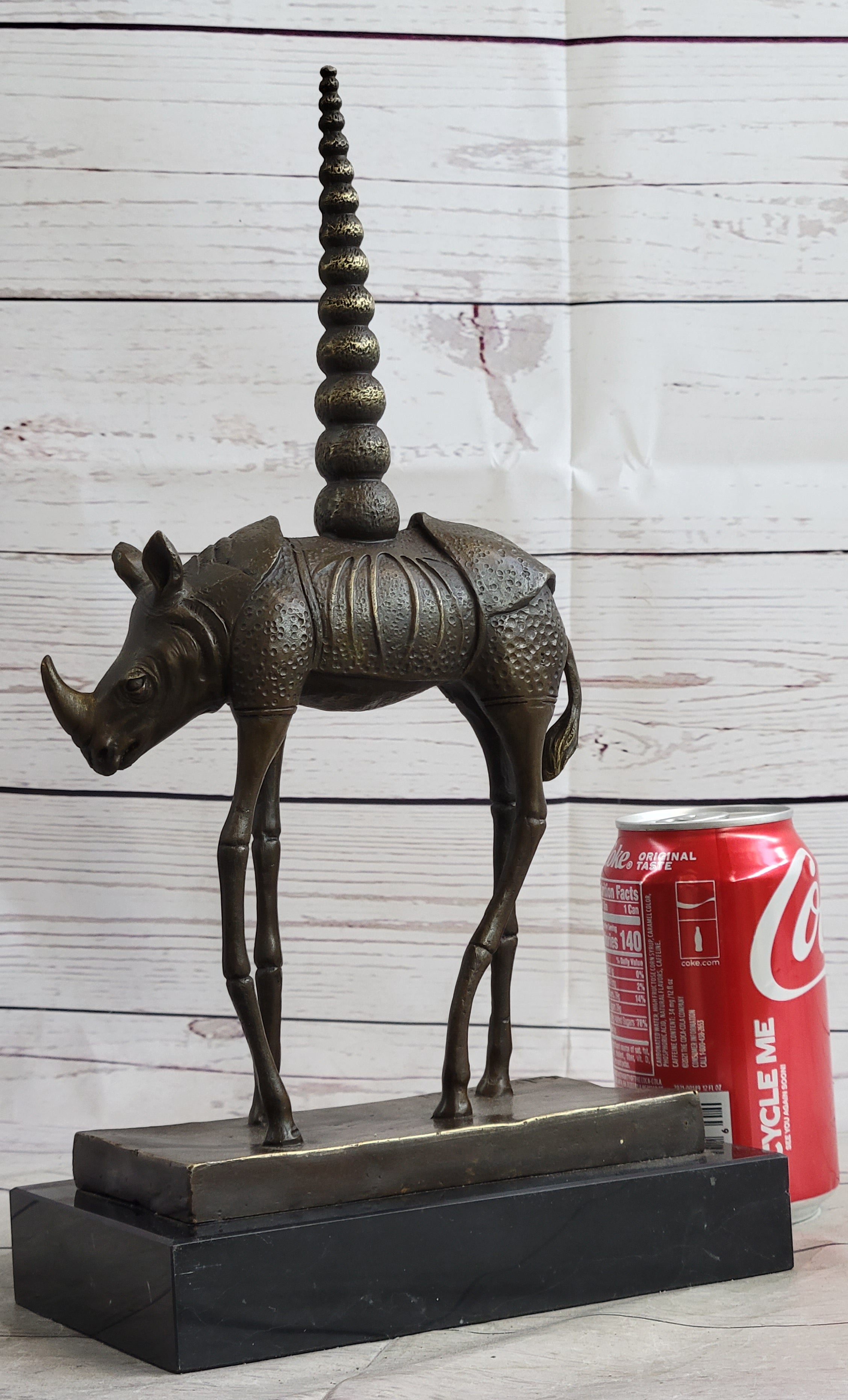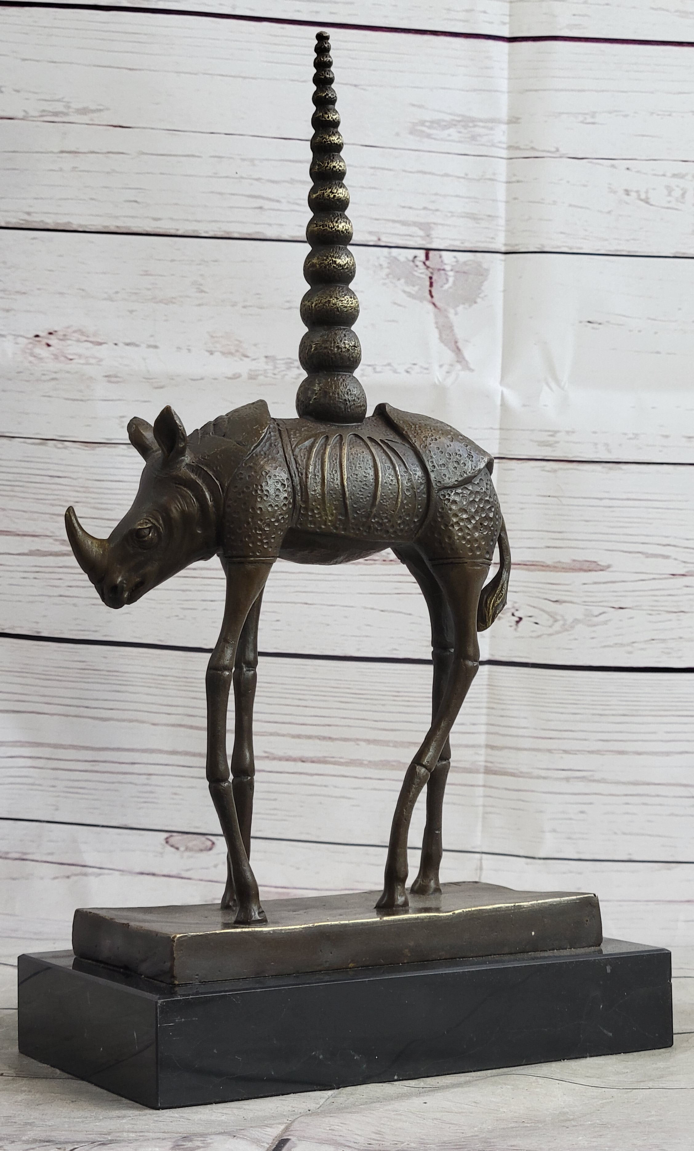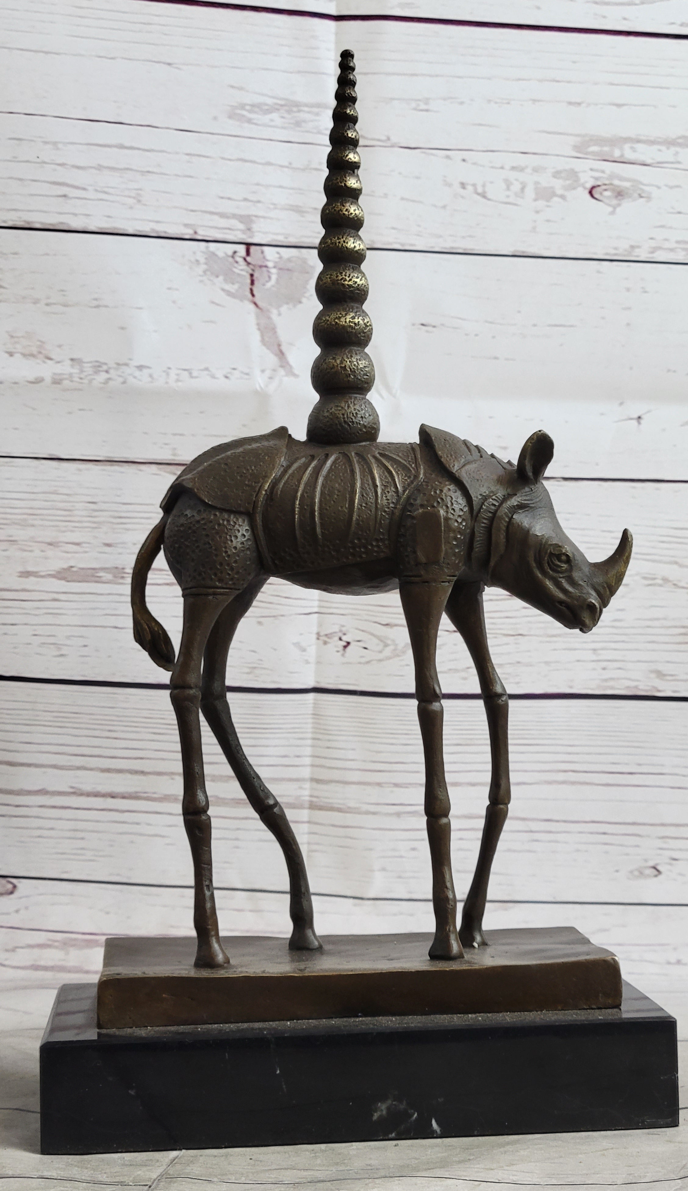 Cast using the traditional "lost-wax" method and mounted on a sturdy base, this sculpture is a true work of art that will add a touch of surrealism to any home or office décor. Whether you're a collector of modern art or simply appreciate the beauty of Dalí's vision, this Cosmic Rhinoceros sculpture is sure to impress.Bronze Dimensions with Marble Base: Height 13.5" X Width 7.5"