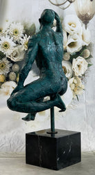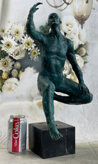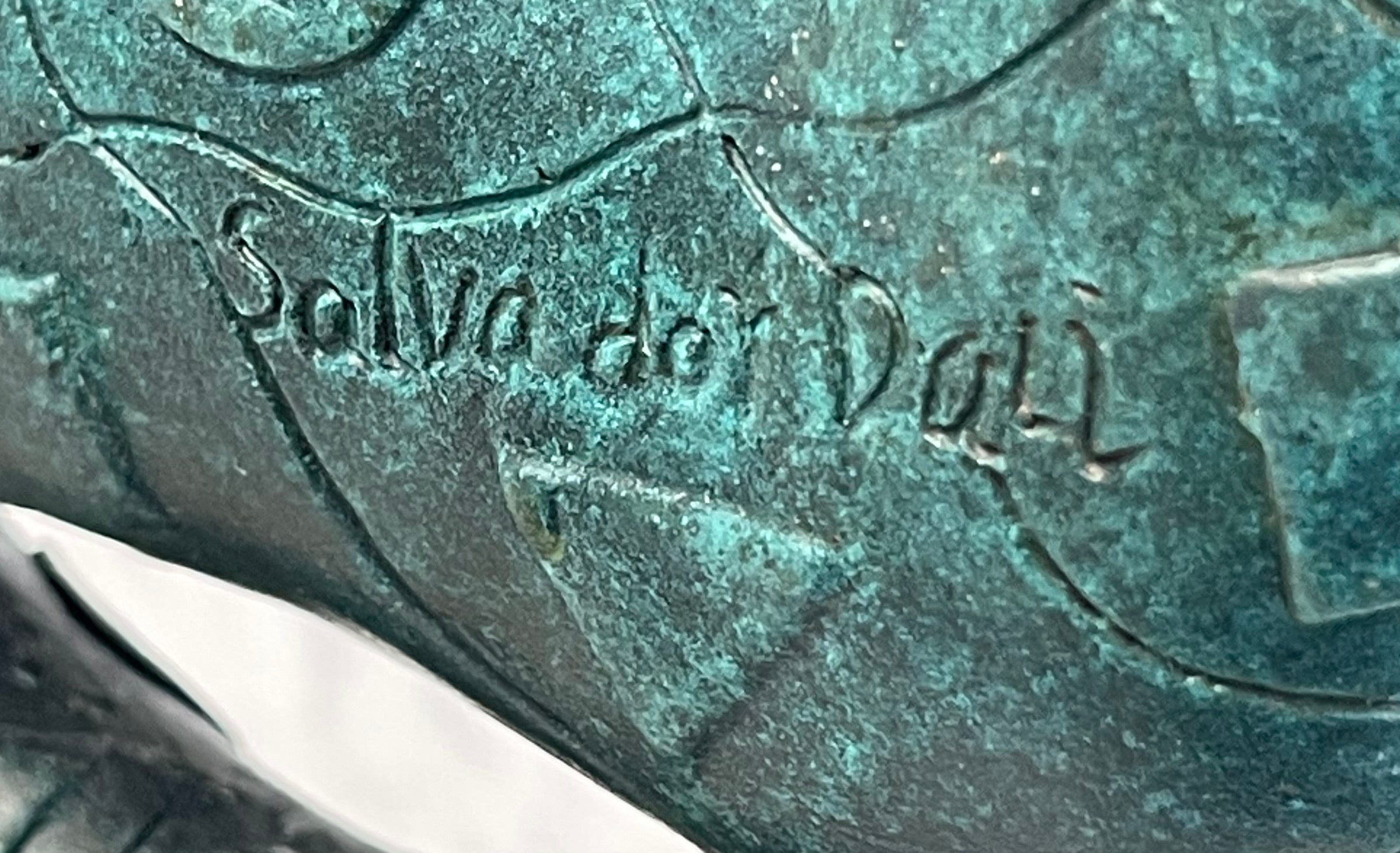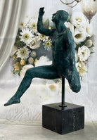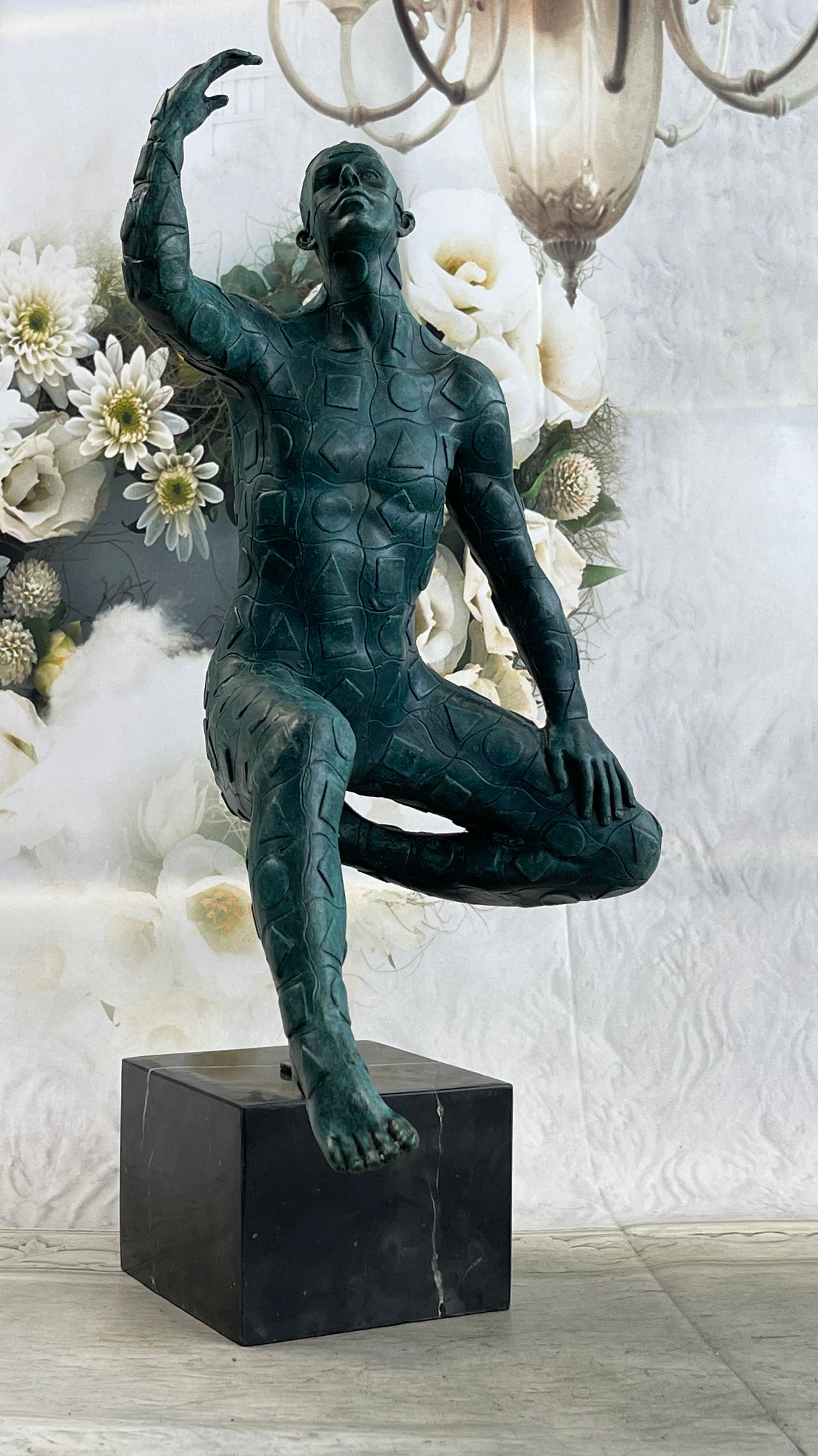 This abstract is a very odd and creative one, I guarantee you that you will have people talking about it. You can tell its a figure of a man suspended in air wearing a Geometric design outfit , but the conversation on it will be mostly about how strange art its working its way through. He has an really fit body and his legs seem to be muscular, as that was the artist intentions. He does seem posing for camera and the rest of his body is made of different little shapes to imagine what your body actually looks like under skin. The sculpture was cast using the ancient old "Lost Wax Method" stained in green patina. 100% handmade and 100% bronze, mounted atop a black marble base and signed Salvador Dali.Bronze Dimensions with Marble Base:Height 19" X Width 15"