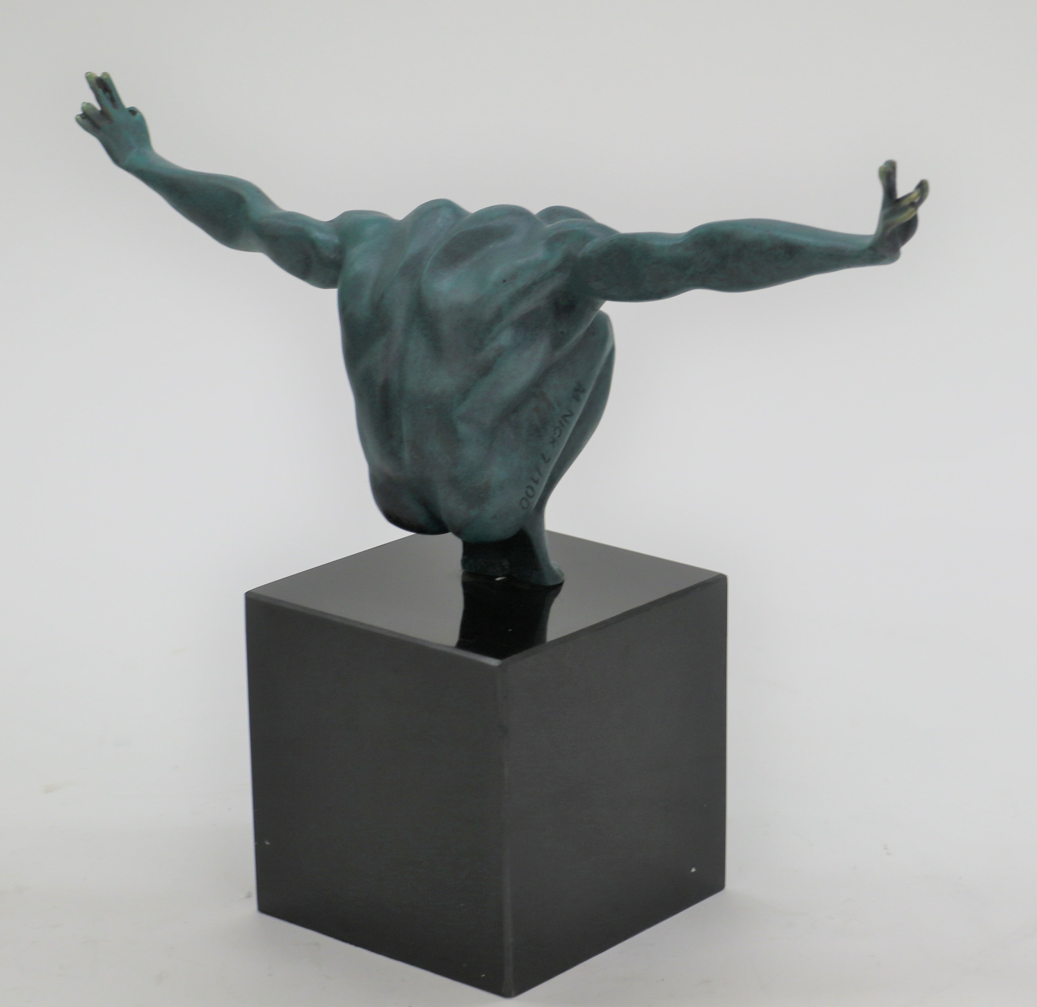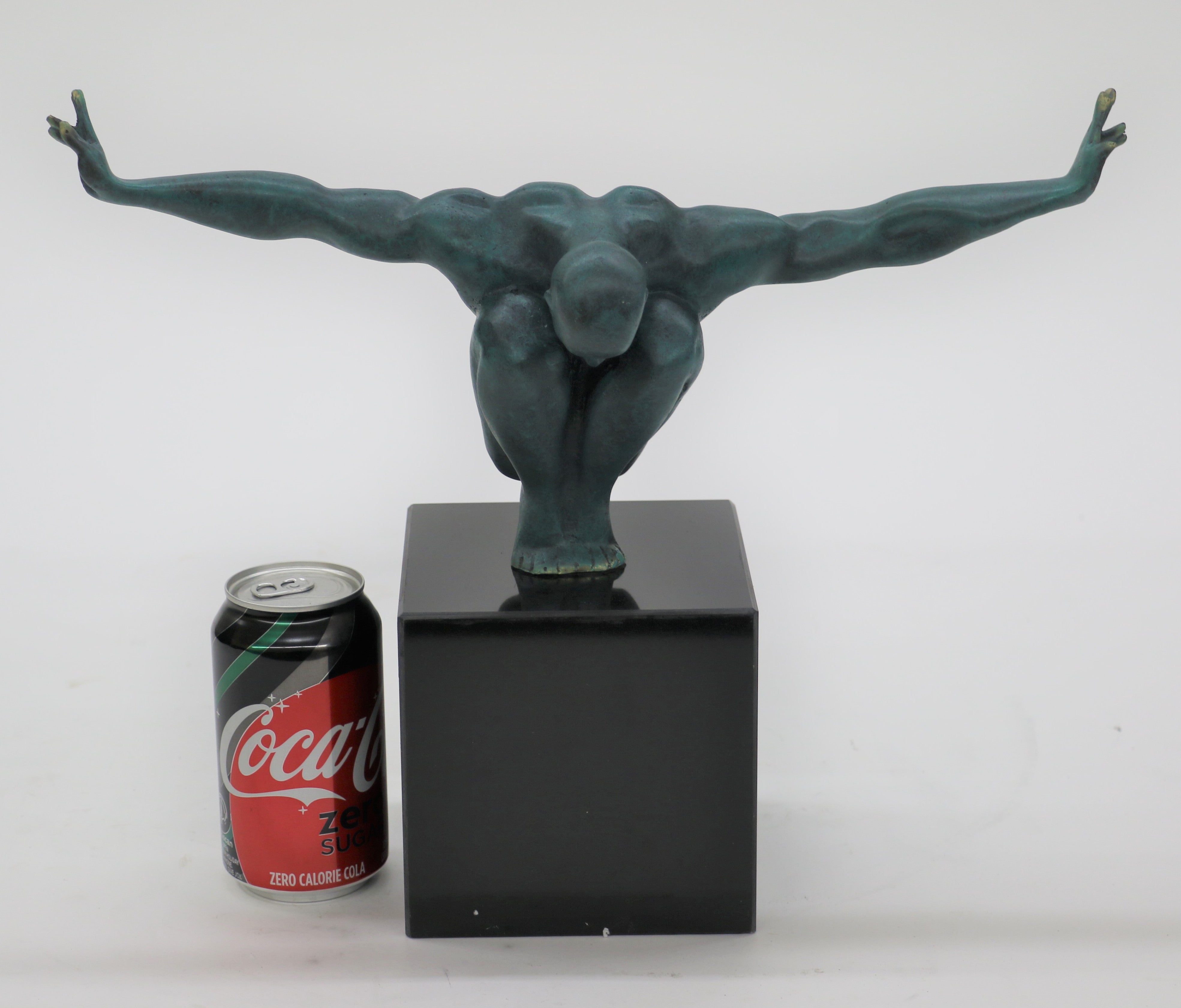 The Limited Edition bronze sculpture „The Athlete“ by Mario Nick originates from a diverse and popular using of this motif. The figure shows a sportsman, whose muscles were extremely detailed elaborated. In crouching position he finds the right stance for concentrating. The shining glance of bronze highlights the contours of the art object and the strands of muscles of the athlete. The arms are stretched and the fingers are lightly spread to the top. In this position the sportsman wants to find his internal ease to perform records with all strengths. This figure was made of 100 per cent finest bronze and signed and numbered by artist M.Nick.Bronze Dimensions with Marble Base:Height 12.5" x Width 15.5"