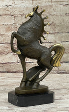 With a seamless blend of history and modernity, the "Signed Original Miguel Lopez Tang Horse Abstract Modern Bronze Sculpture" is a remarkable creation. Through the meticulous lost wax technique, the sculpture pays homage to the Tang dynasty's equestrian art while embracing contemporary abstraction. The sculpture's fluid lines and dynamic form breathe life into the iconic Tang Horse, capturing its essence in enduring bronze. Poised on a sleek black marble base, the sculpture's visual contrast is striking, drawing attention to its remarkable presence. Adorned with a timeless green patina and delicate gold accents, the sculpture emanates an aura of sophistication and craftsmanship. Marked with the signature "Milo," it stands as a testament to the artist's mastery and vision, inviting viewers to engage with the harmonious blend of tradition and modernity captured within its form.Bronze Dimensions with Marble Base: Height 11" X Width 8"