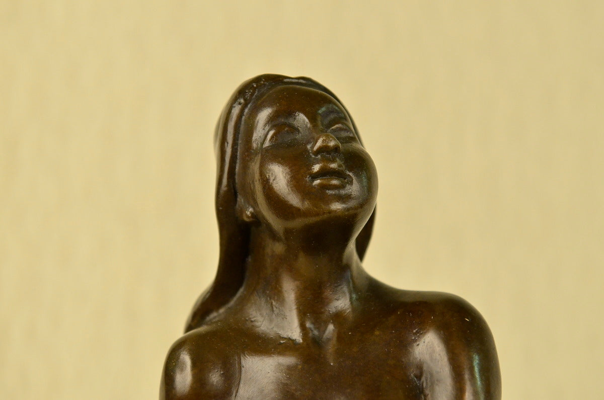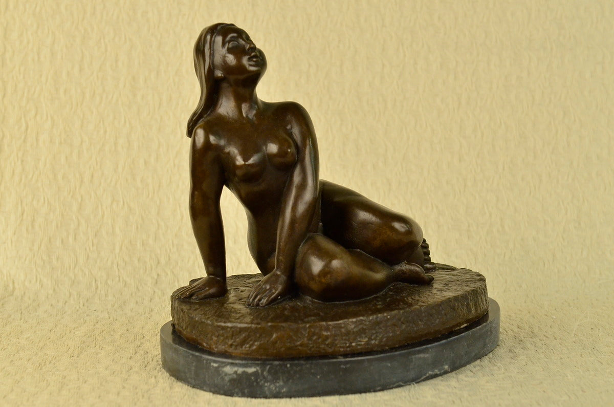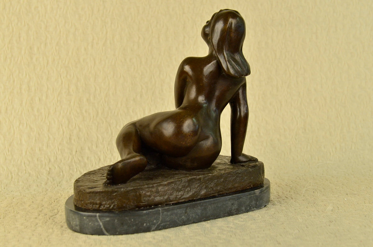 An abstract nude female sculpture a tribute to Botero. You can just tell this is a powerful statement in the world of artist. This wonderfully curvaceous woman bears the wide hips commonly attributed to femininity and fertility. It is a 100% bronze, cast using the lost wax method. It stands tall on a black marble base. This sculpture is signed by Milo.Bronze Dimensions With Marble Base:Height 12" X Width 12"