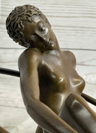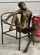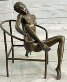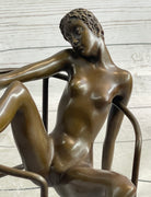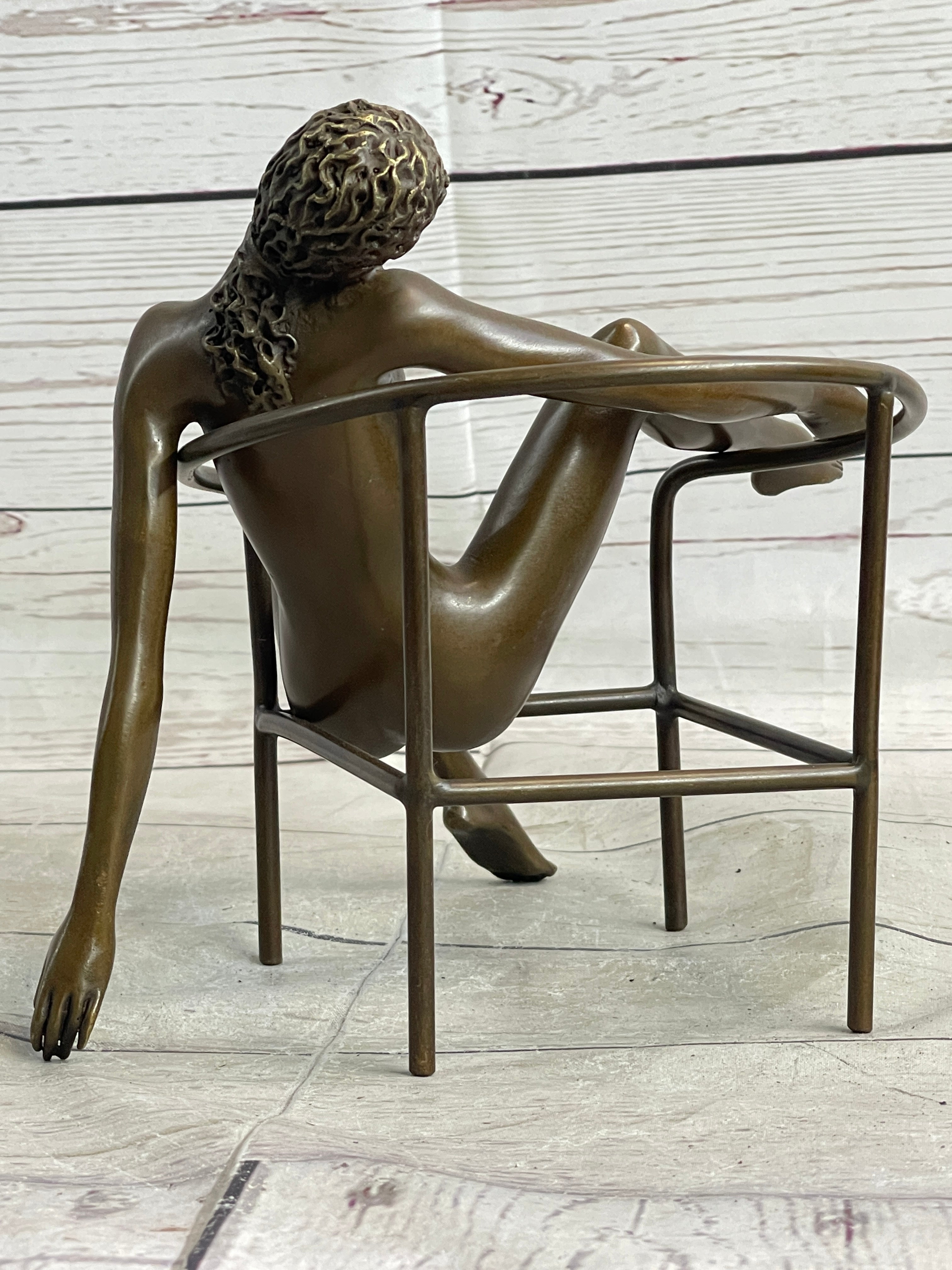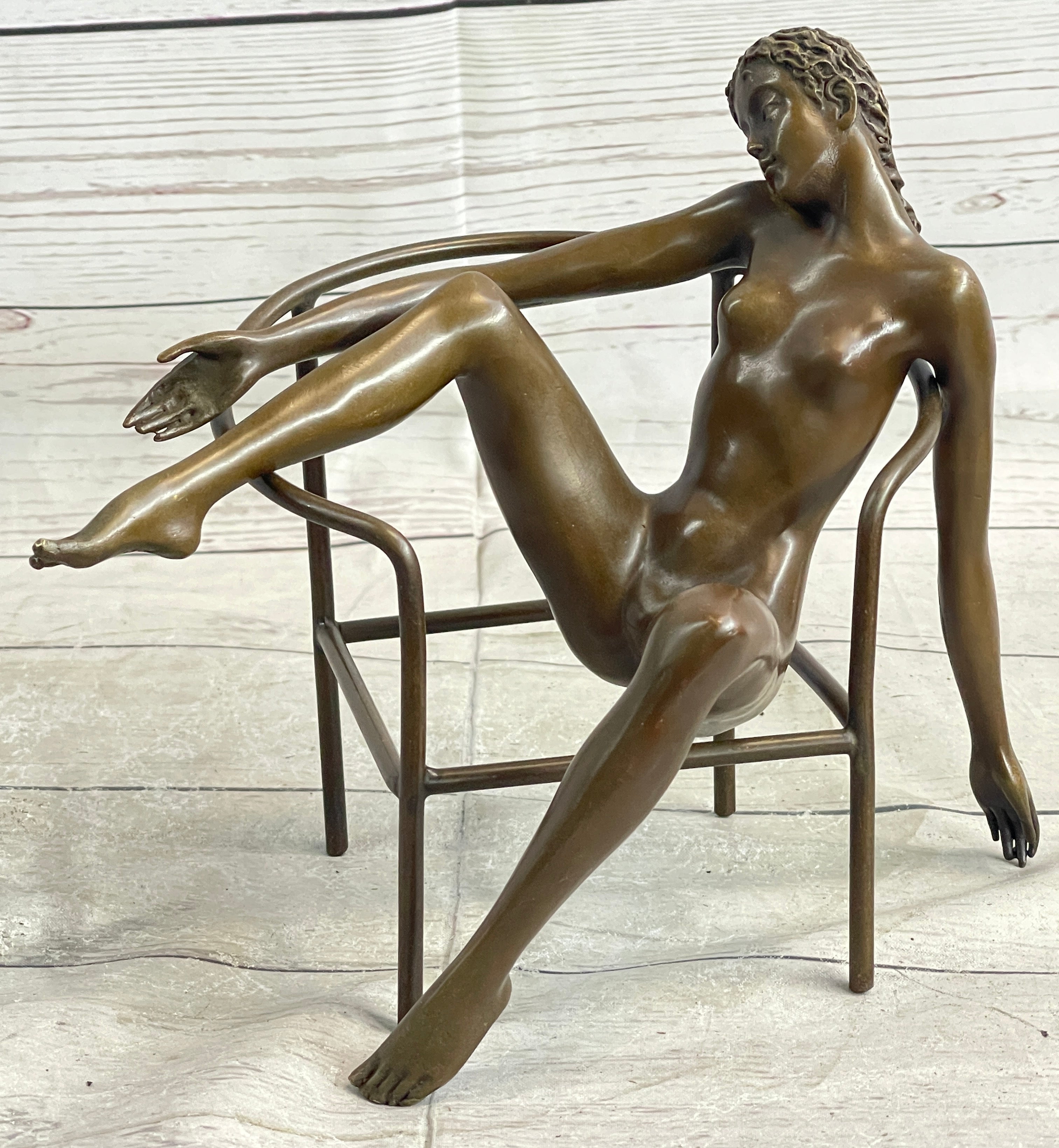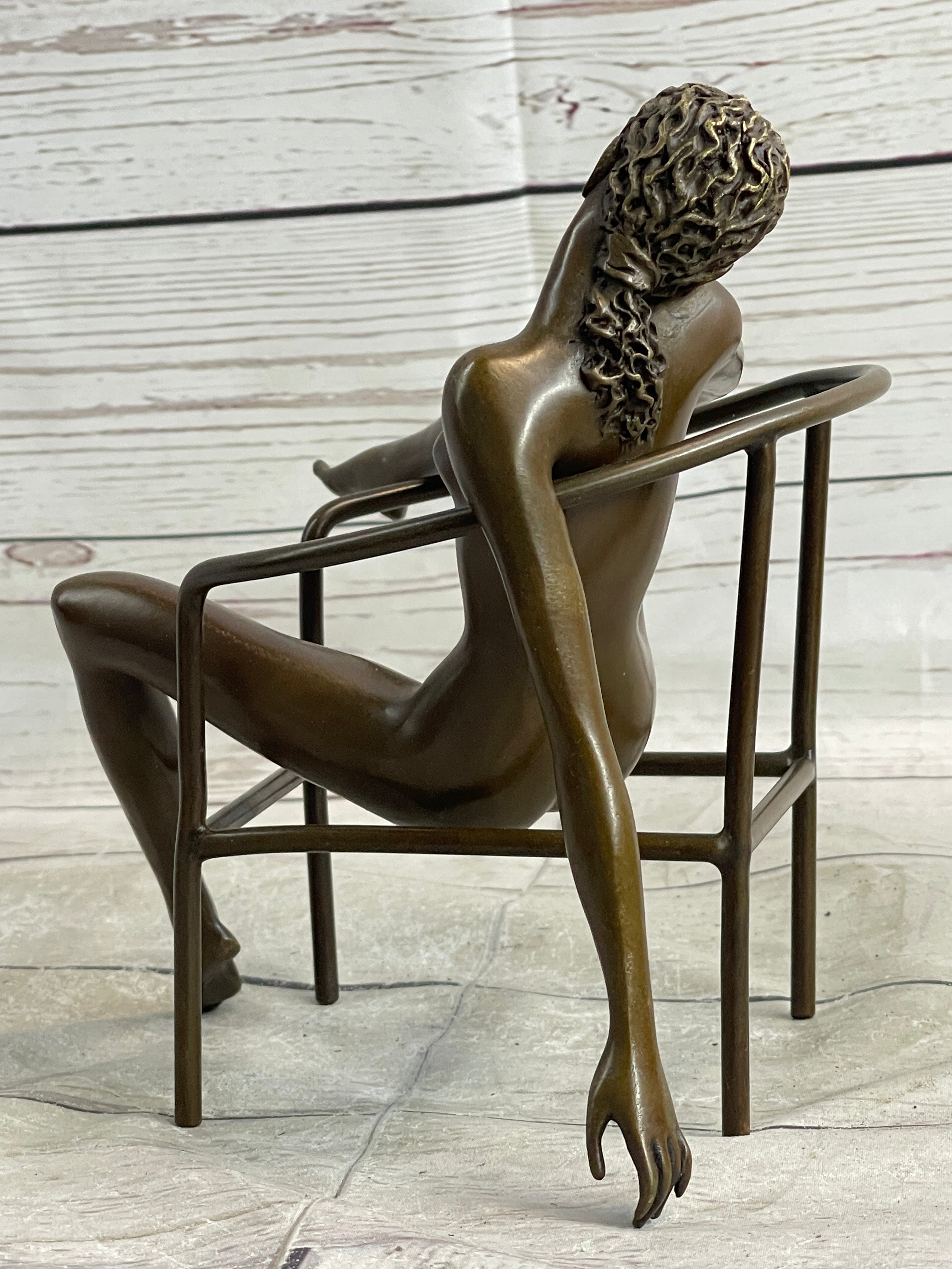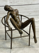 Immerse yourself in the captivating beauty of this bronze sculpture that portrays a woman in a profound slumber. Resting on a beech chair, she exudes a radiant glow as the sunlight delicately illuminates her nude body. With grace and tranquility, she removes her bowed top, revealing her breasts with a sense of liberation. Her gaze fixed on the horizon, her expression remains composed, and her flowing hair frames her face, adding to the ethereal atmosphere.
