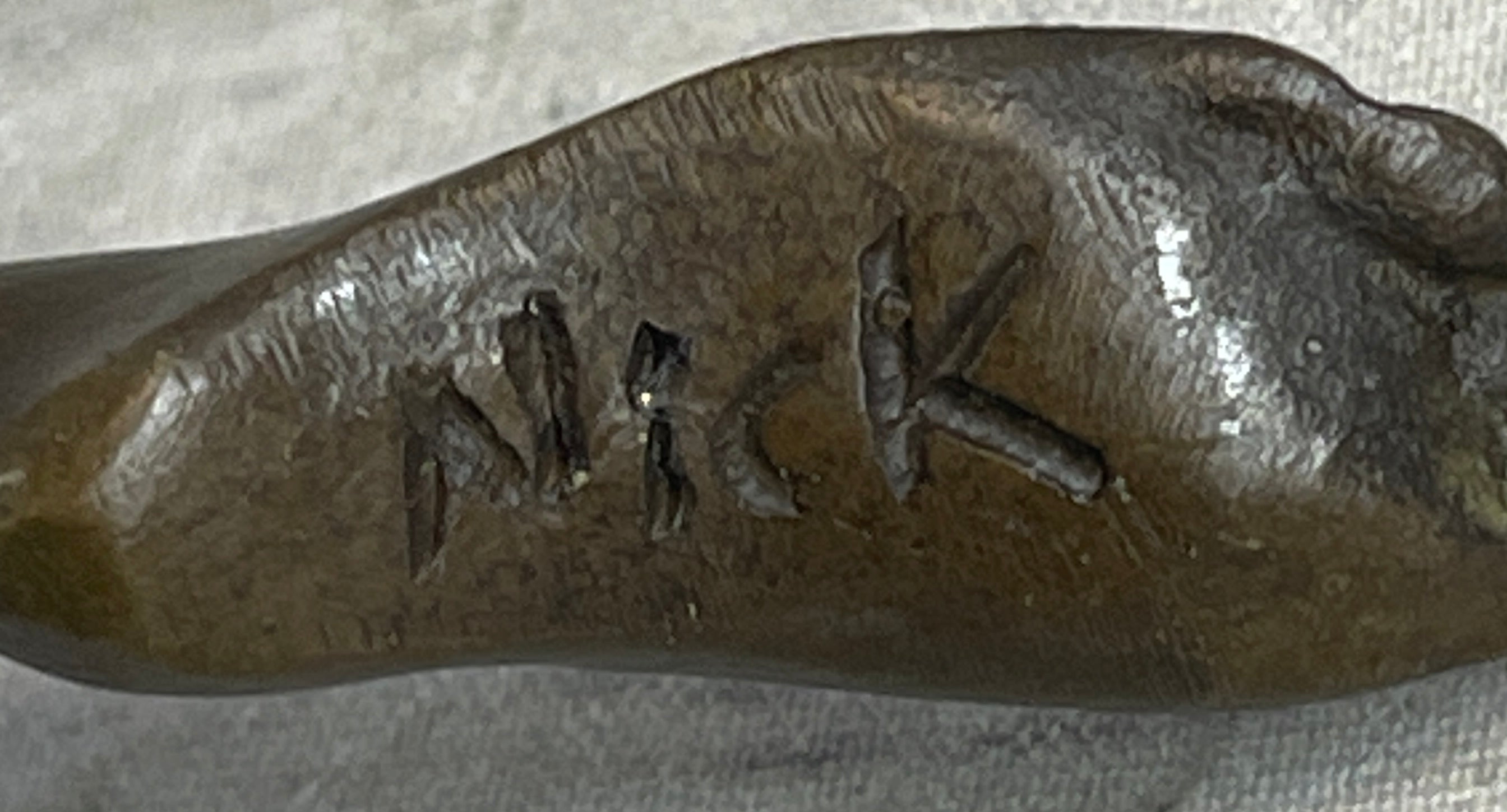 Every aspect of this sculpture exudes exceptional craftsmanship. It is painstakingly handmade and composed entirely of bronze, reflecting the artist's dedication and skill. A testament to its authenticity, the sculpture proudly bears the signature of the talented artist, Nick. This remarkable piece of art captures the profound emotions and timeless beauty of the human form, making it a truly remarkable addition to any collection or space.Bronze Dimensions: Height 8" X 10"